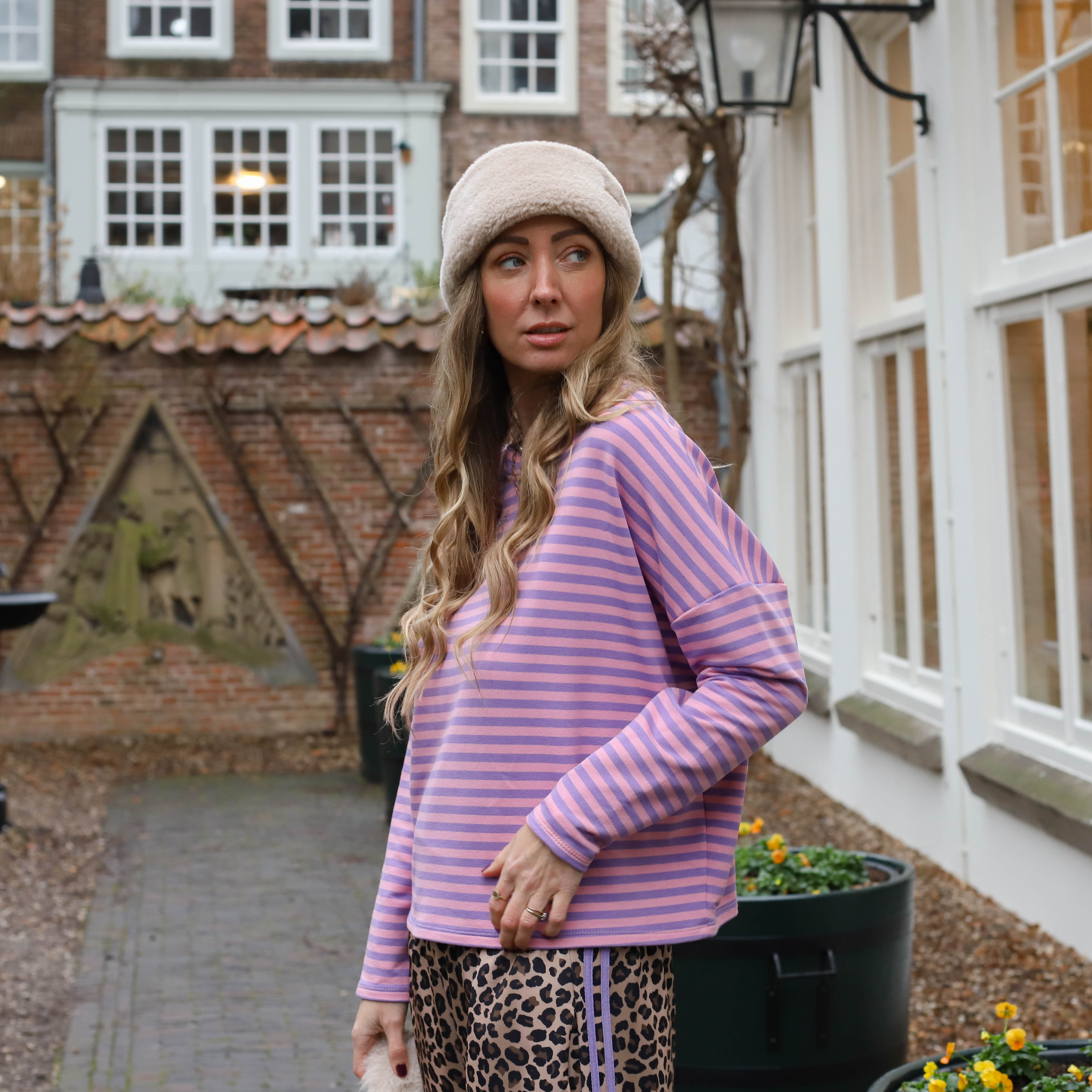 De Billy streep trui is een comfortabele en veelzijdige toevoeging aan je basisgarderobe. Deze trui heeft een klassiek, tijdloos streepdessin in een opvallende combinatie van diep lila en paars. De wijde, casual pasvorm met lange mouwen en een ronde hals zorgt voor een ontspannen en flatterende look. Dankzij de zachte katoenmix is deze trui heerlijk om te dragen. Combineer deze trui eenvoudig met een jeans of een leren broek voor een moeiteloos chique uitstraling.