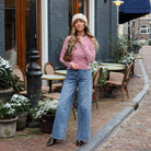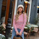 Deze Lexie Streep Top Burgundy is een stijlvol en aansluitend item dat kleur geeft aan je garderobe. De top is uitgevoerd in een diepe burgundy kleur met contrasterende lichtroze strepen, wat zorgt voor een speelse en moderne uitstraling. Het ontwerp heeft een klassieke ronde hals en lange mouwen, gemaakt van een lichte stof die comfortabel aansluit.