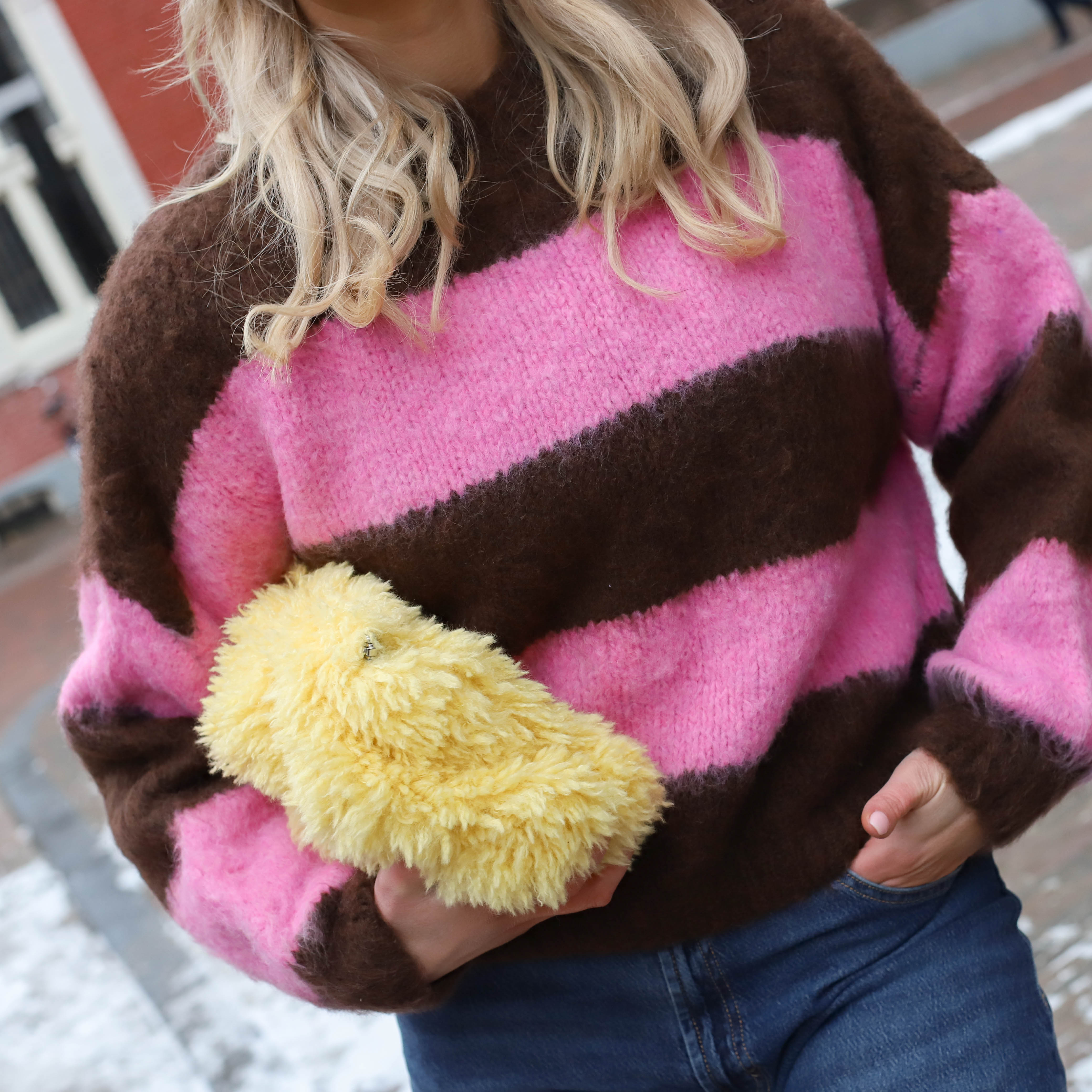 Deze Monica Mohair Knit roze is een heerlijk zachte en warme trui met een trendy, oversized uitstraling. Het item is uitgevoerd in een bruine kleur met brede, roze banen en heeft een opvallende, harige mohair-look textuur. Het ontwerp is voorzien van lange mouwen en een ronde hals, wat zorgt voor een comfortabele en modieuze look voor de koudere dagen.