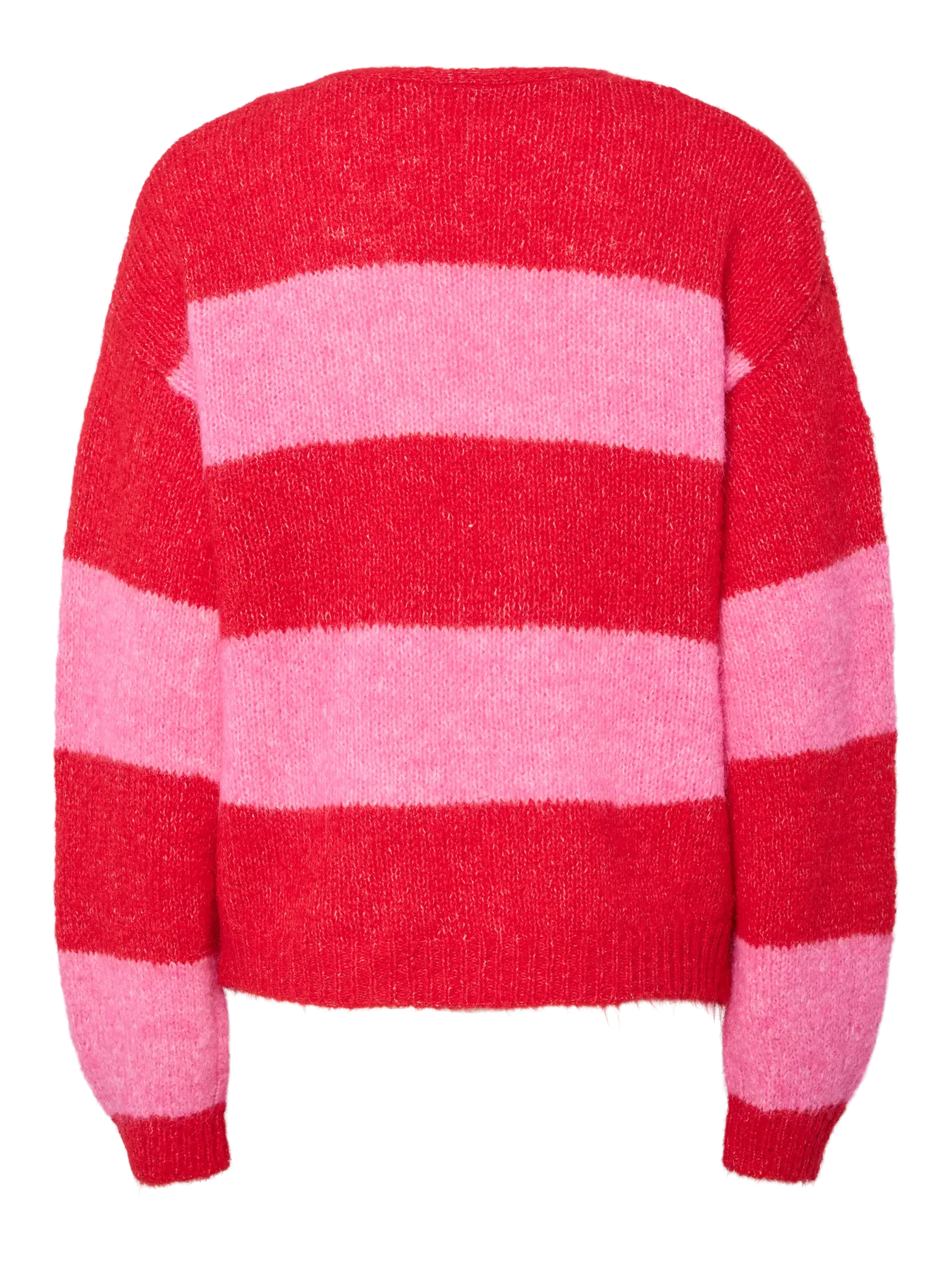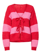 Deze Rasmine Short Tie Cardigan is een zacht en harig gebreid vest. Het vest heeft opvallende horizontale strepen in felrood en lichtroze en is voorzien van twee decoratieve strikdetails aan de voorzijde. Het vest heeft een korte, boxy pasvorm en ruime mouwen.