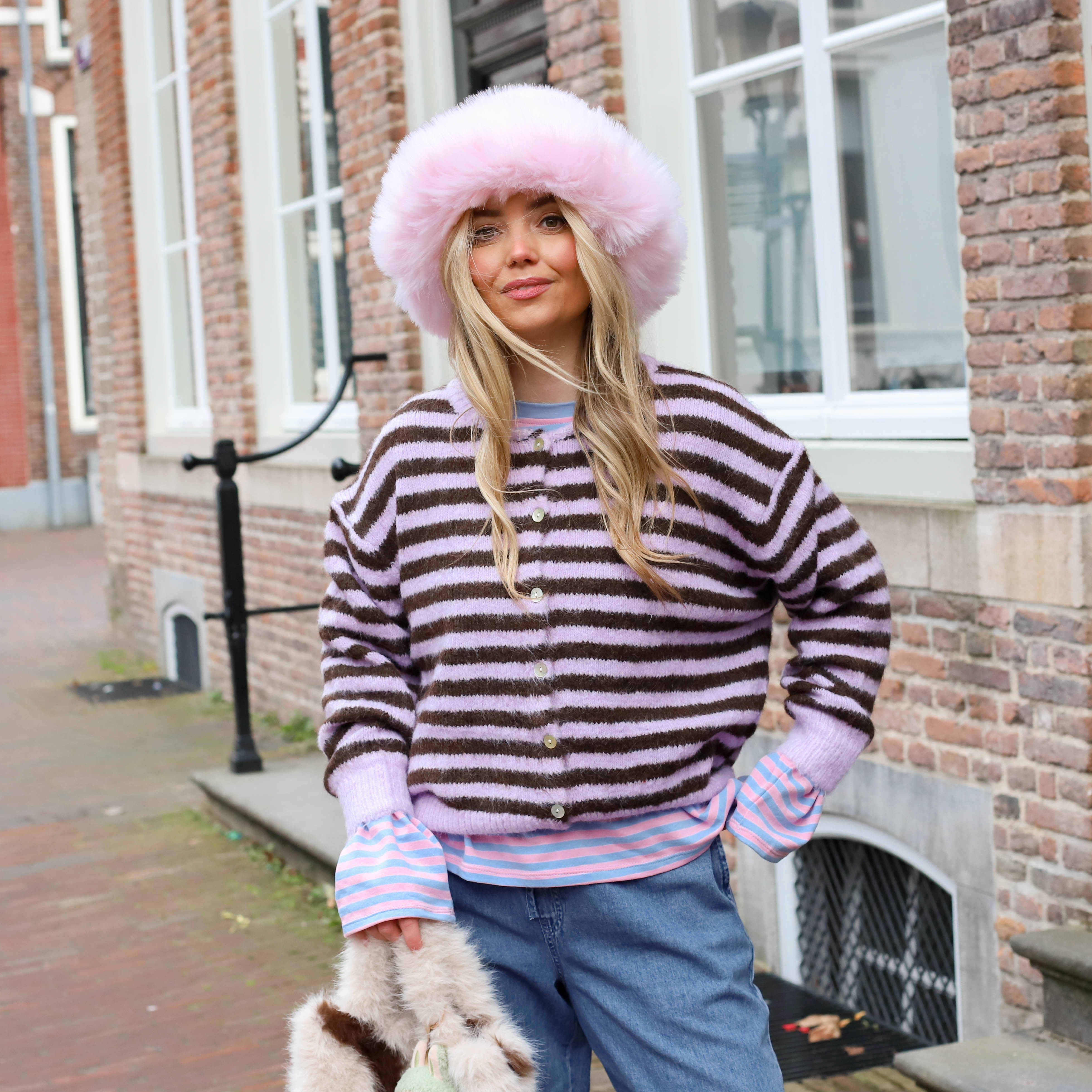Het vest heeft een heerlijk zachte, fluffy textuur en valt direct op door het klassieke streeppatroon en de elegante knoopsluiting. Dankzij de relaxte fit en de fijne wolmix zit dit item niet alleen mega comfy, maar geeft het je outfit ook direct die gewilde on-trend vibe. Ideaal om te layeren over een basic top of te stylen met je favoriete baggy jeans voor een moeiteloze streetwear look.