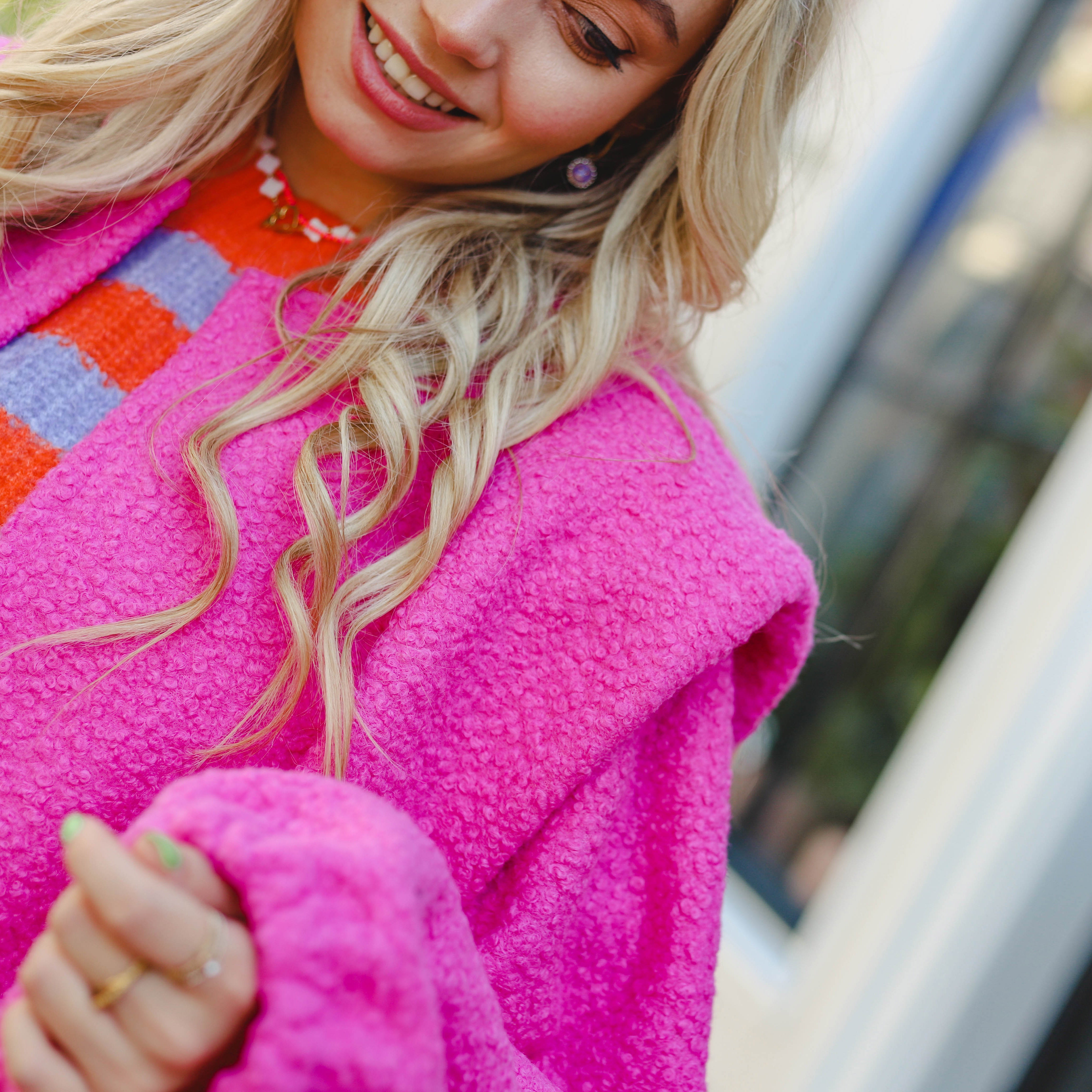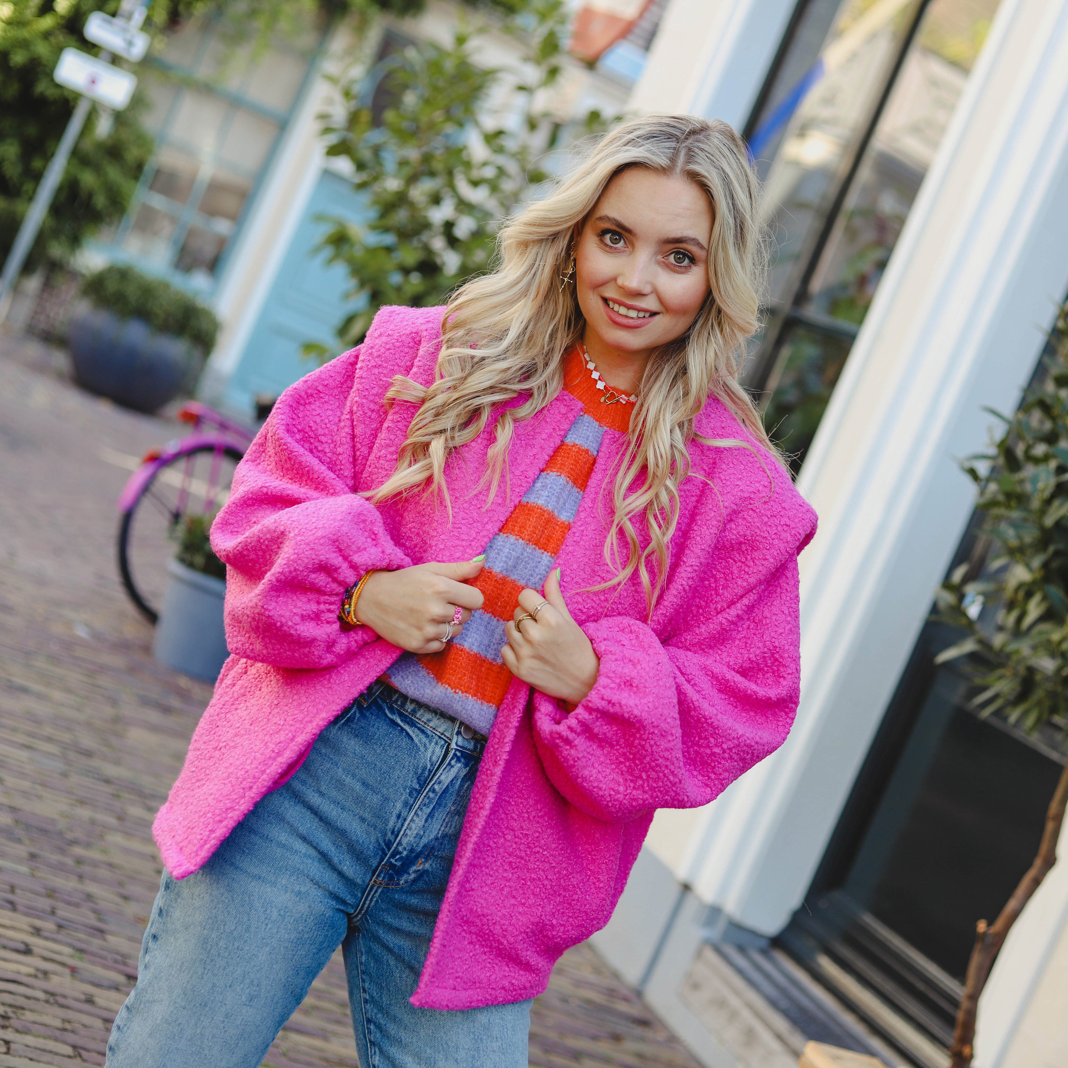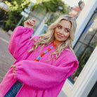 Beautiful teddy coat in fuchsia. The jacket fits wonderfully, has nice details on the shoulder and brightens up any outfit.