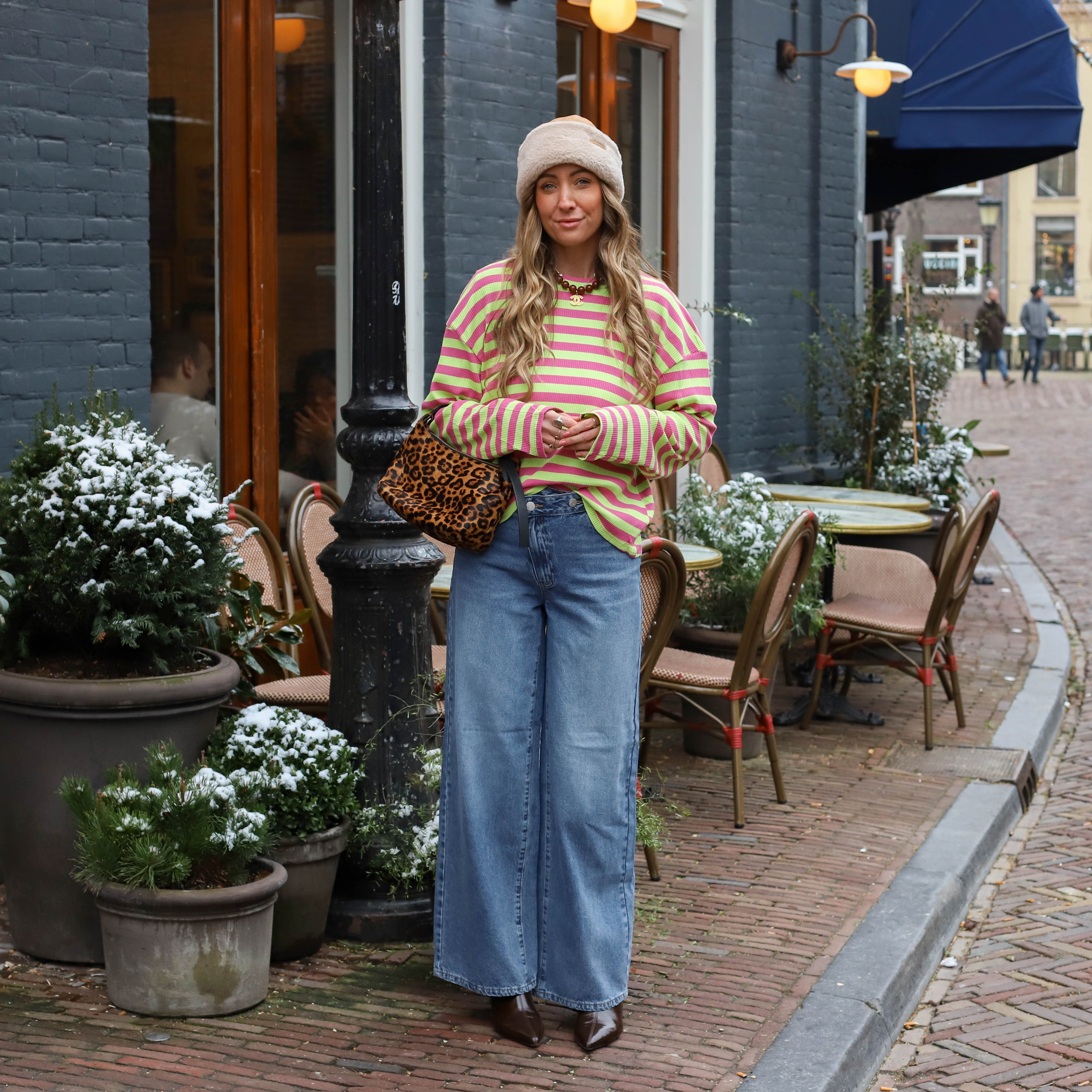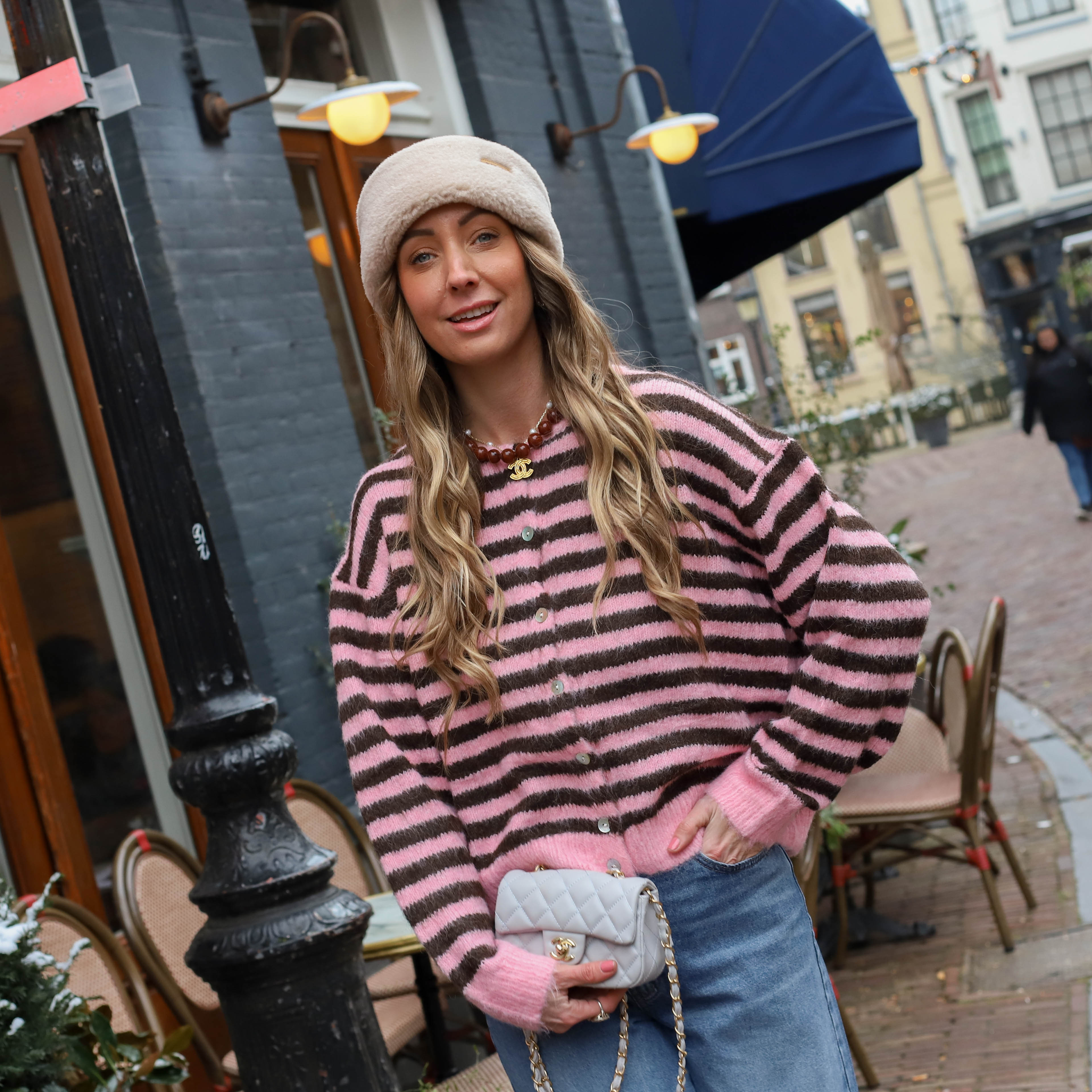 Streep vest knoop Julia roze bruin