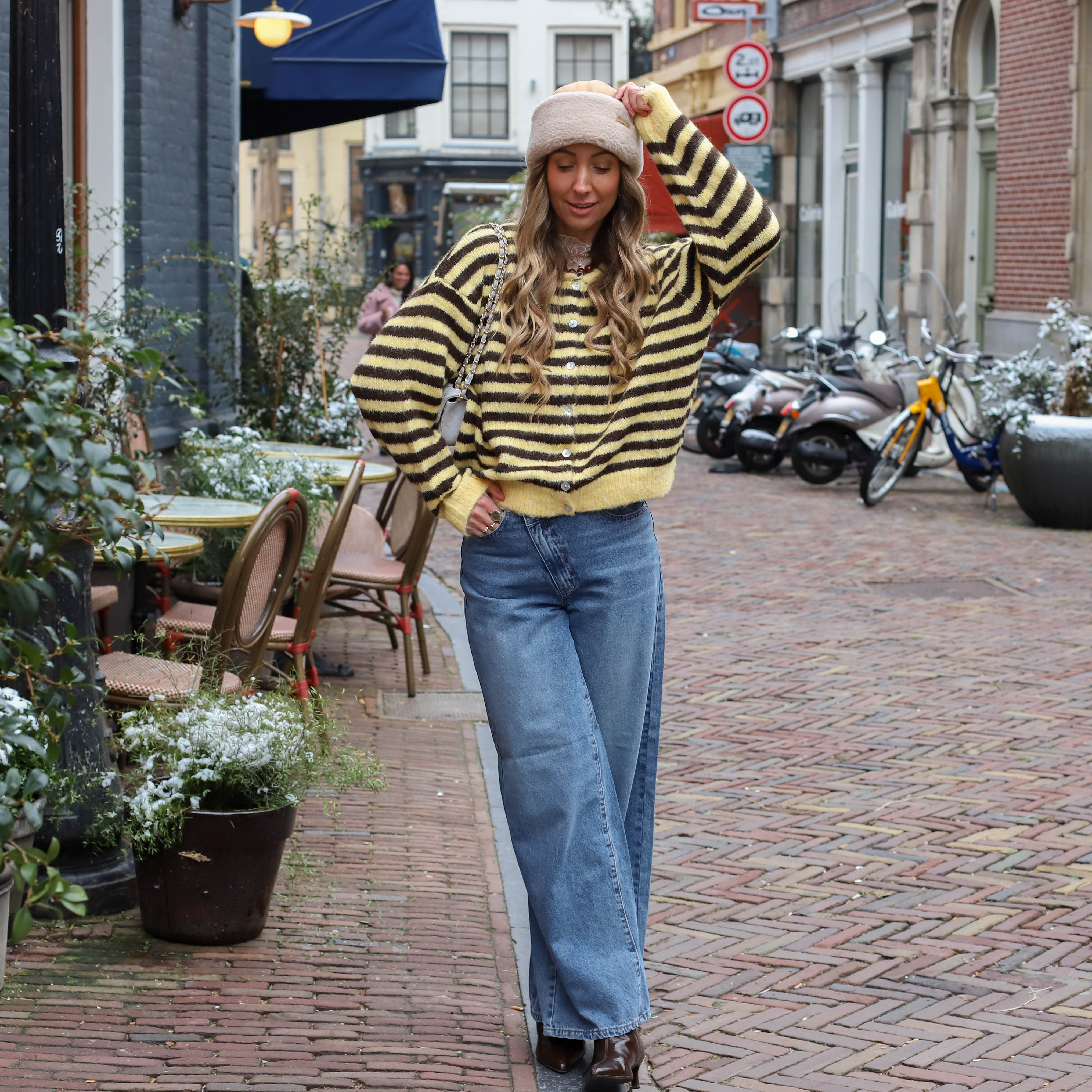 Streep vest knoop Julia geel bruin