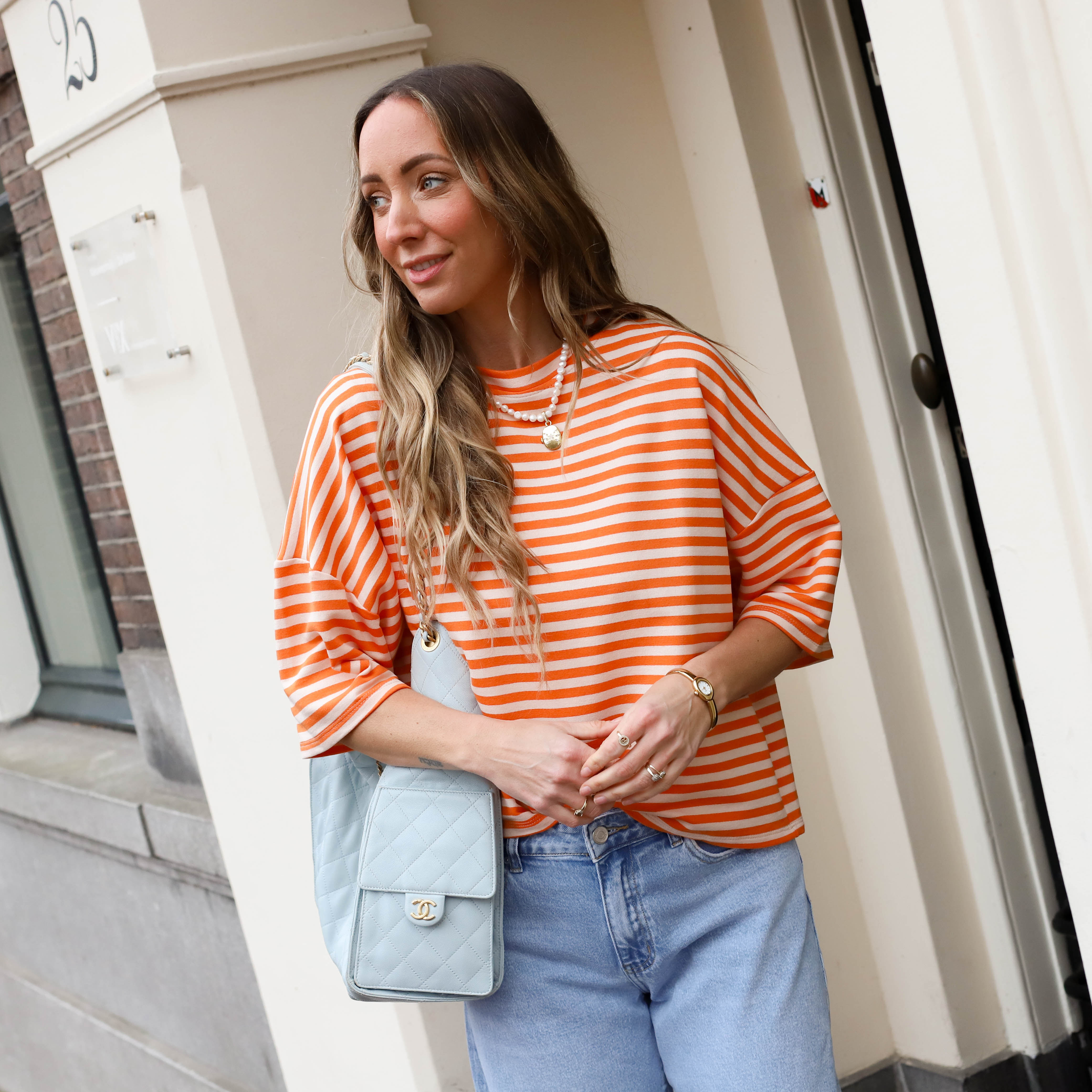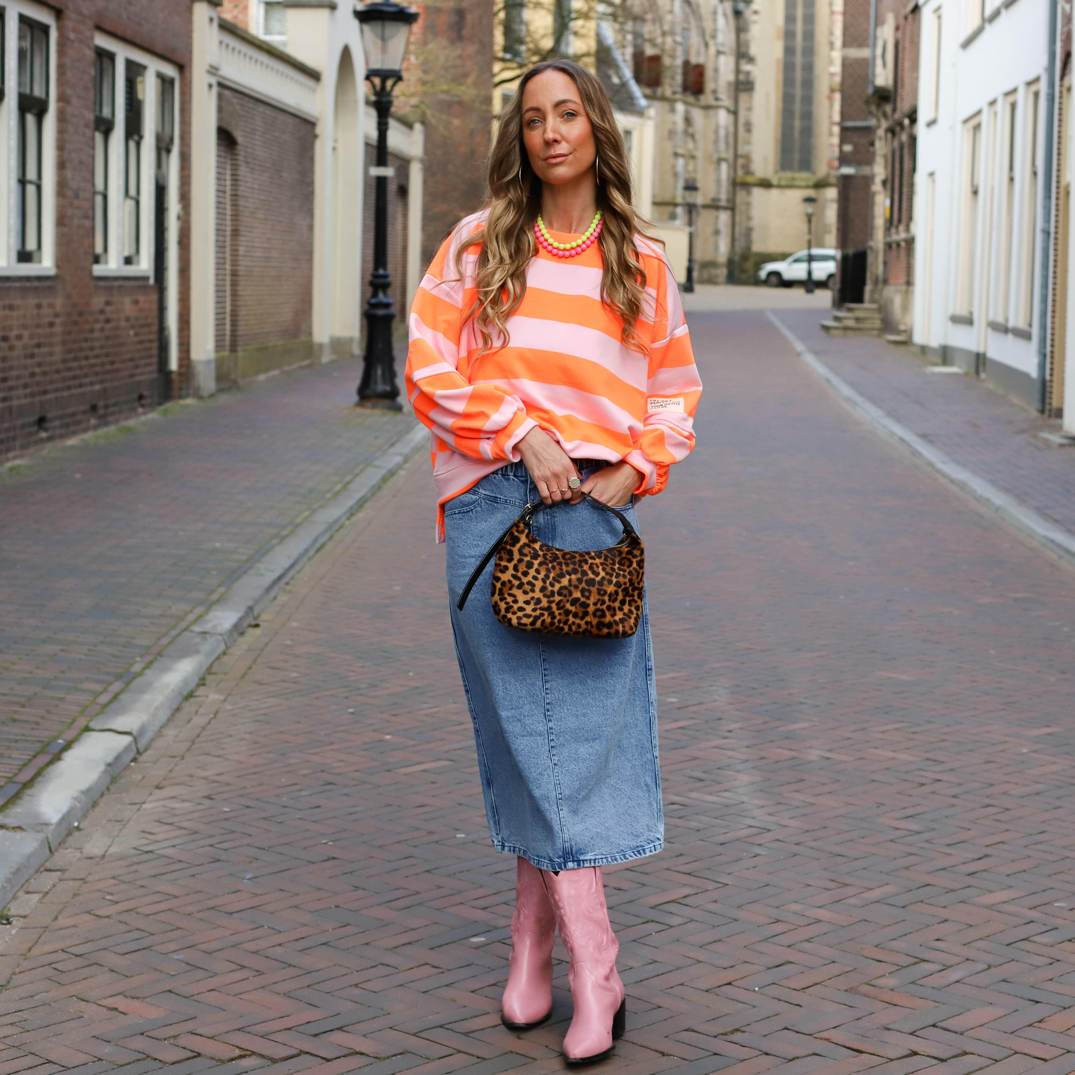 Geblokte sweater korte mouw blokjes cherry oranje roze