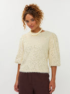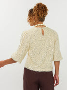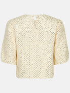 Top Chelsey is een feestelijke blikvanger. De top is rijkelijk versierd met gouden pailletten die zorgen voor een speels en elegant effect bij iedere beweging. Het ontwerp heeft een rechte pasvorm met halflange, iets wijde mouwen en een ronde hals. Achter sluit Chelsey met een kleine knoopsluiting voor een verfijnde afwerking. De mouwlengte is 41 cm en de bodylength is 56 cm bij maat S.