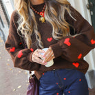 Deze zachte, bruine trui is de perfecte toevoeging aan je garderobe. De trui heeft een ronde hals en is versierd met kleine, rode hartjes, waardoor hij een speelse en vrolijke uitstraling heeft.De comfortabele, gebreide stof is ideaal voor een casual dag thuis of een leuke dag uit.