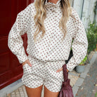 Deze opvallende tweedelige set in ecru met bruine stippen combineert stijl en comfort. De set bestaat uit een short en een bijpassend jack. Het jack heeft een sportieve, cropped pasvorm en een opstaande kraag. De short heeft een relaxte pasvorm en is voorzien van zakken. Samen vormt het een complete outfit, maar je kunt de items ook afzonderlijk dragen.