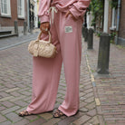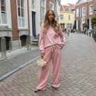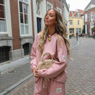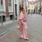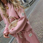 Dit complete joggingpak in een zachte roze tint is dé perfecte combinatie van comfort en trendy stijl. Het pak bestaat uit een joggingbroek en een bijpassende sweater met een unieke afwerking aan de onderkant. De sweater heeft een casual, losse pasvorm. Zowel de broek als de trui zijn voorzien van een klein label met de tekst "LIFE ISN'T PERFECT BUT YOUR OUTFIT CAN BE", wat het pak een speelse touch geeft. Ideaal voor een relaxte dag thuis of een casual dagje uit!