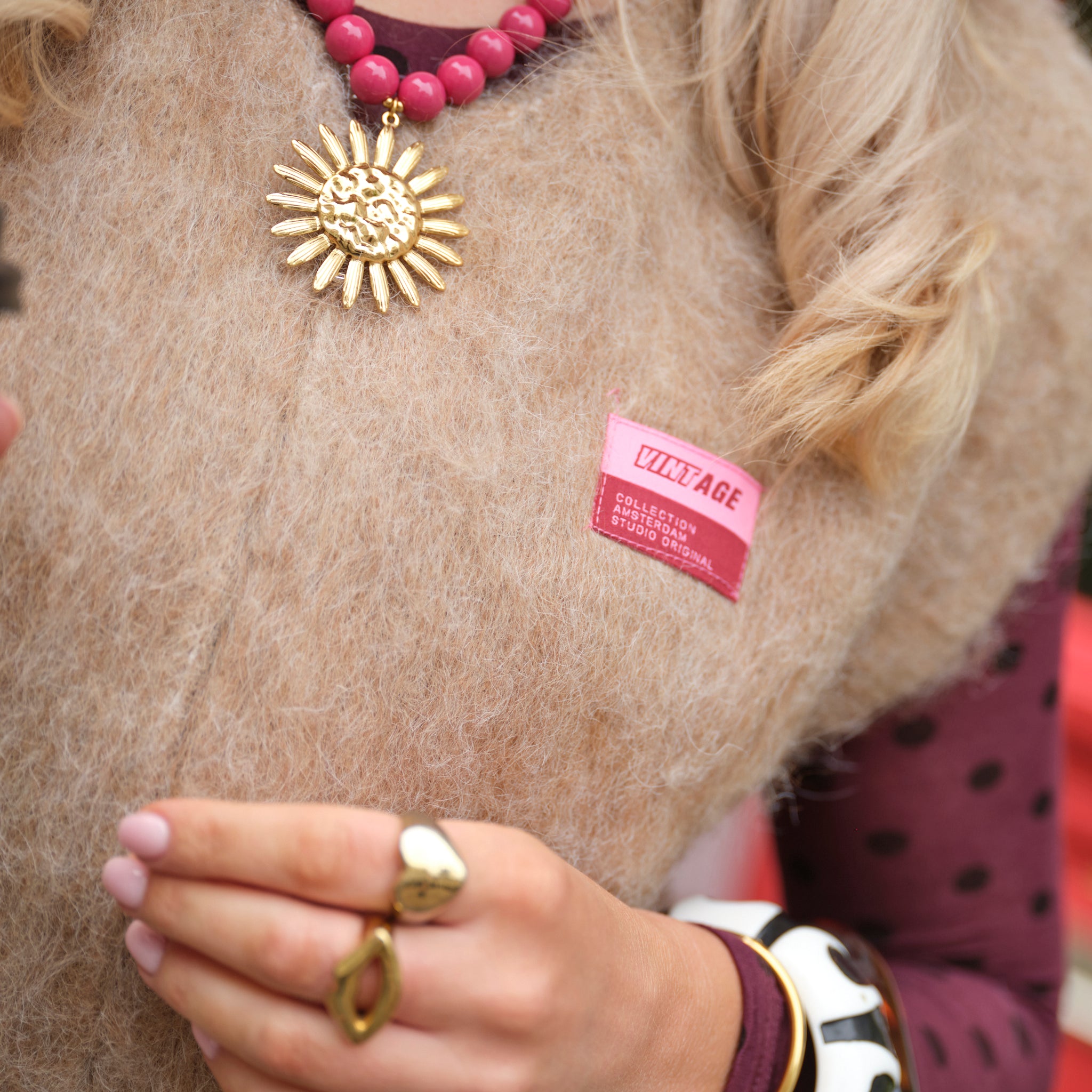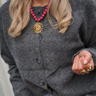 Deze opvallende ketting voegt een vrolijke, zomerse vibe toe aan elke outfit. De ketting bestaat uit meerdere rijen glanzende, rode kralen die zorgen voor een rijke textuur en een opvallend kleuraccent. Het middelpunt van de ketting is een grote, goudkleurige zonnehanger met gedetailleerde stralen, wat zorgt voor een unieke, statement uitstraling.