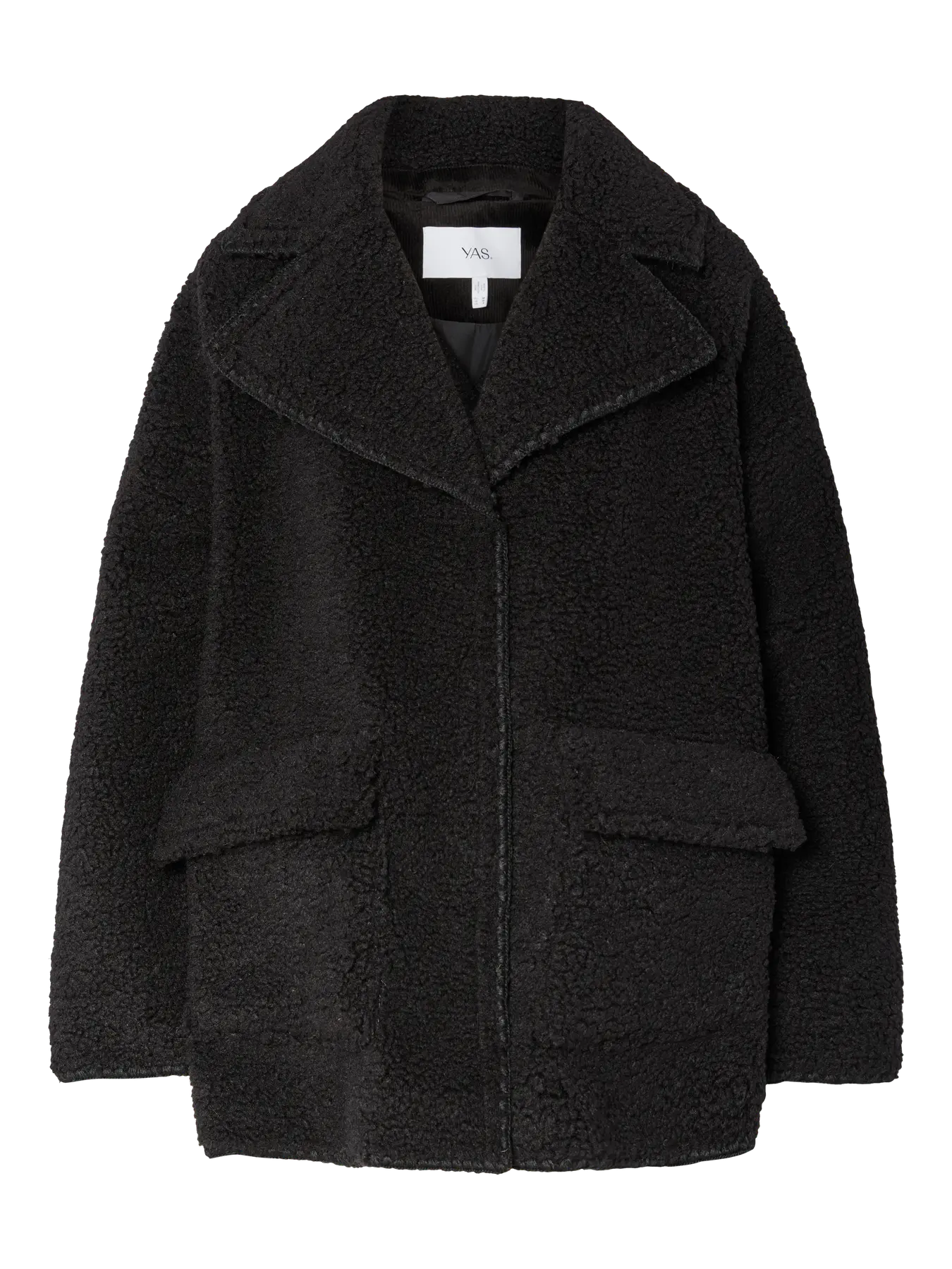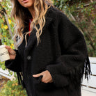 Dit YAS Fina Ls Fringe Jacket is een warme en edgy tussenjas met een luxe textuur. De jas is uitgevoerd in een diepe zwarte kleur en gemaakt van een grof teddy/bouclé stof. De jas heeft een klassieke reverskraag, knoopsluiting en twee grote opgestikte zakken.