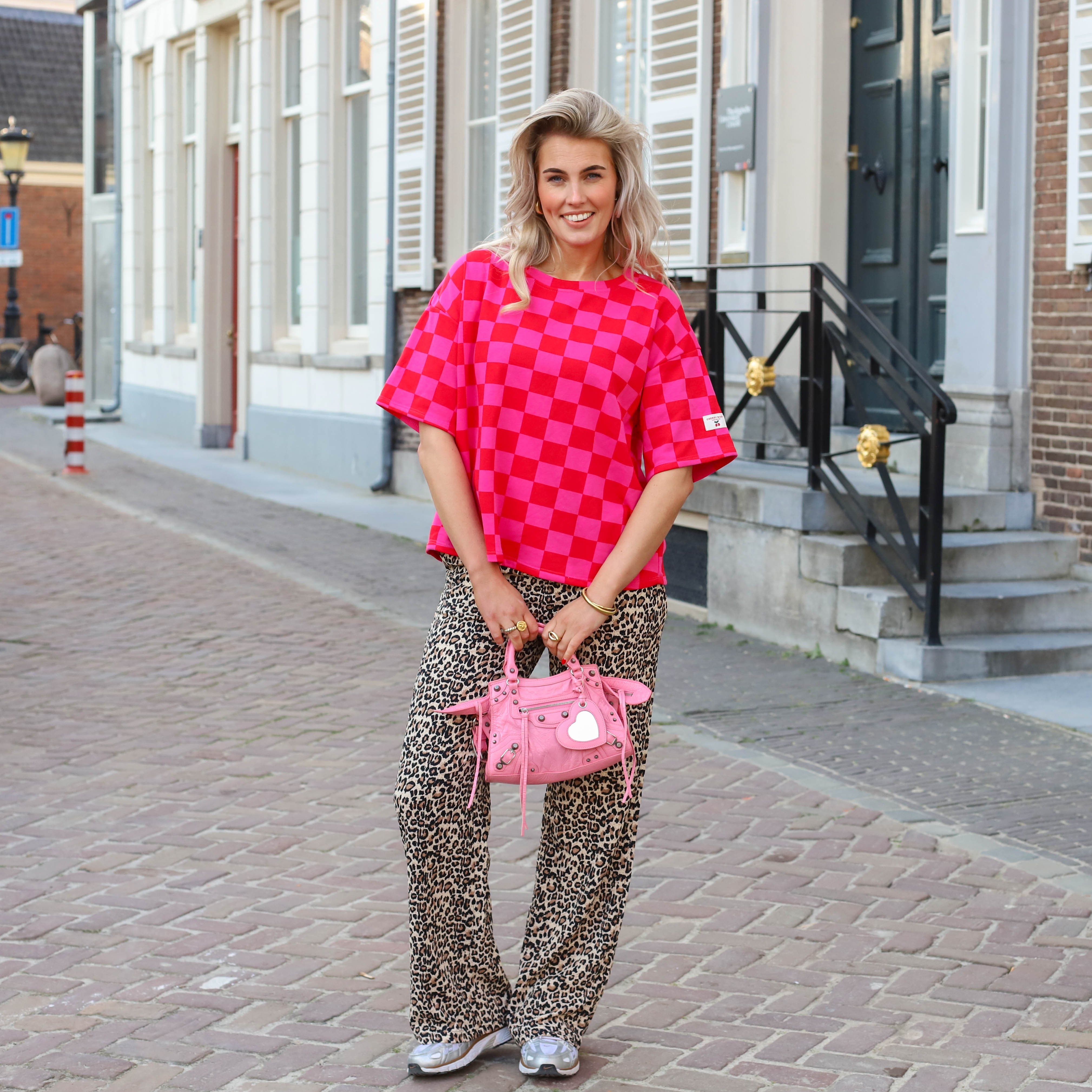 Geblokte sweater korte mouw blokjes cherry oranje roze