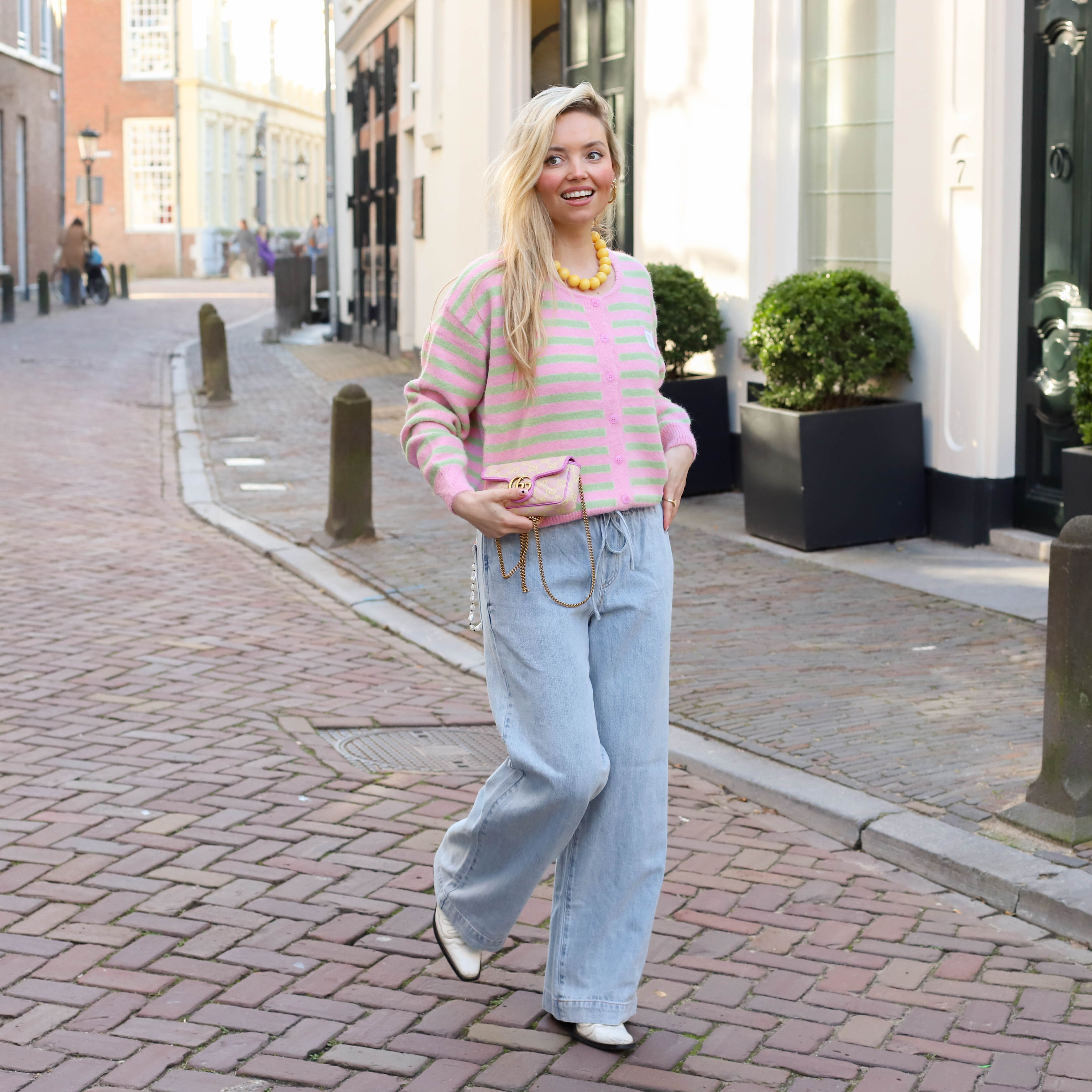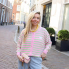 Deze Aimee Streep Vest roze groen is een speels en zacht vest met een frisse, trendy uitstraling. Het vrolijke streeppatroon geeft dit vest een unieke look, terwijl de zachte, fluffy knit zorgt voor extra comfort. De knoopsluiting en relaxte fit maken het vest perfect om zowel open als gesloten te dragen, ideaal voor een kleurrijke touch in je dagelijkse outfit.