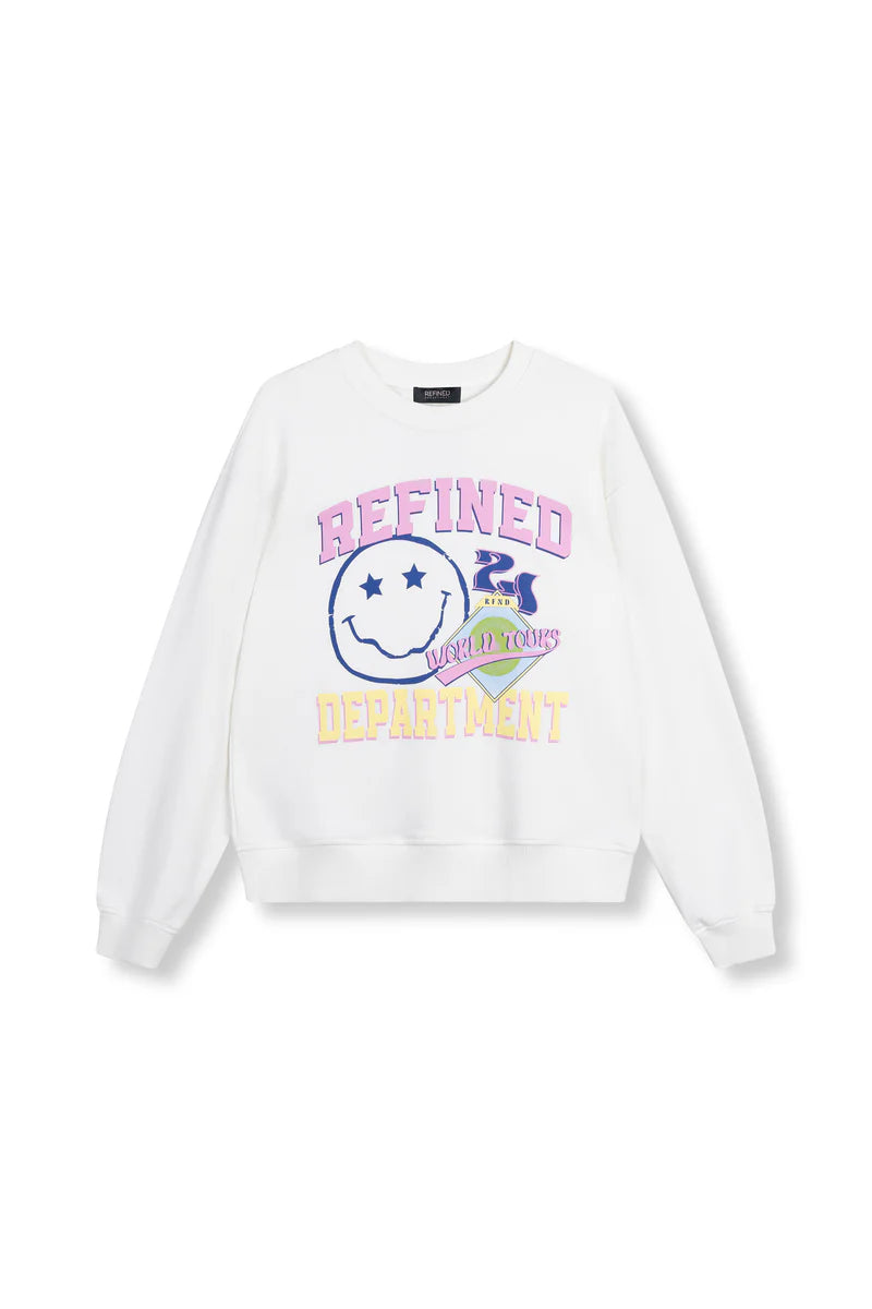 Dit comfortabele sweatshirt is de perfecte mix van casual en stijlvol. De trui in de kleur off white heeft een opvallende 'REFINED DEPARTMENT' print in vrolijke kleuren, en de zachte sweaterstof voelt heerlijk aan op de huid. De relaxte pasvorm met verlaagde schoudernaden en de ronde halslijn maken het shirt ideaal voor een ontspannen en trendy look. De ribgebreide boorden aan de halslijn, mouwen en onderkant zorgen voor een klassieke en duurzame afwerking.