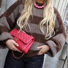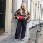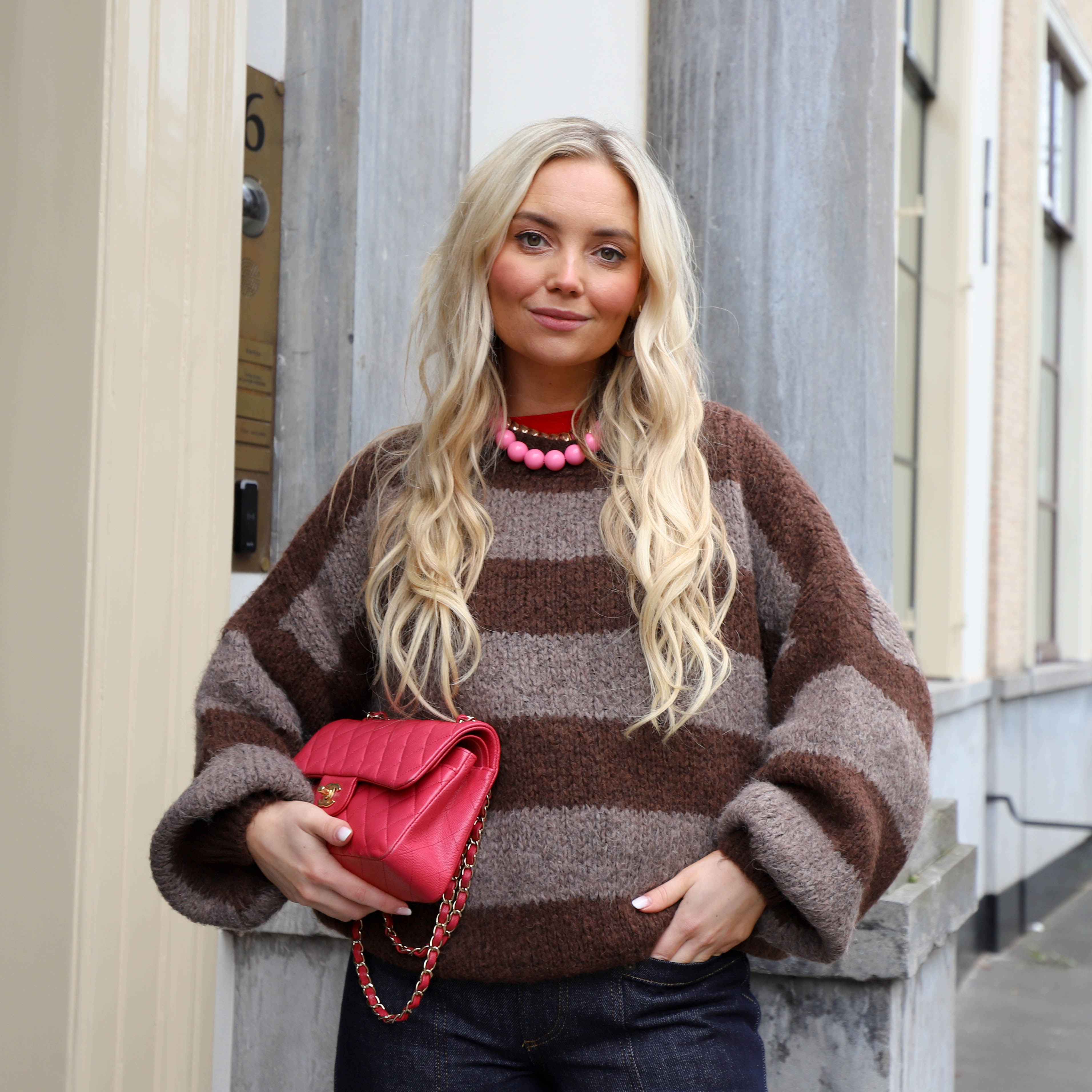 Deze Streep Knit is een vrolijke en warme statement piece voor je wintergarderobe. De trui heeft een grof gebreide, pluizige textuur en een opvallend horizontaal streepdessin in bruin. De wijde, oversized pasvorm, de klassieke ronde hals en de cropped lengte met brede mouwen zorgen voor een speelse en moderne uitstraling.