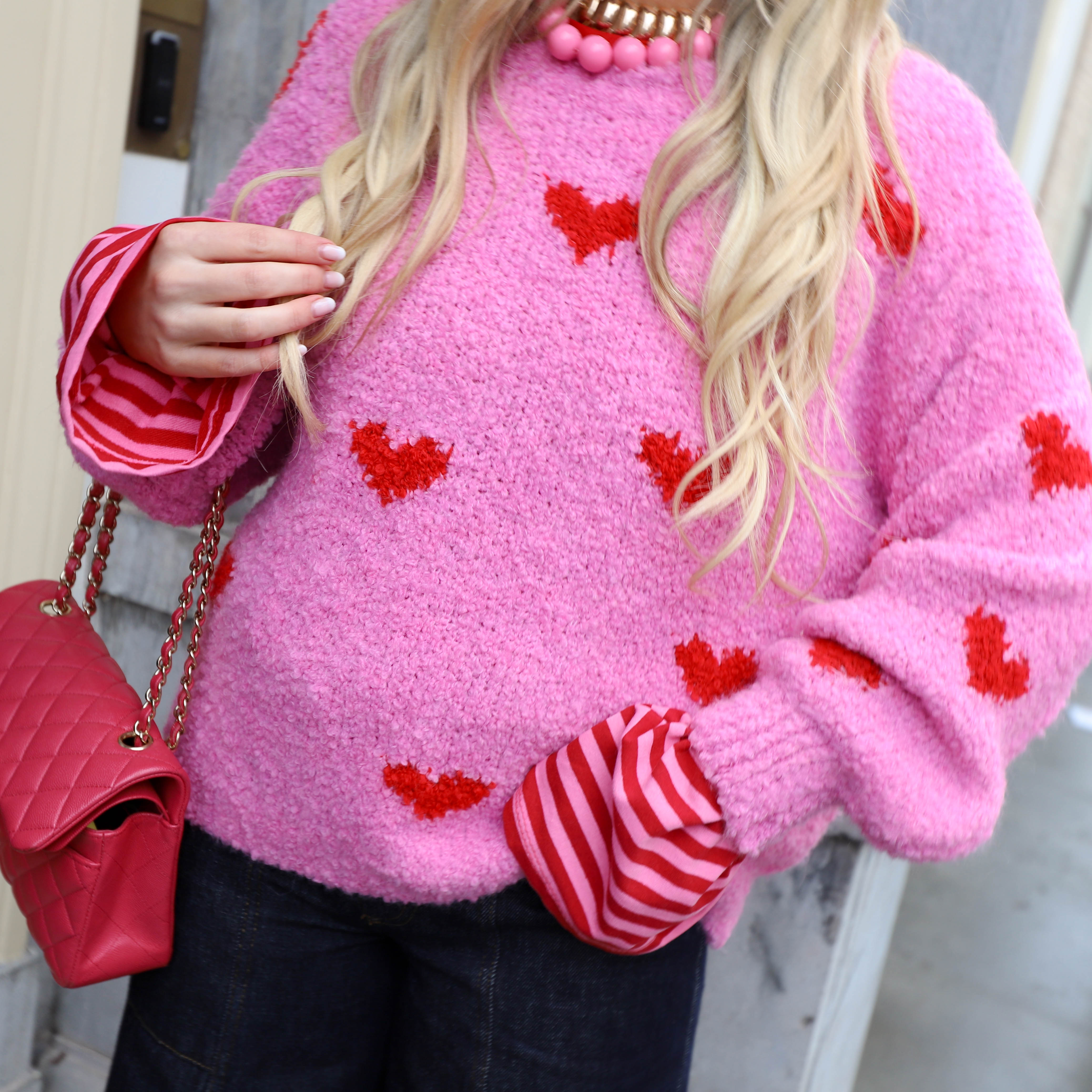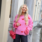 Deze Hartjes Knit Sweater is een lieve en heerlijk zachte trui, perfect voor een knusse en romantische look. De trui is grof gebreid met een harige, bouclé-achtige textuur en is over de gehele stof voorzien van contrasterende hartjes.