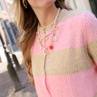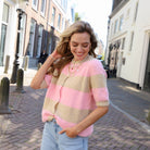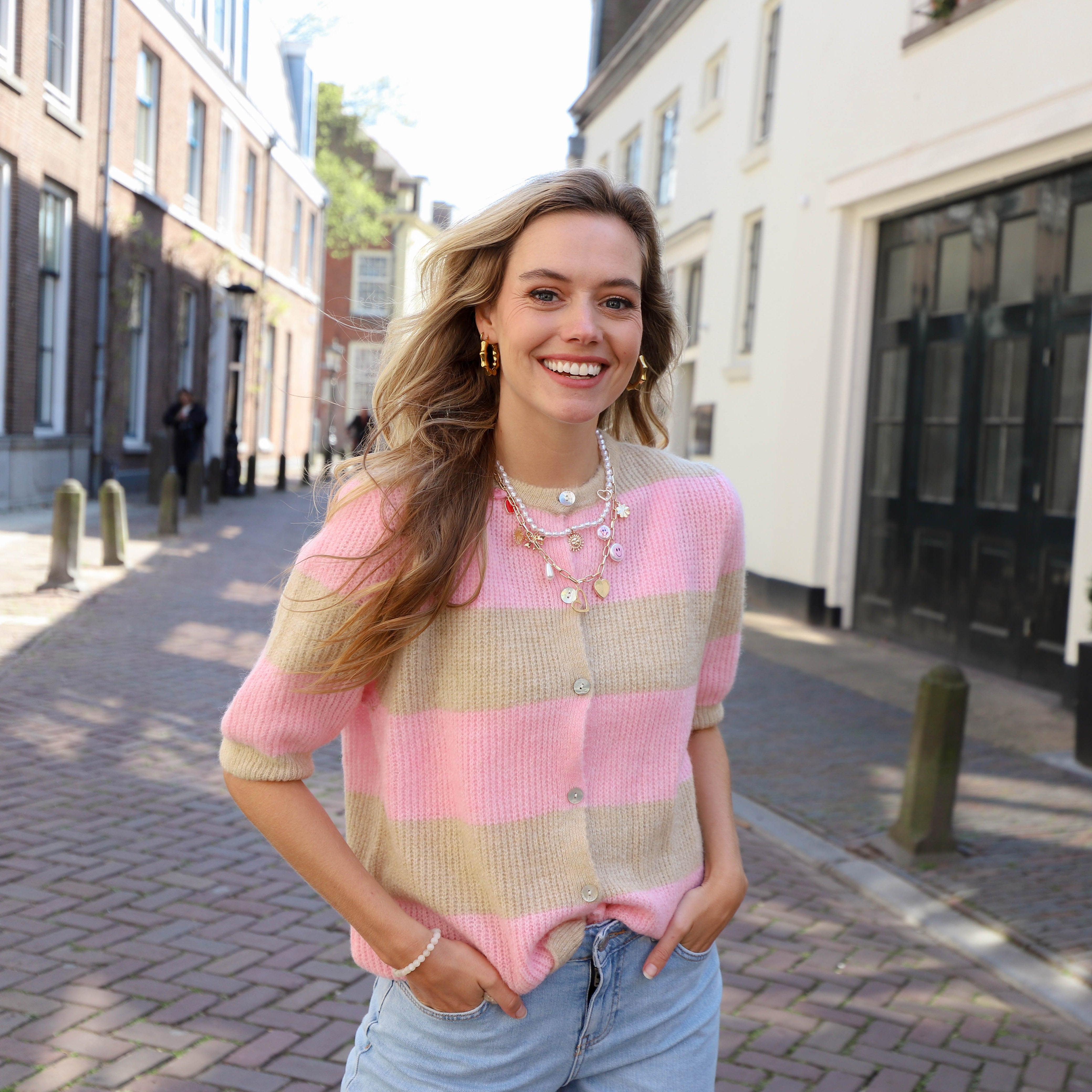 Dit comfortabele vest met brede strepen in roze en beige is een fijne toevoeging aan je garderobe. Het vest heeft korte mouwen en een knoopsluiting aan de voorkant. De zachte mix van viscose, wol, polyacryl en polyester zorgt voor een aangenaam draagcomfort. Perfect om over een top of shirt te dragen voor een kleurrijke en gelaagde look!