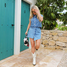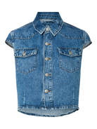 Mooie denim top in het donkerblauw. De top heeft zakken op de borst en sluit met knopen. Combineer deze leuke top met het bijpassende rokje.