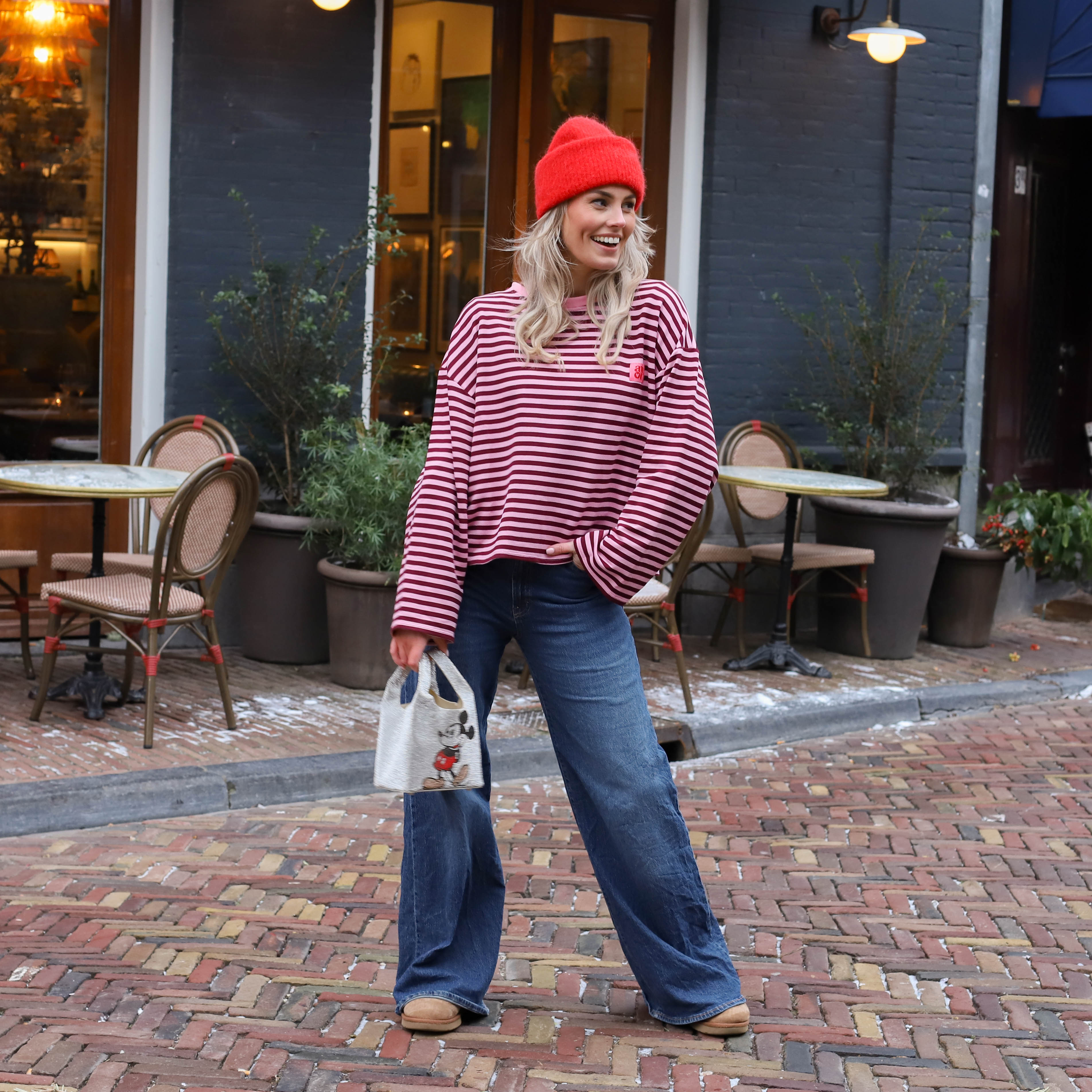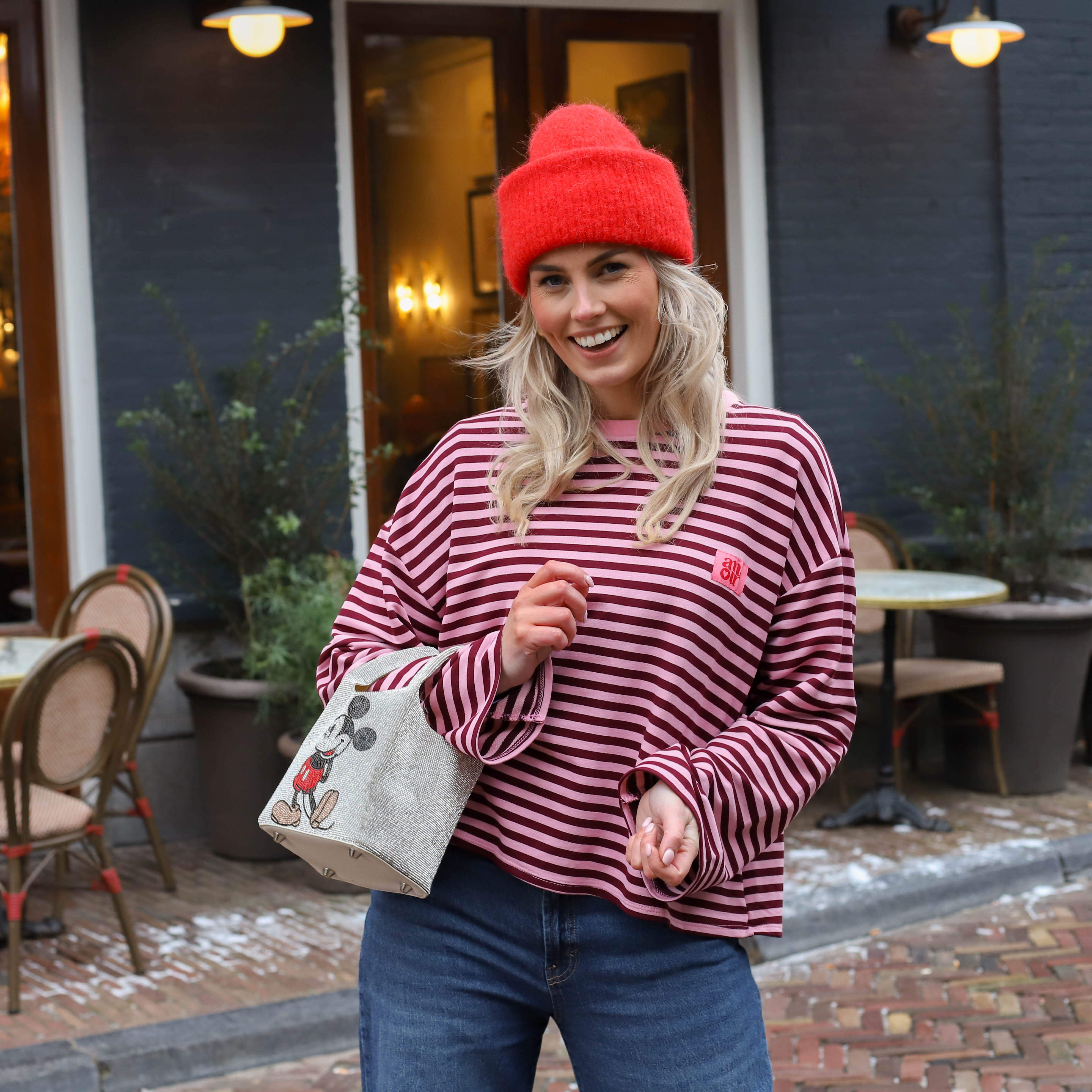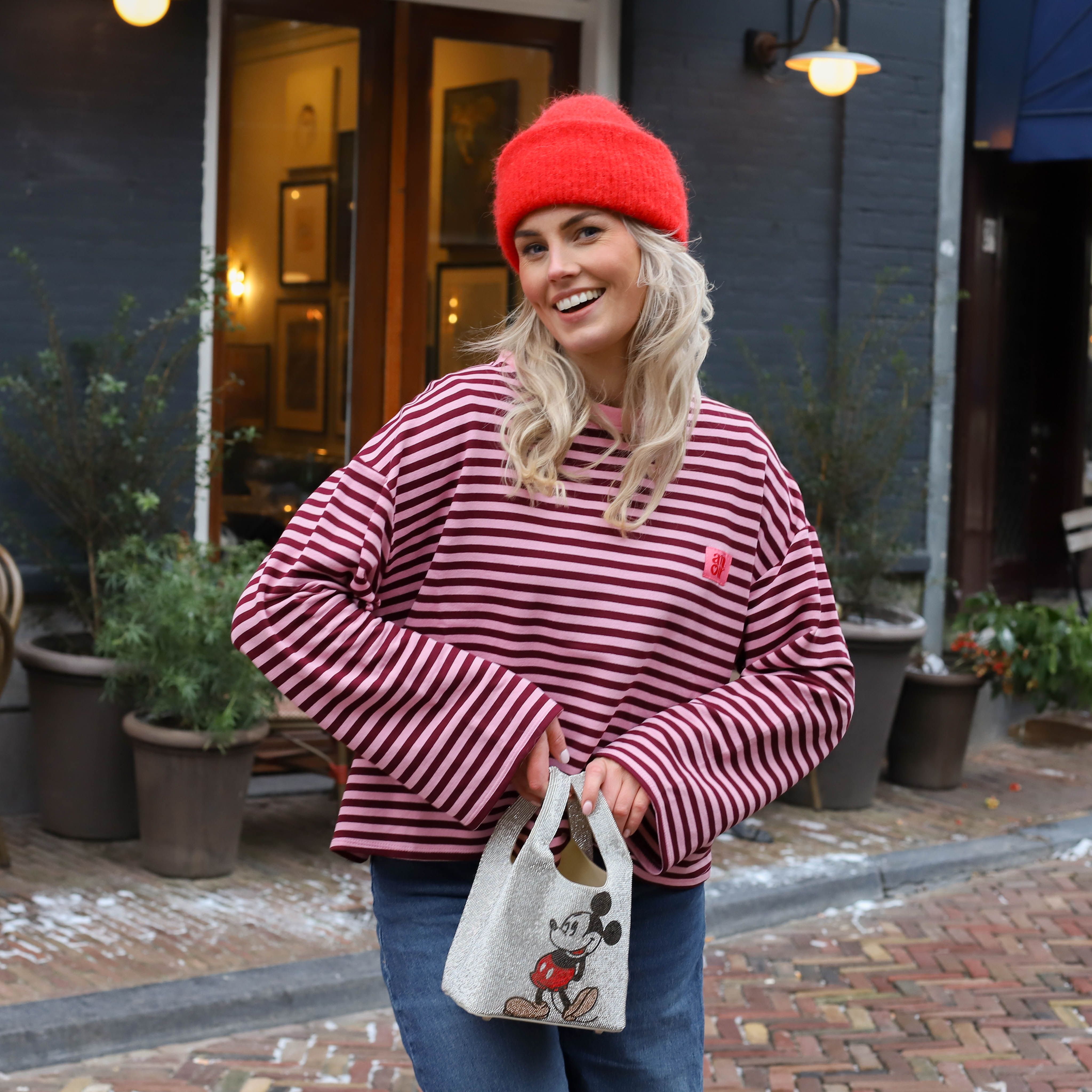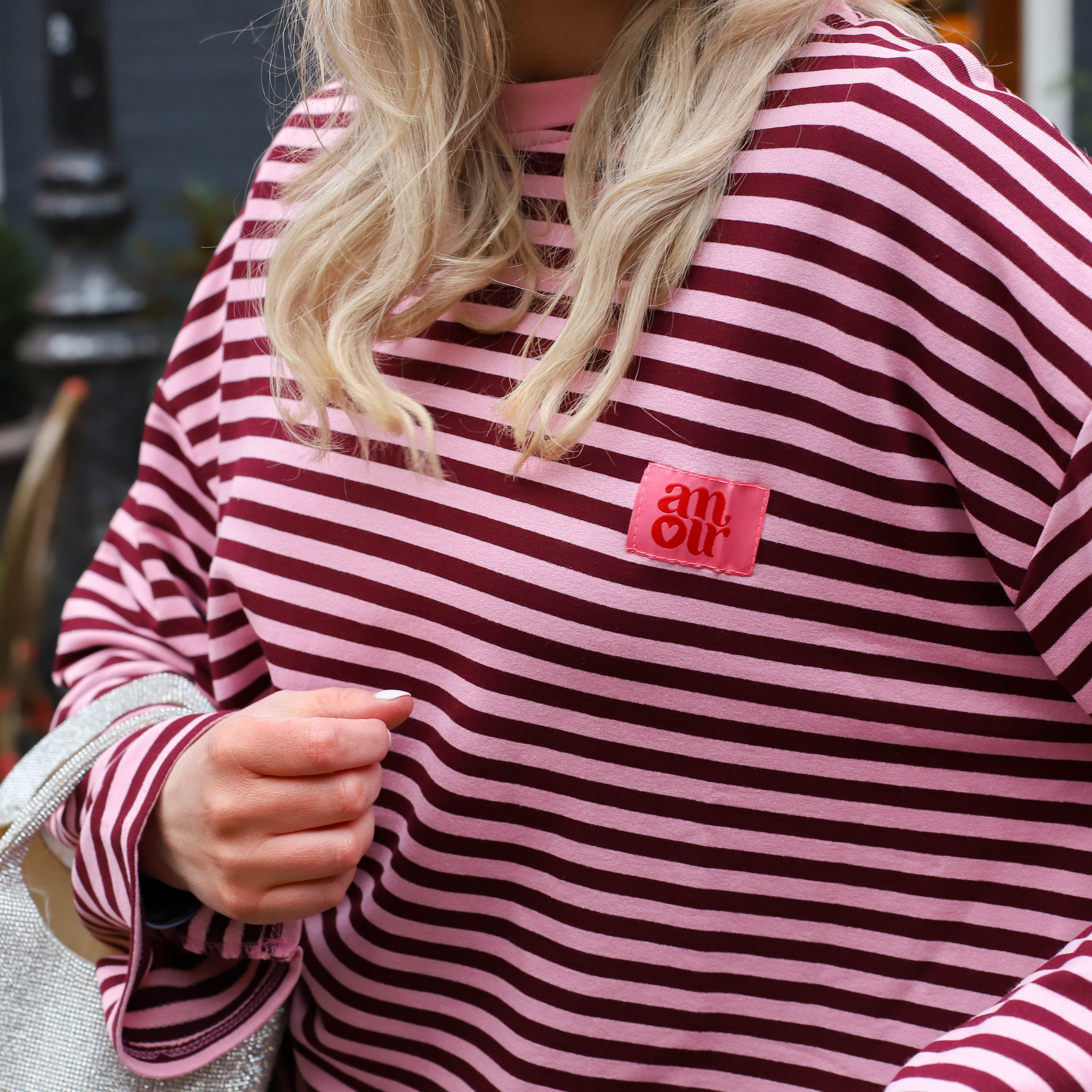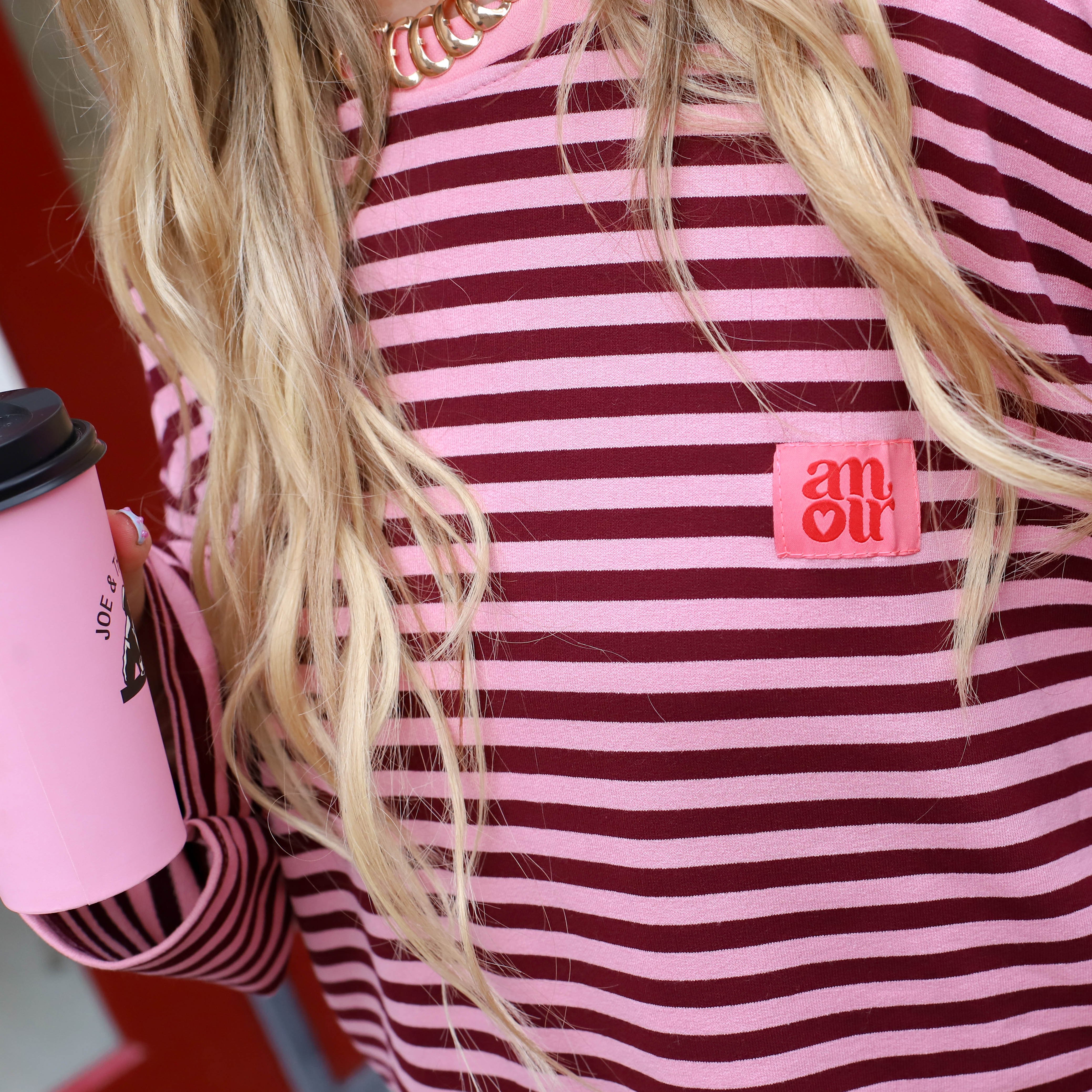 Deze Amour Streep Top is een trendy en comfortabele long sleeve met een speelse uitstraling. De top is voorzien van fijne horizontale strepen in roze en burgundy en heeft een opvallende roze patch op de borst. Dankzij de ruime pasvorm en de zachte katoenmix is dit een ideaal item voor een casual dagelijkse look.