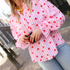 Voeg een vleugje liefde en vrolijkheid toe aan je outfit met deze gestreepte blouse met hartjesprint. De luchtige stof en de speelse details zorgen voor een charmante en comfortabele look. Perfect om je dag een positieve vibe te geven!
