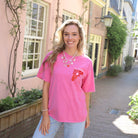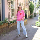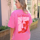 Dit vrolijke roze T-shirt heeft een trendy, verwassen look en een leuke print met de tekst "Le Marais" en een rode bloem. De comfortabele, oversized pasvorm en de zachte katoenen stof maken het perfect voor een relaxte en stijlvolle outfit.