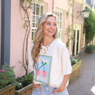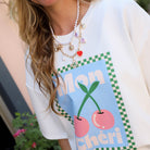 Zomer vibes all year long met dit vrolijke Mon Chéri T-shirt! Deze witte top met speelse print van kersen en retro-blokjesrand is perfect voor zonnige dagen, festivals of om je outfit net dat beetje extra kleur te geven. De soepele stof voelt heerlijk zacht aan en valt mooi losjes. Perfect te combineren met een jeans short of luchtig rokje!