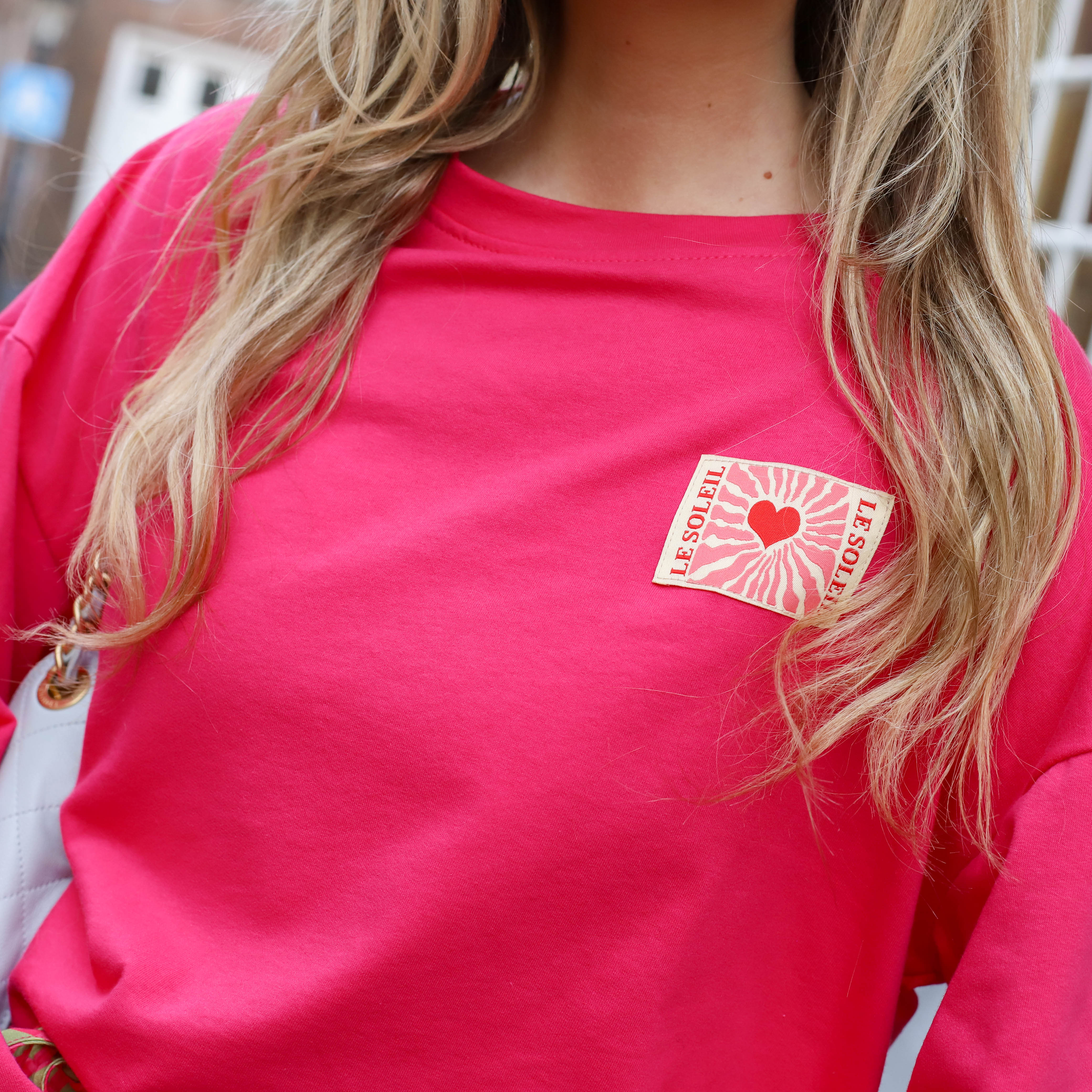 Dit is een stijlvol en minimalistisch shirt dat een verfijnde basis vormt voor elke dagelijkse look. Het shirt kenmerkt zich door een soepele stof en een subtiel "Le Soleil" embleem met een rood hartje op de borst, wat zorgt voor een romantische en vrolijke uitstraling. Dankzij de comfortabele pasvorm en de kwalitatieve katoenmix met een vleugje stretch, biedt het shirt een heerlijk draagcomfort. Het is een veelzijdig item dat perfect te combineren is met zowel een casual jeans als een elegante rok.