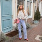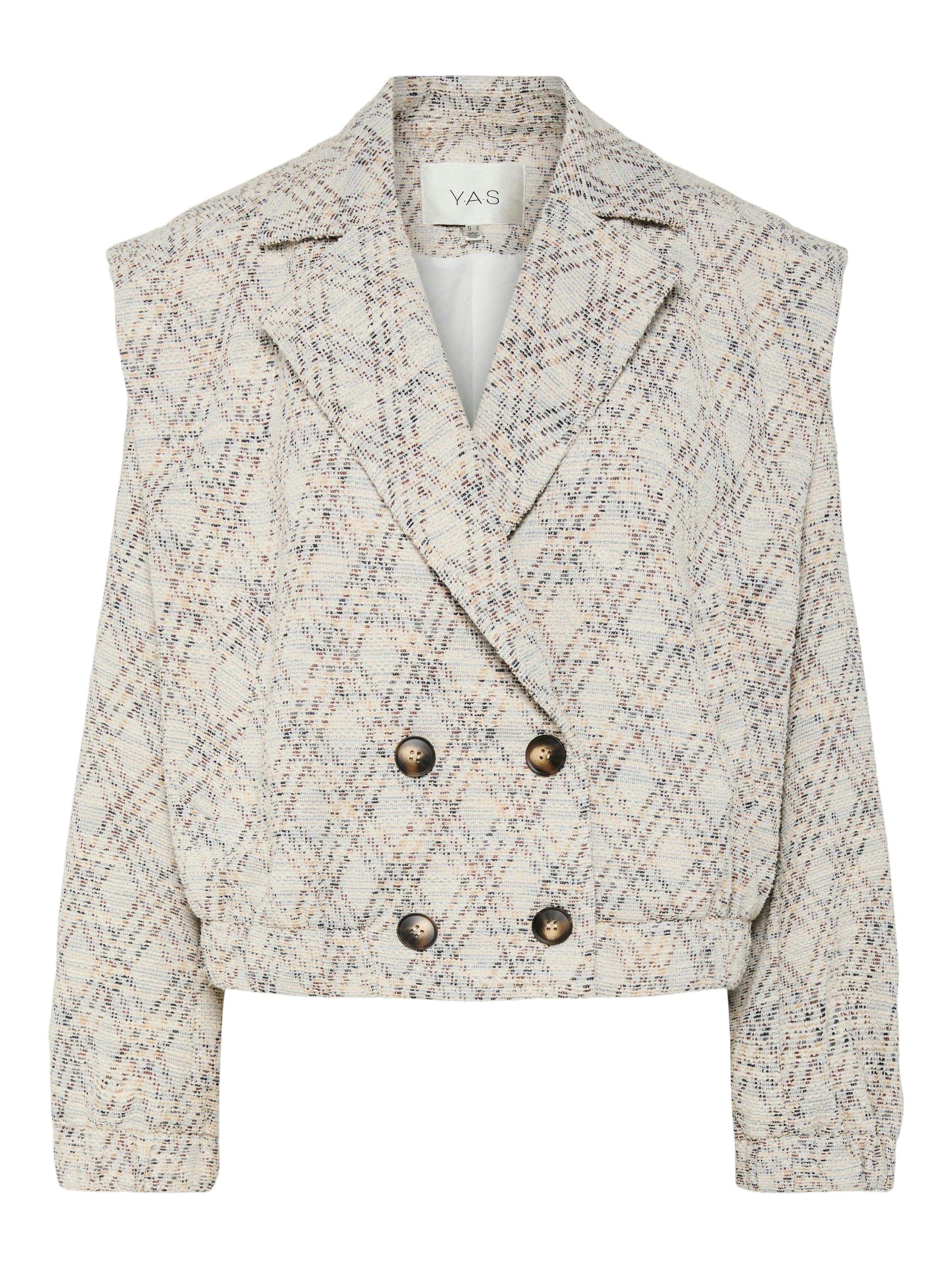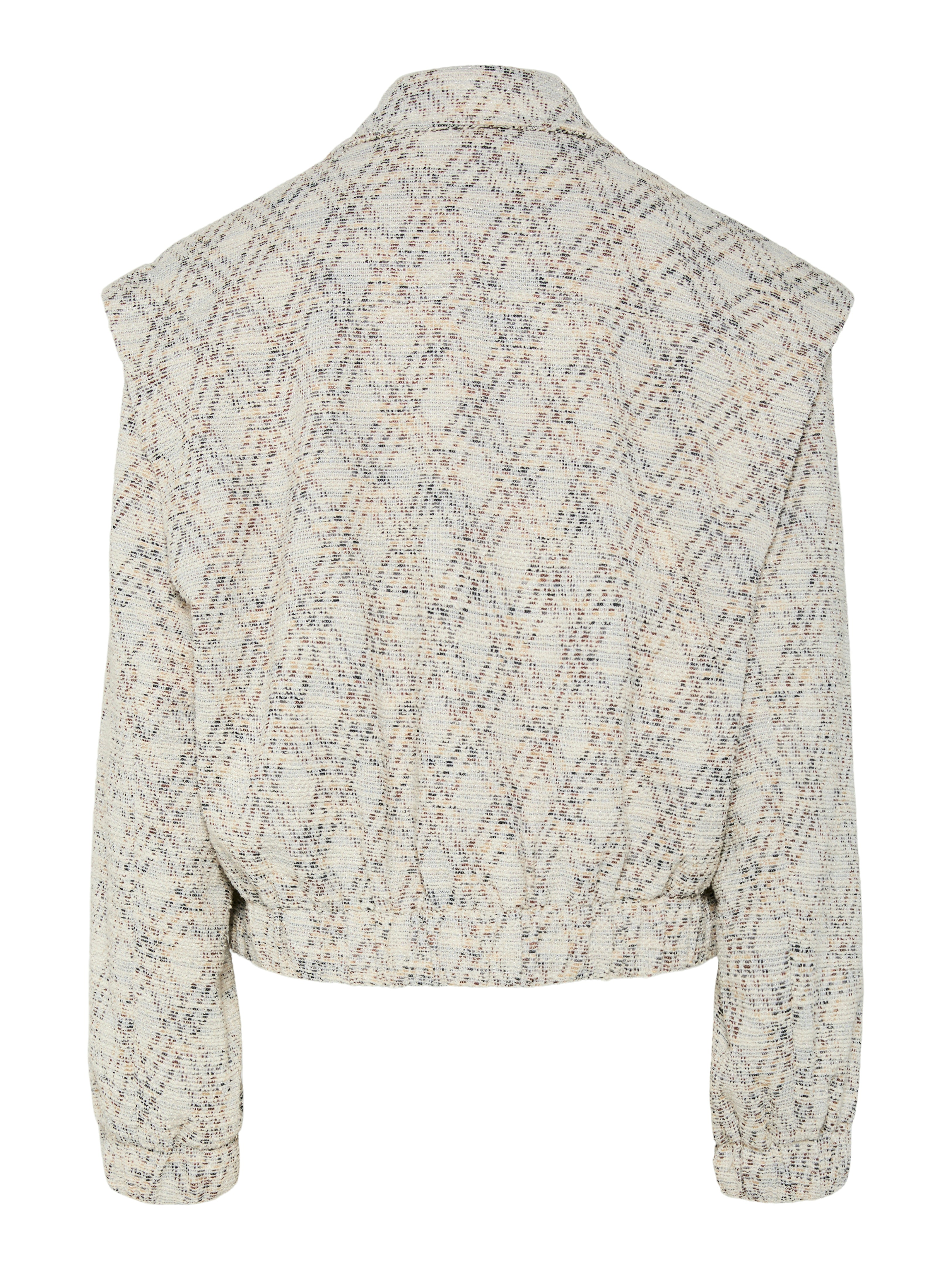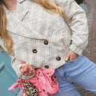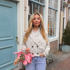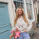 Mooie beige jas met een leuk motiefje. Het jasje sluit met knopen en heeft zakken. Draag hem met een jeans.