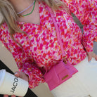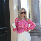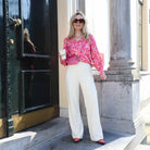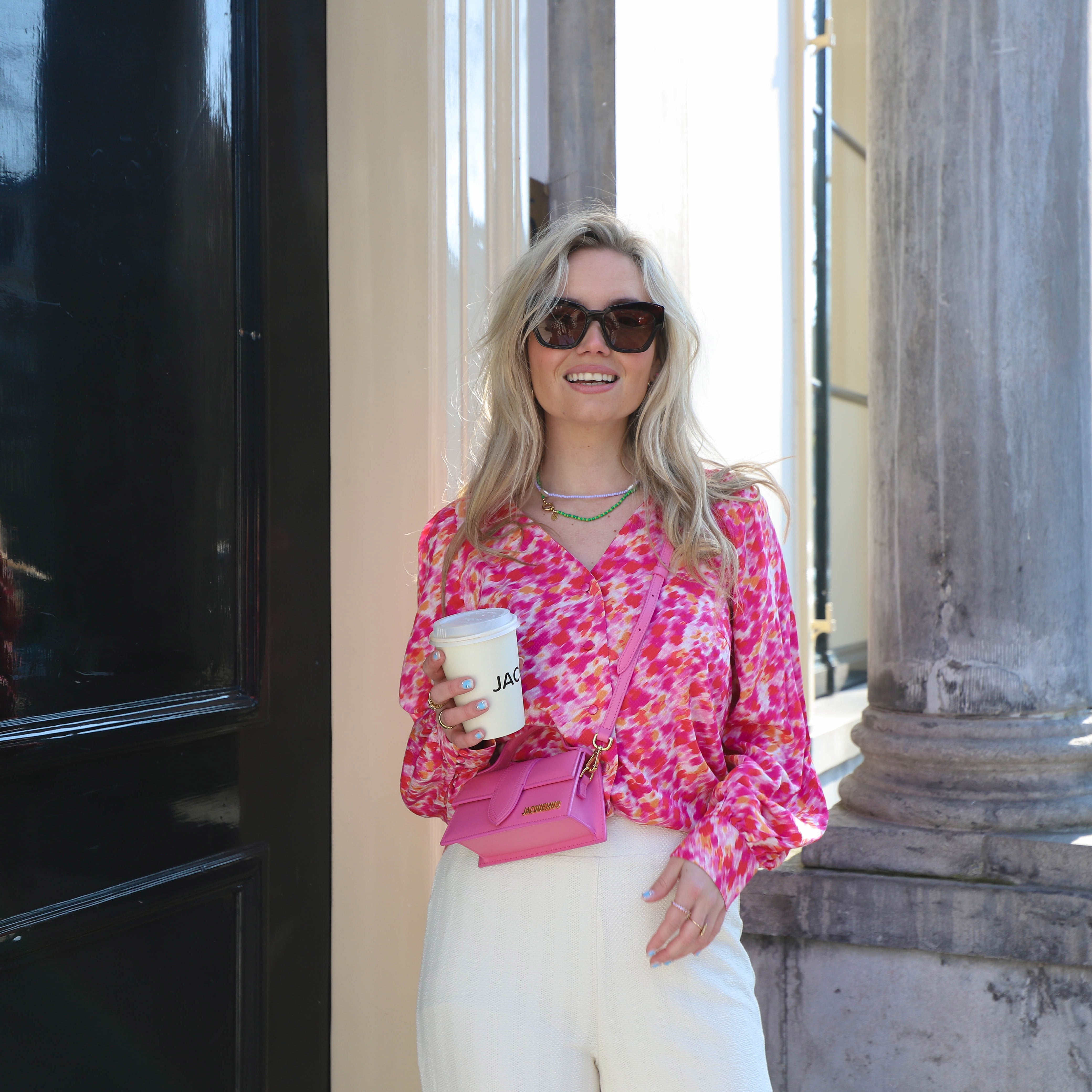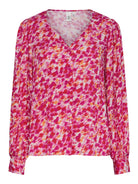 Mooie rozekleurige blouse van YAS met een vrolijke kleur. De blouse heeft een kleurrijke print en een v-hals. De blouse staat leuk met een pantalon, net zoals ons model het draagt.