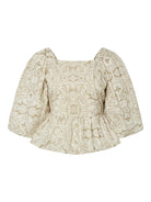 Deze stijlvolle Ara 3/4 top van YAS heeft een prachtige, subtiele print in zilver en saliegroen. De top heeft een elegante vierkante halslijn en volumineuze 3/4 mouwen, wat zorgt voor een sophisticated uitstraling. De comfortabele pasvorm en de zachte katoenen stof maken het een fijne top om te dragen. Perfect om je outfit een chique touch te geven!