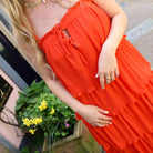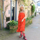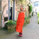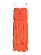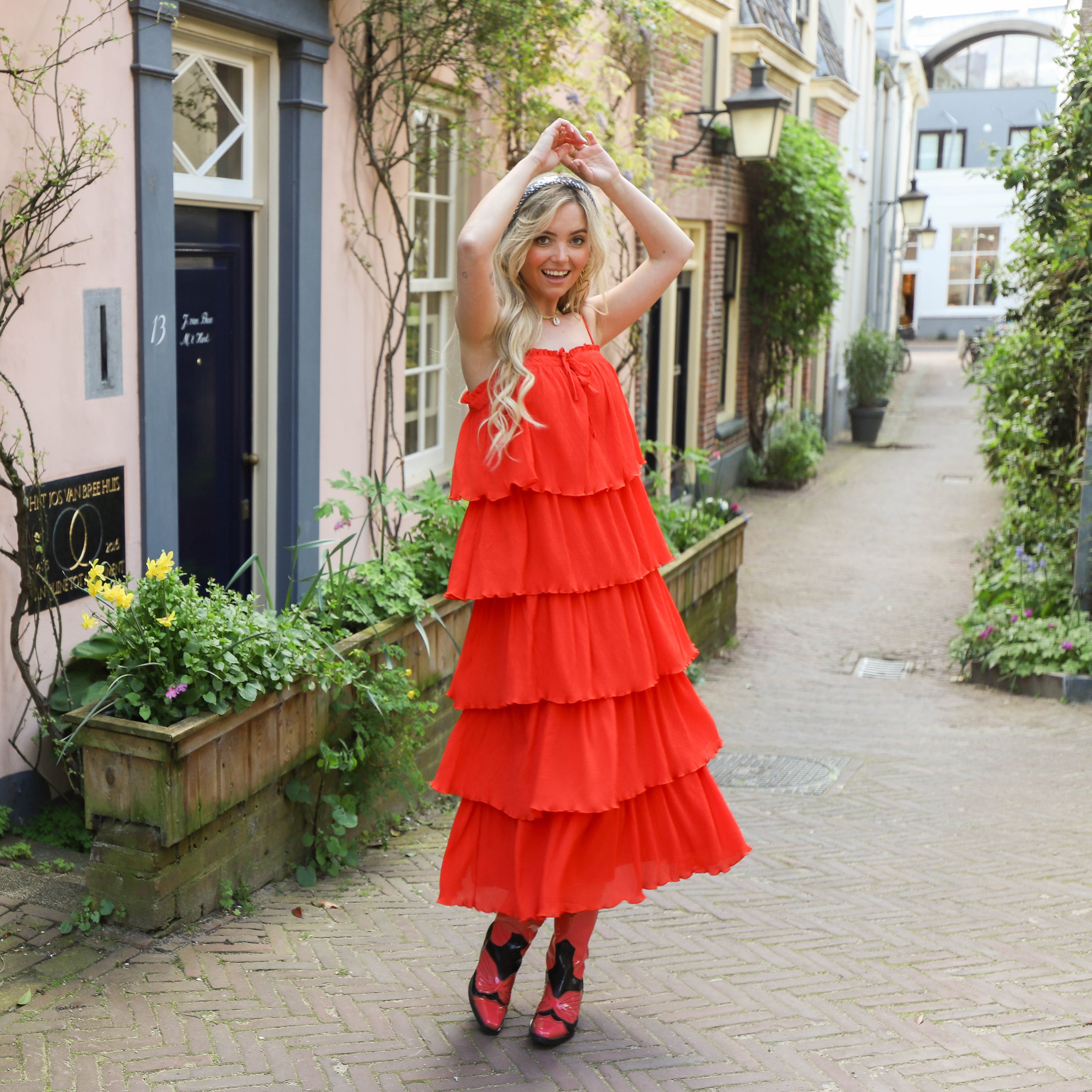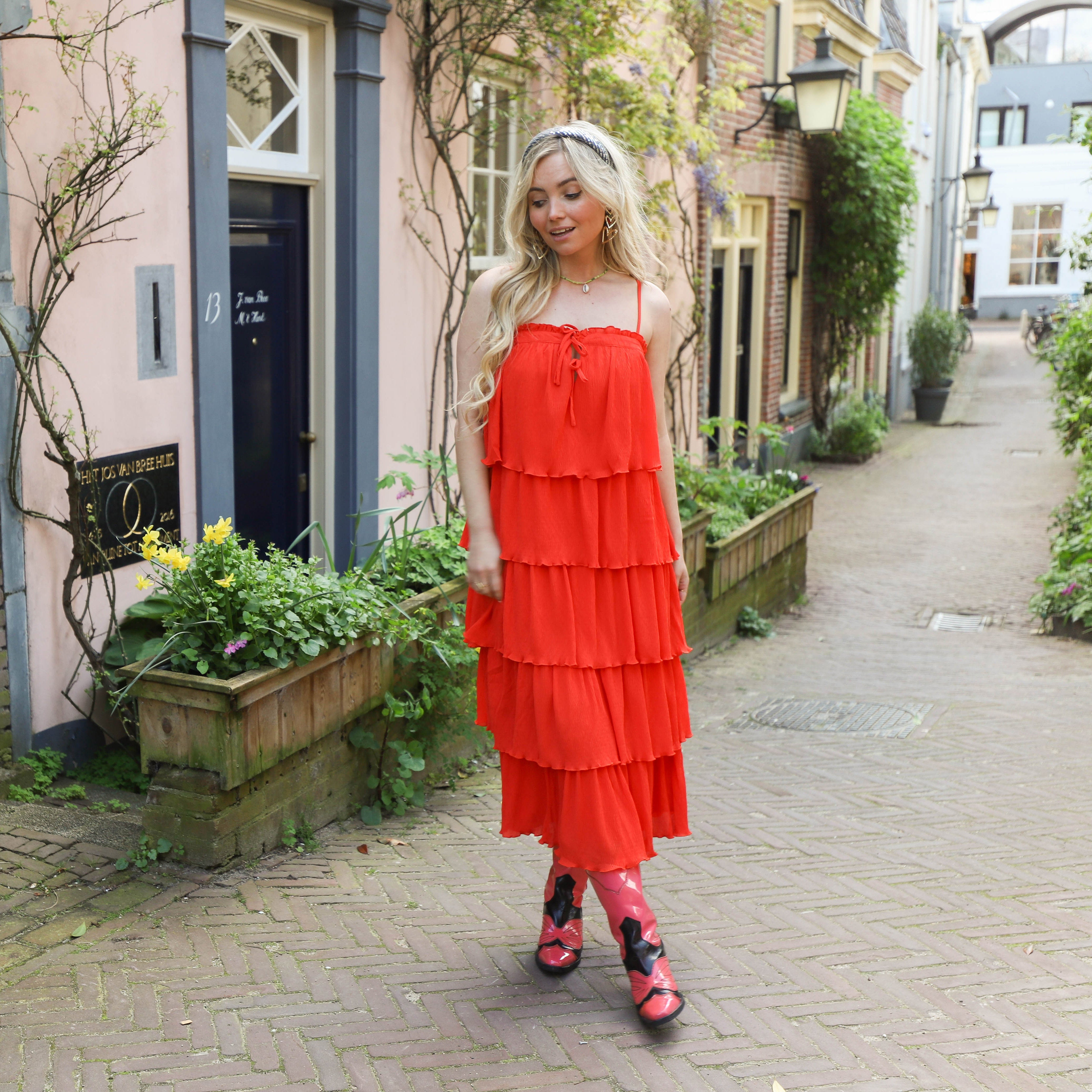 Mooie lange rode jurk met laagjes. De jurk met spaghettibandjes heeft ruffles en is te strikken aan de bovenkant. Leuk met een paar laarsjes.