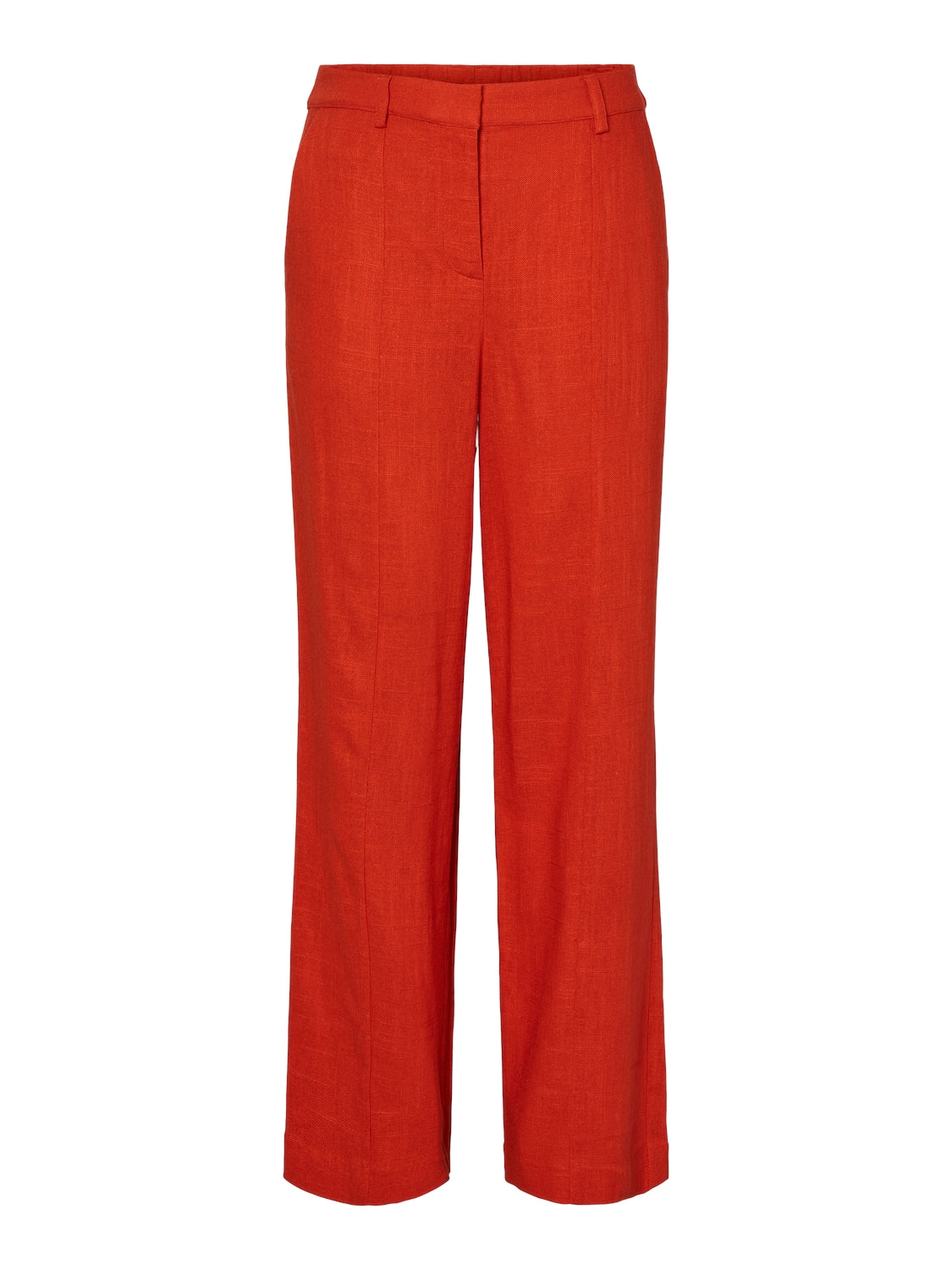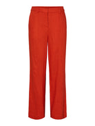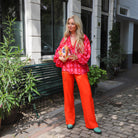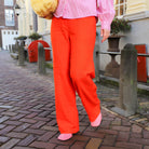 Mooie pantalon in een vrolijke kleur. De pantalon heeft een hoge taille en rechte wijde pijpen. Combineer met een kleurrijke blouse.