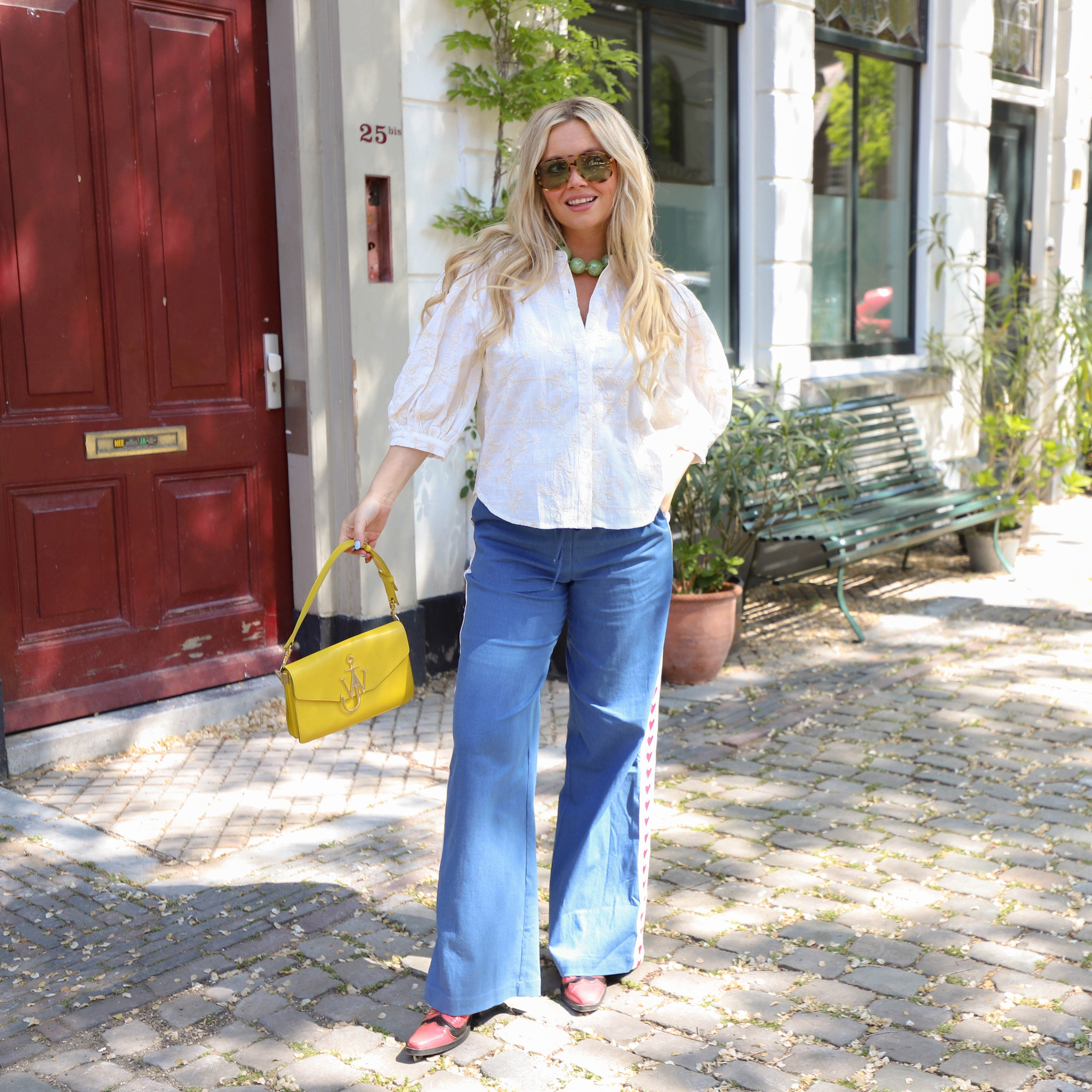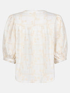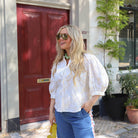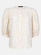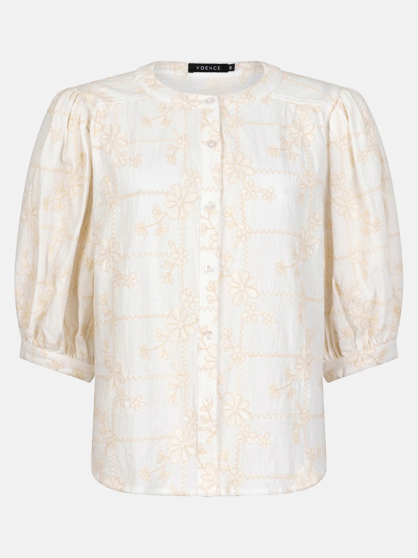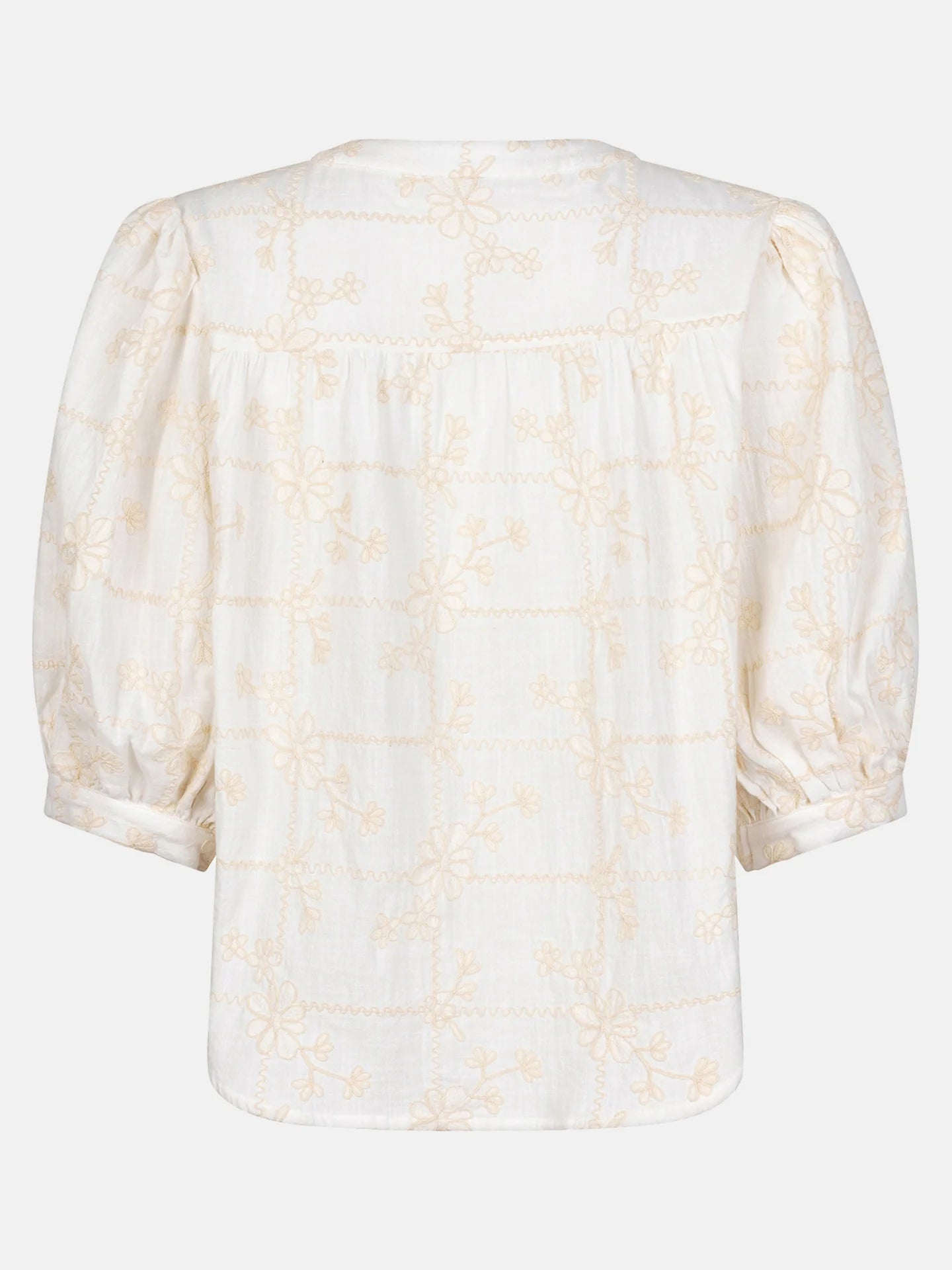 Blouse Cara is een vrouwelijke blouse uitgevoerd in een luchtige katoenen stof verrijkt met fijne borduursels. De blouse heeft een loose fit, ronde halslijn en knoopsluiting aan de voorzijde. De grote driekwart pofmouwen maken de blouse helmaal af!