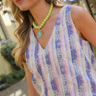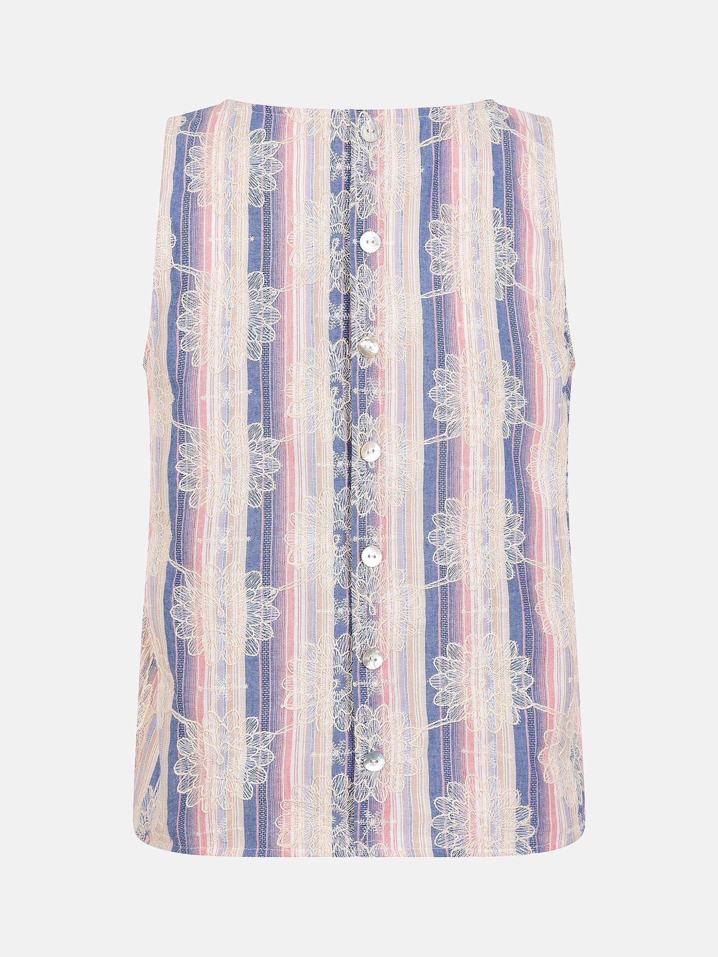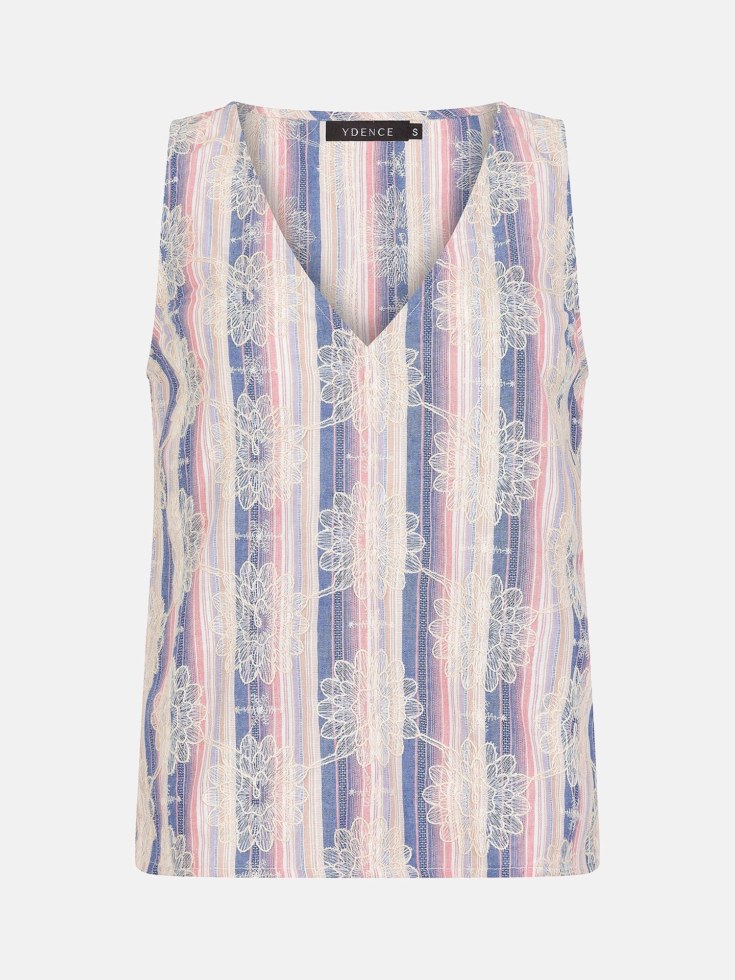 Top Cela is een vrouwelijke top met subtiele V-hals. De stof wordt verrijkt met een verfijnd wit borduurpatroon, wat een luxe en bohemian uitstraling geeft. De top heeft een totale lengte van 56 cm in maat S.