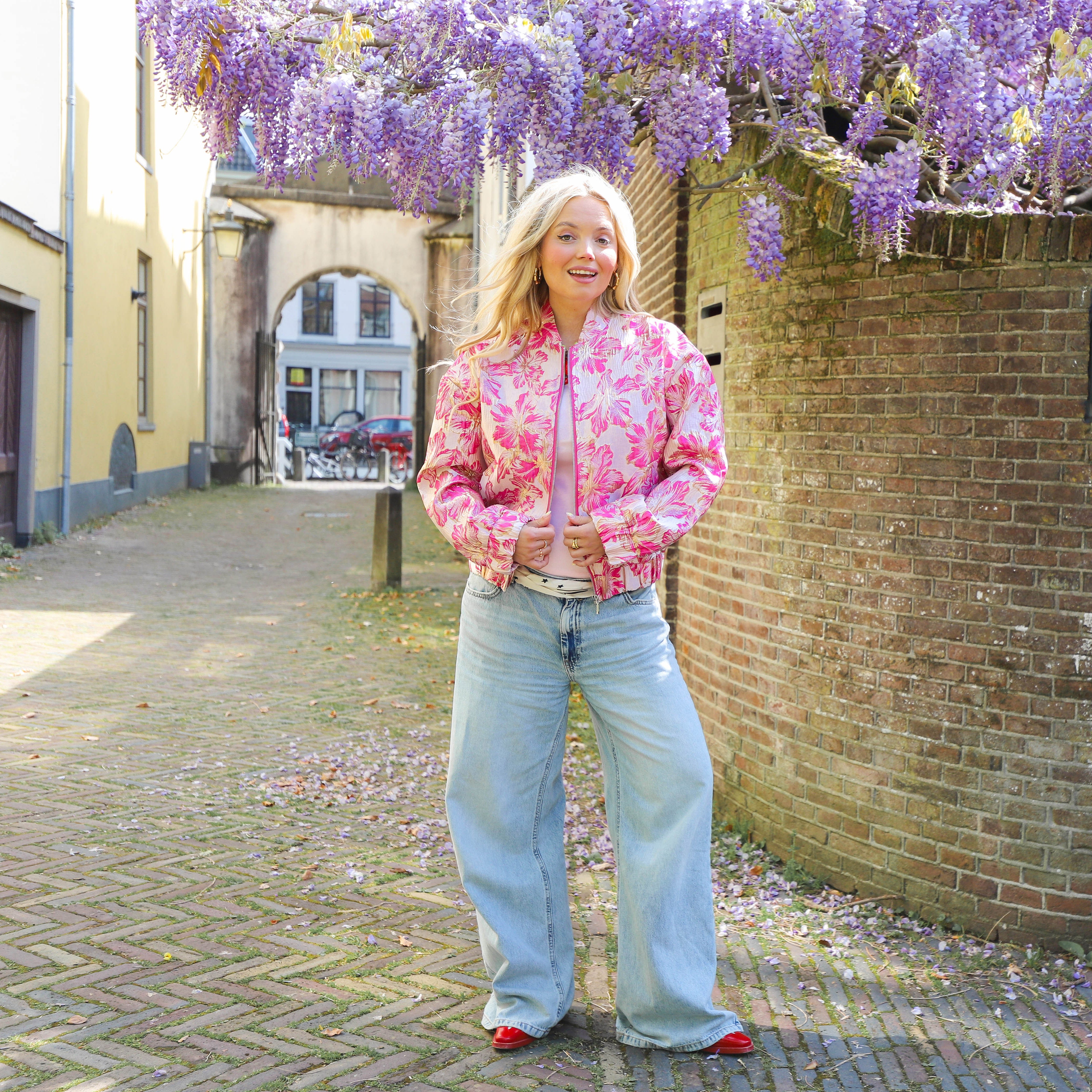 Dit opvallende Anna Bomber Jack in jacquard fuchsia is een echte eyecatcher. De bloemige jacquard print geeft het jasje een unieke en trendy uitstraling. Het bomber model met de ritssluiting en de elastische boorden zorgt voor een comfortabele en sportieve look. Perfect om je outfit een vrolijke en modieuze touch te geven!