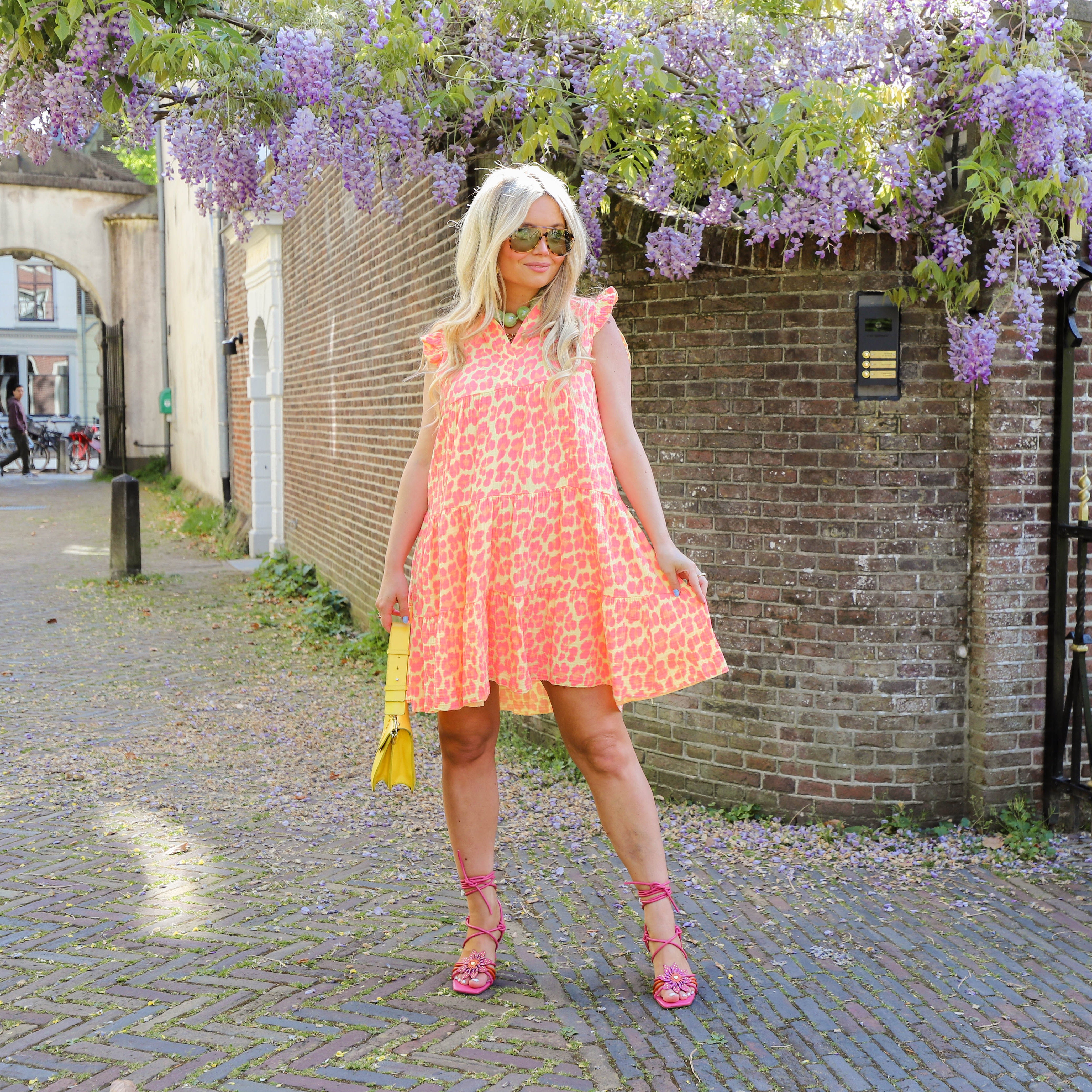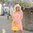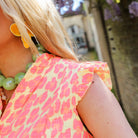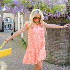 Deze vrolijke Fien Mousseline jurk met gele roze leopard print is een echte zomerse must-have! De jurk heeft een losse, comfortabele pasvorm met een subtiele V-hals en schattige ruffle details aan de mouwloze schouders. De gelaagde rok zorgt voor een zwierig effect.
