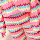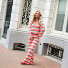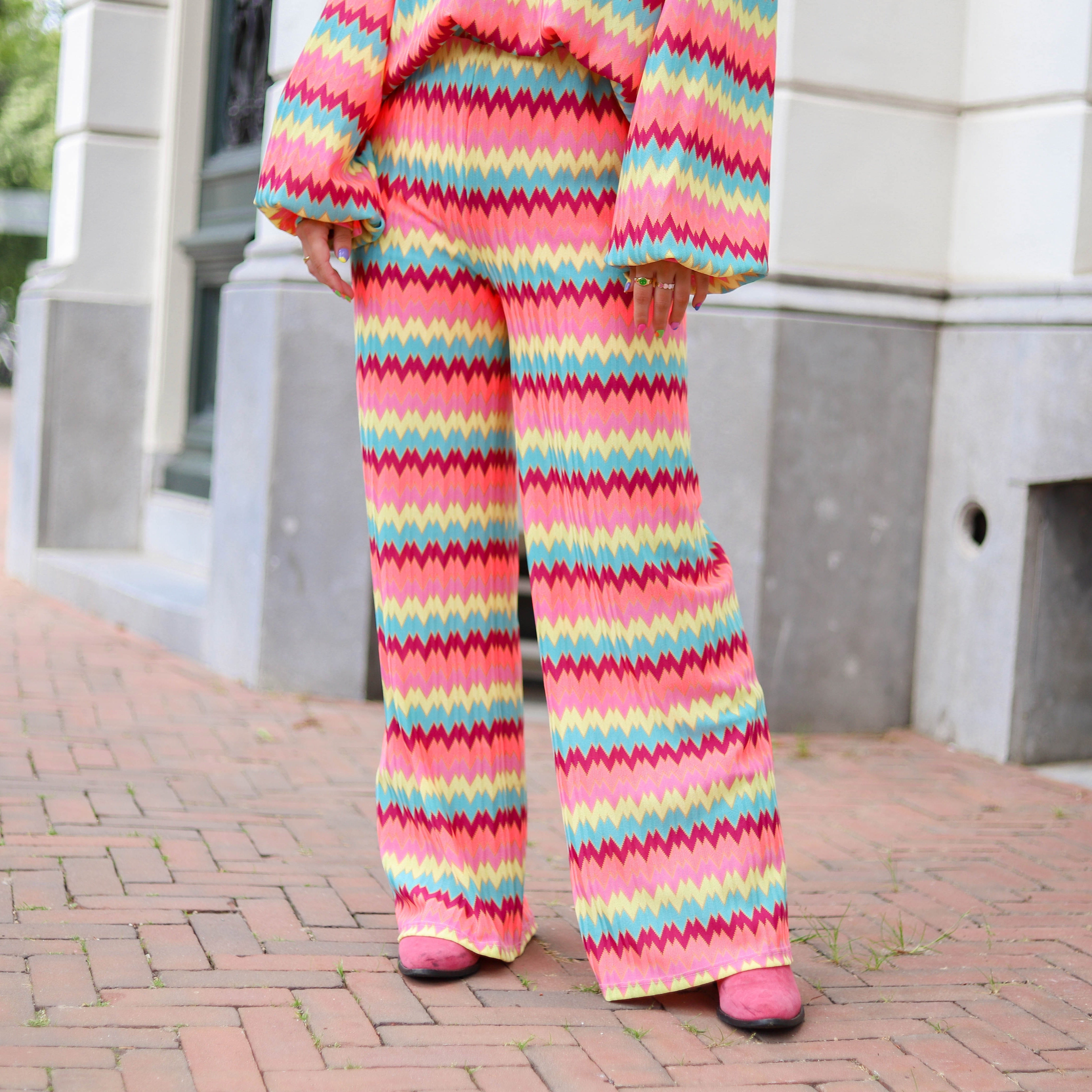 Mooie lange wijde high waist broek. De broek heeft een vrolijke print van aztec zigzag. Leuk te combineren met de bijpassende blouse of een witte top.