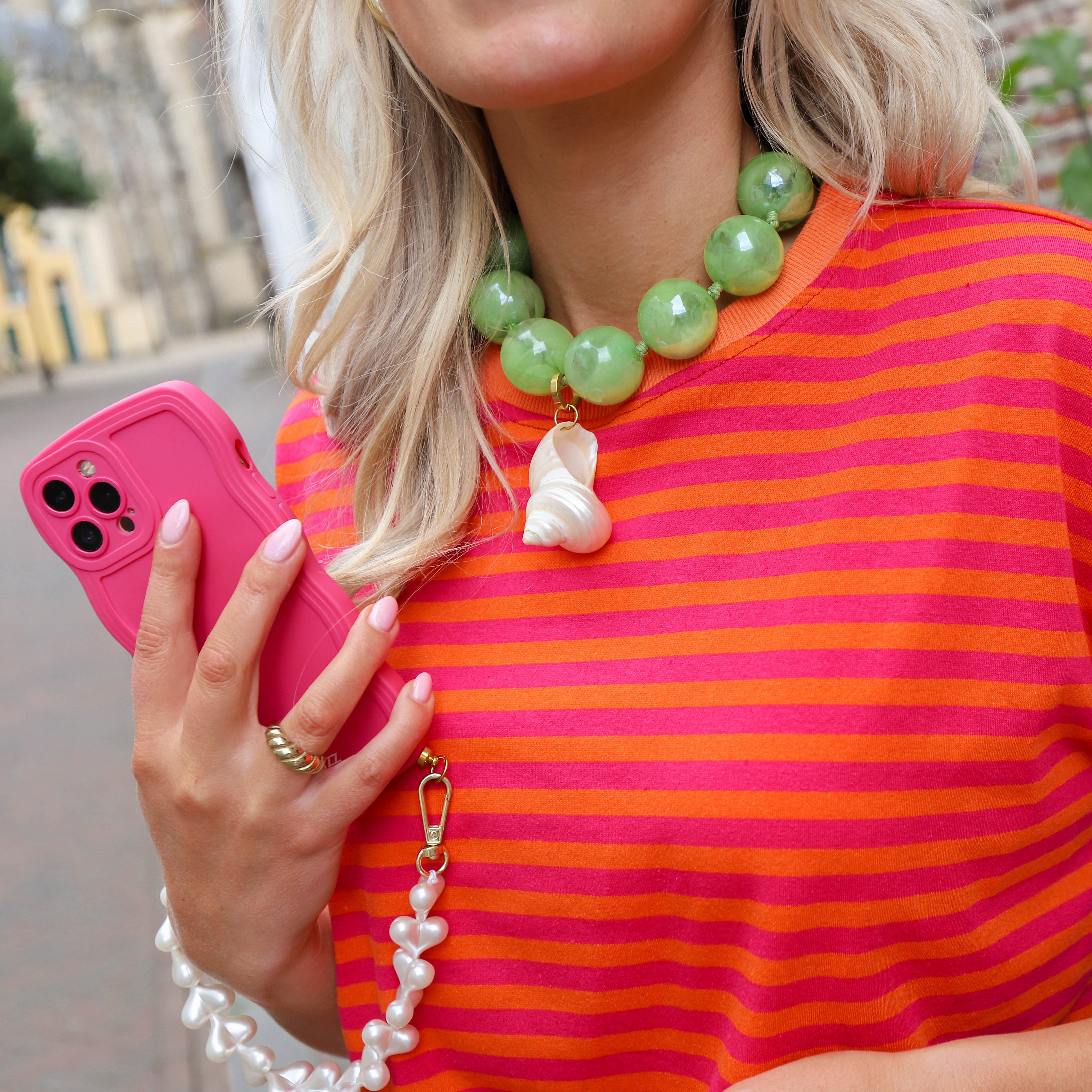 Dit vrolijke Saar tee in roze en oranje gestreept is een zonnige toevoeging aan je casual garderobe! Het T-shirt heeft een relaxte pasvorm met korte mouwen en een contrasterende oranje ronde hals. De horizontale strepen geven het shirt een speelse en zomerse uitstraling.