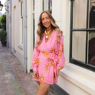 Dit elegante 'Sanne dress roze print' is een prachtige jurk met een overslagmodel en een levendige print van okergele zonnen op een roze ondergrond. De jurk heeft lange mouwen met smalle manchetten en een strikdetail aan de zijkant, wat zorgt voor een flatterende pasvorm. De V-halslijn maakt het een veelzijdig kledingstuk dat zowel casual als gekleed gedragen kan worden.