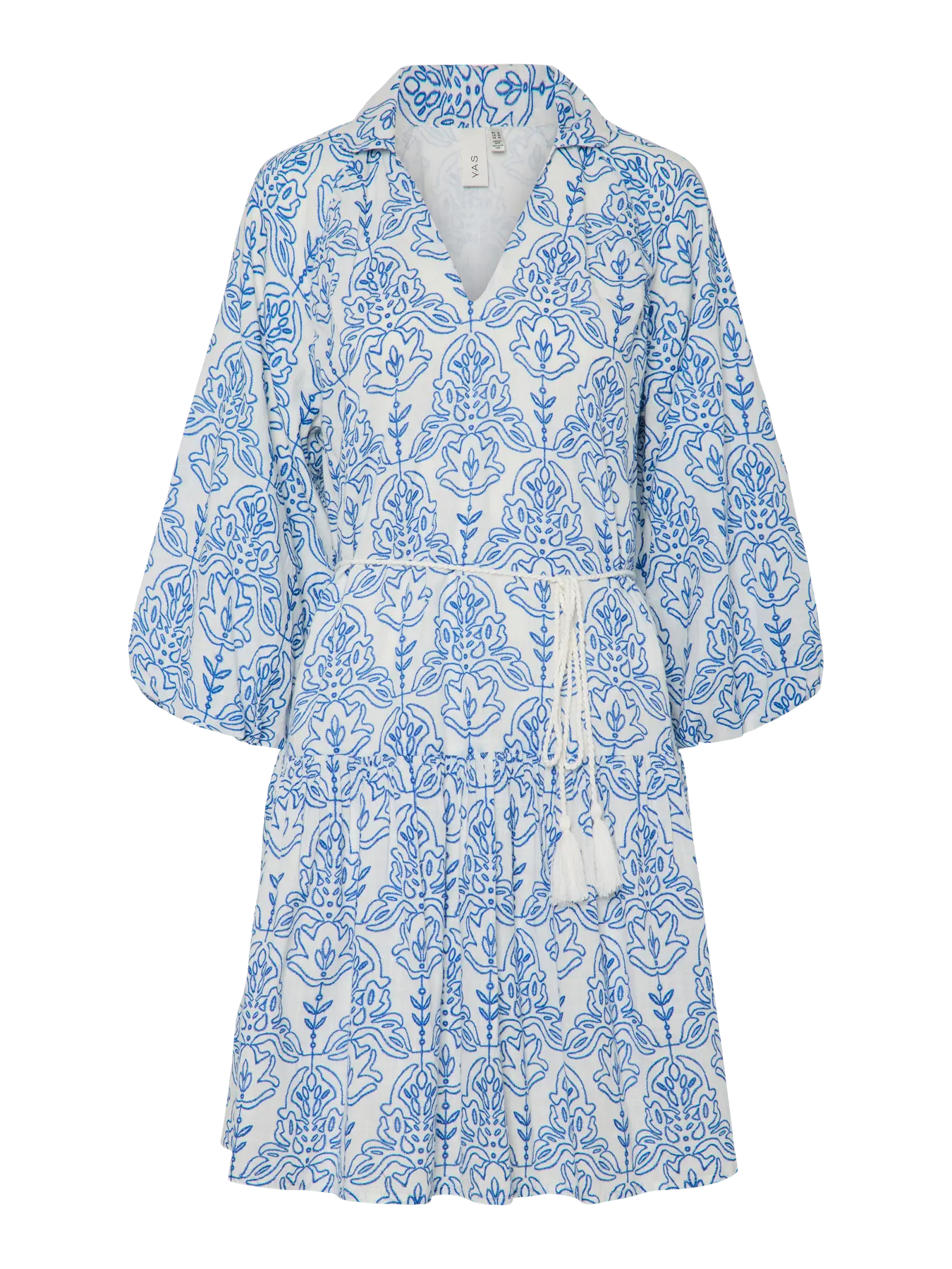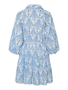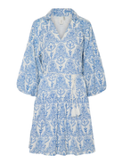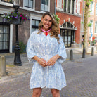 Deze prachtige jurk is een elegante en comfortabele jurk voor de zomer! Het witte dessin met blauwe, gedetailleerde patronen geeft de jurk een klassieke en toch frisse uitstraling. De jurk heeft een overhemdkraag en wordt geleverd met een bijpassende strikceintuur om de taille te accentueren.