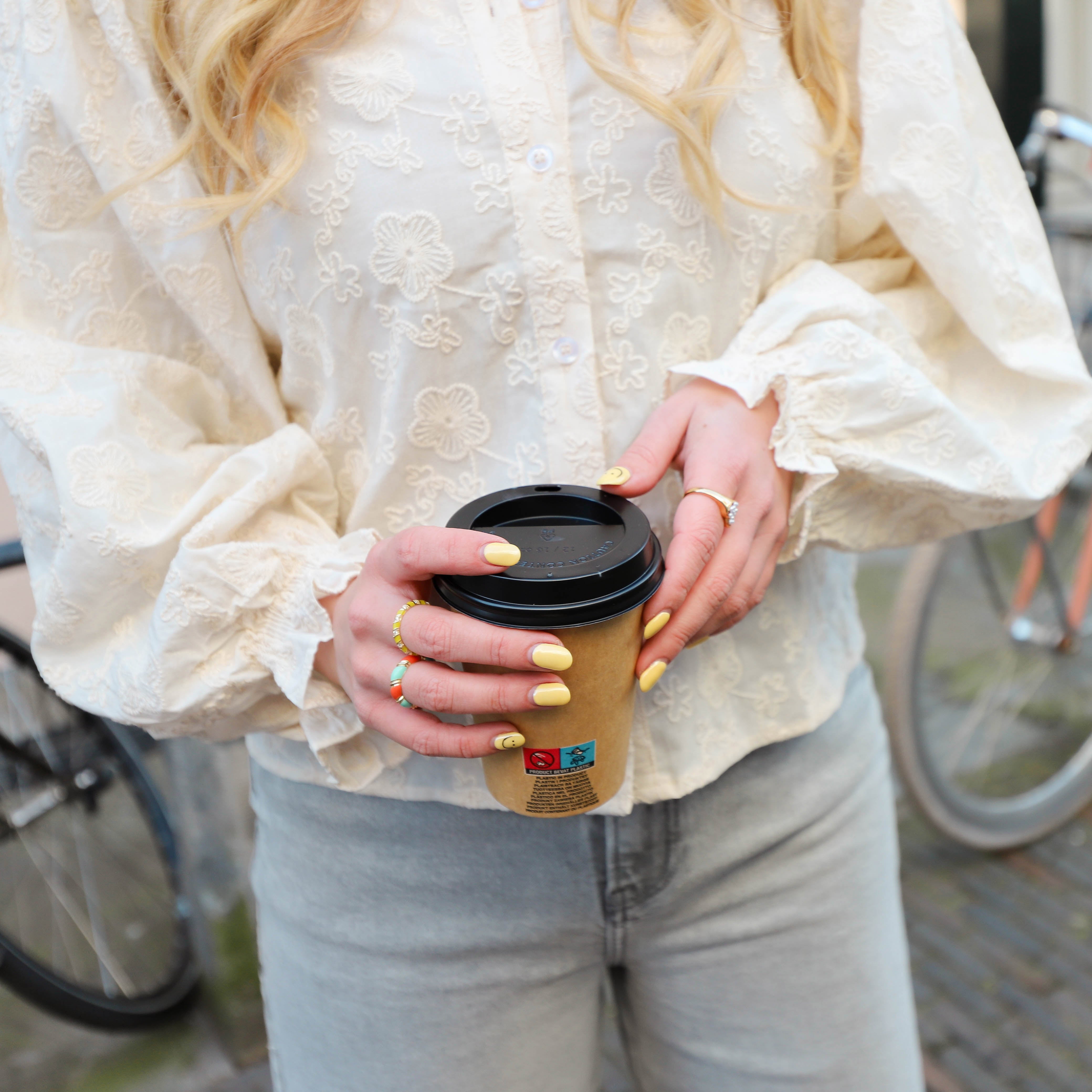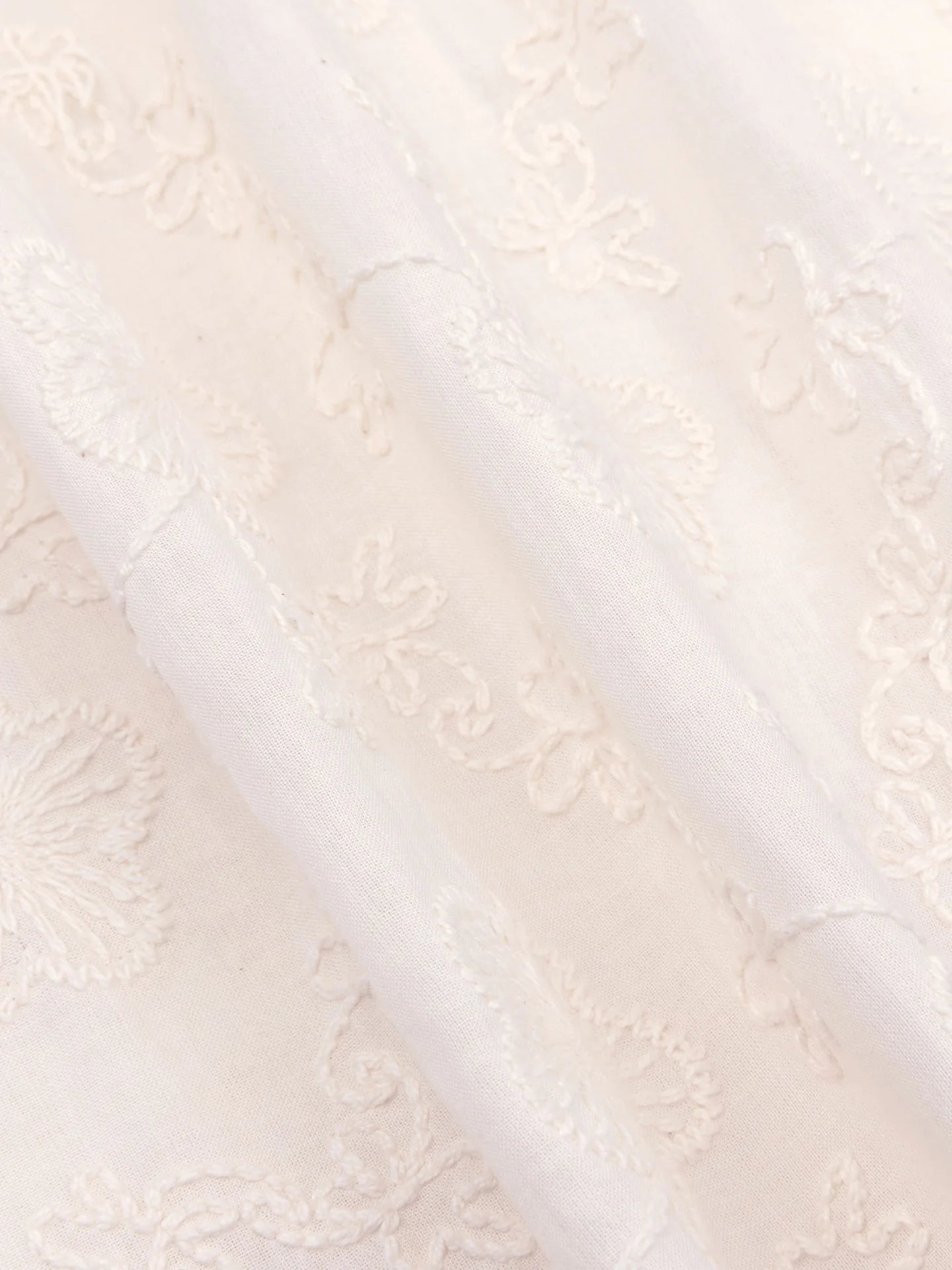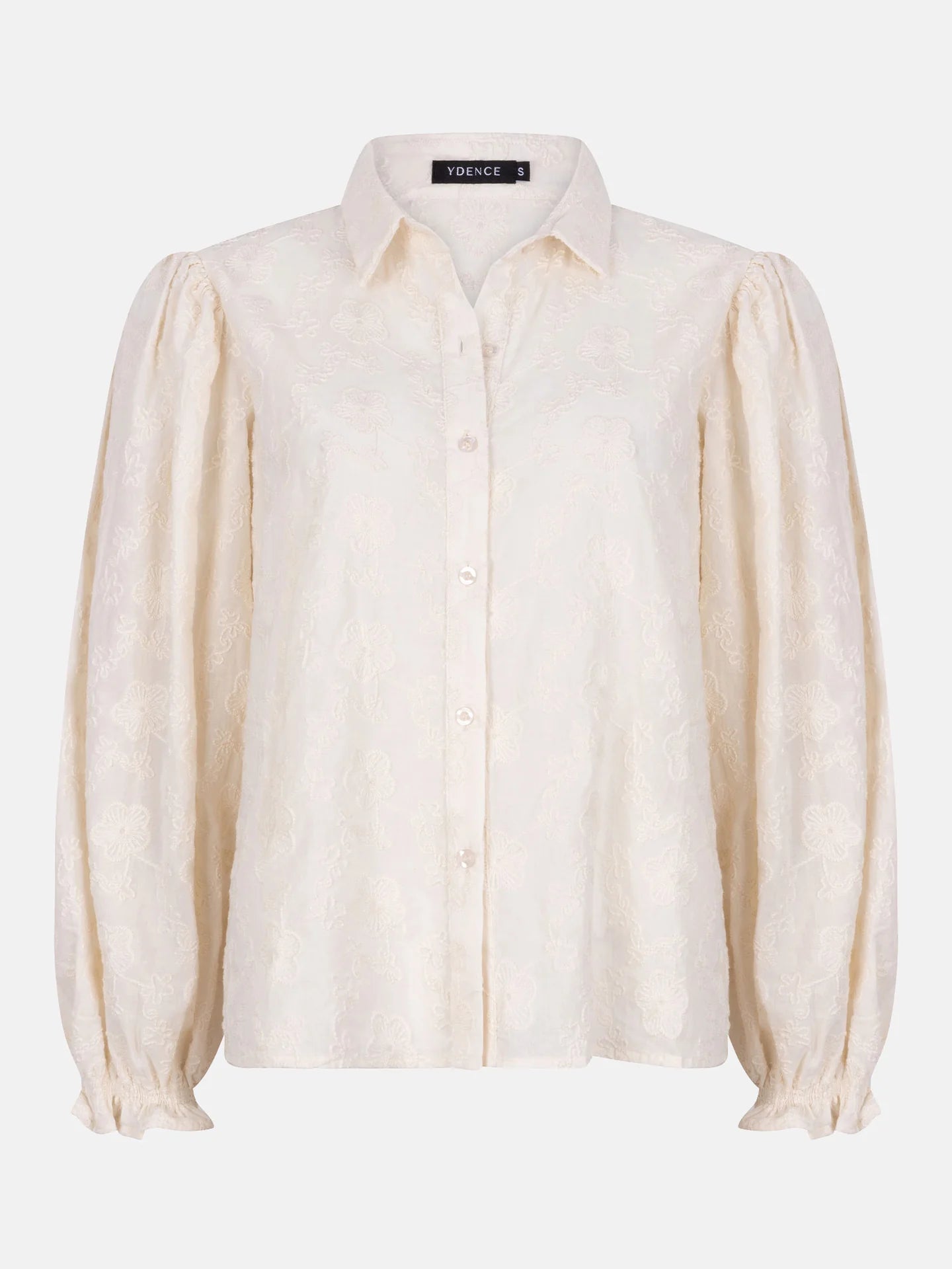 Blouse Novia is een blouse van semi-transparante stof in ecru met prachtige geborduurde bloemen. De blouse heeft een licht getailleerde pasvorm, pofmouwen met een klein rufflerandje, een kraagje en sluit met een knoopsluiting aan de voorzijde. Perfect voor een elegante en vrouwelijke uitstraling!