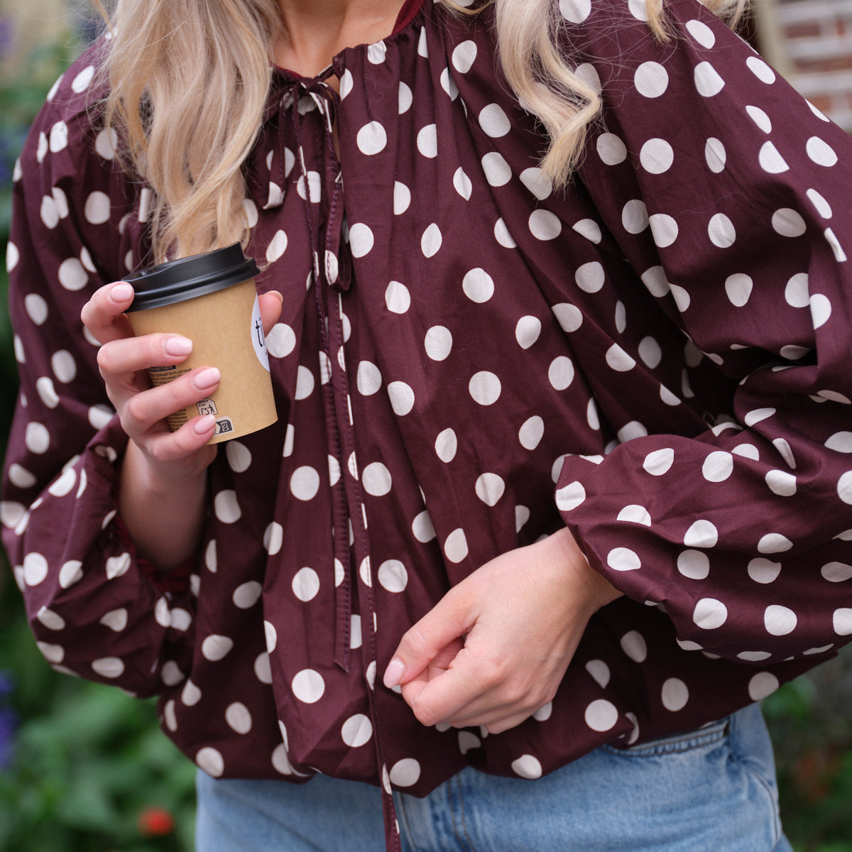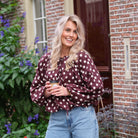 Deze Charlotte Top is een speelse en elegante blouse met een unieke pasvorm. De top is uitgevoerd in een diepe bordeauxrode kleur met een opvallend, all-over wit stippenpatroon. De soepelvallende stof, de wijd uitlopende mouwen en de elastische boord aan de onderkant geven de top een ballonachtig silhouet. De ronde halslijn met strikdetail maakt de vrouwelijke look compleet.