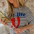 Dit zwart-wit gestreepte T-shirt is een echte eyecatcher met zijn speelse "Hot Life" print, compleet met twee rode pepers. De combinatie van de klassieke strepen en de opvallende print geeft dit shirt een unieke en trendy uitstraling. Perfect voor een relaxte dag of een casual uitje.