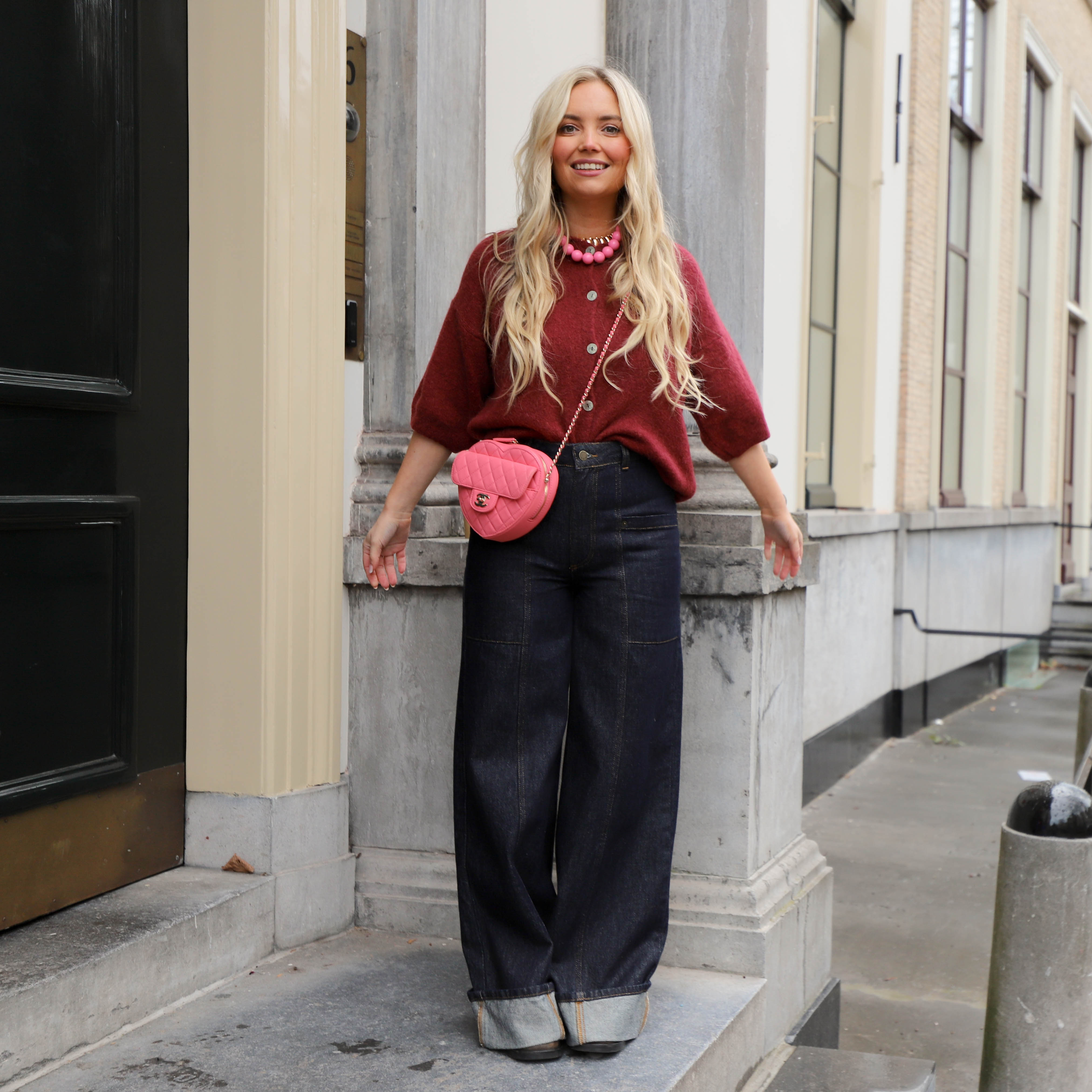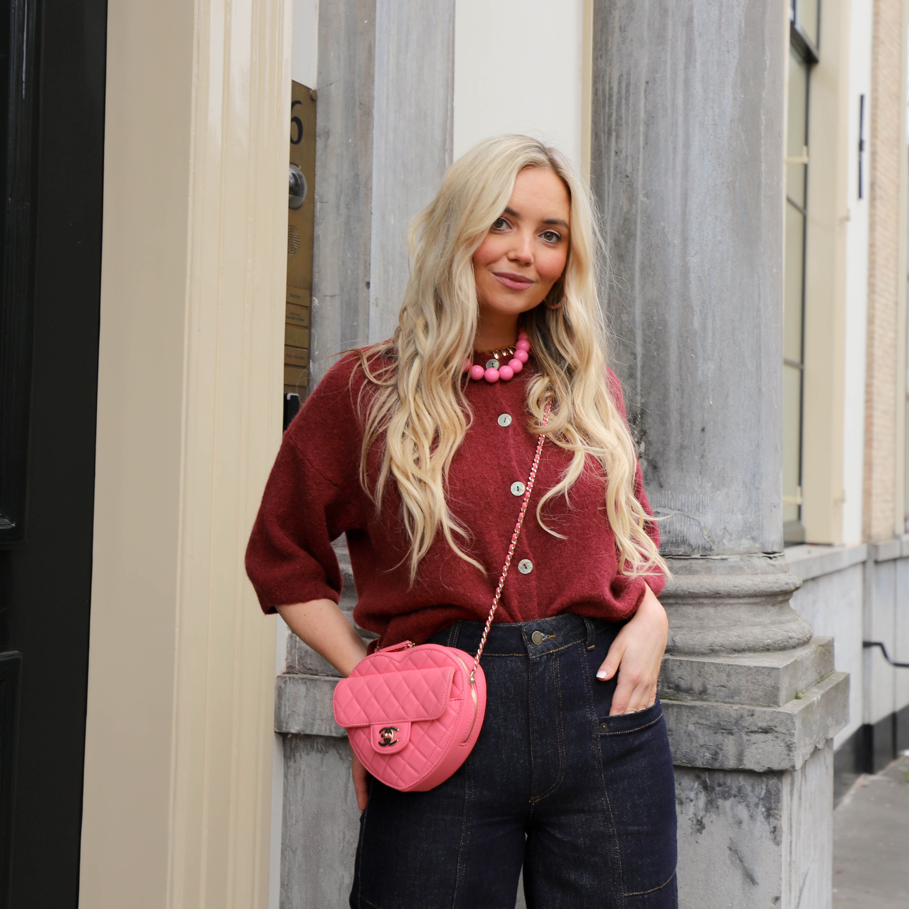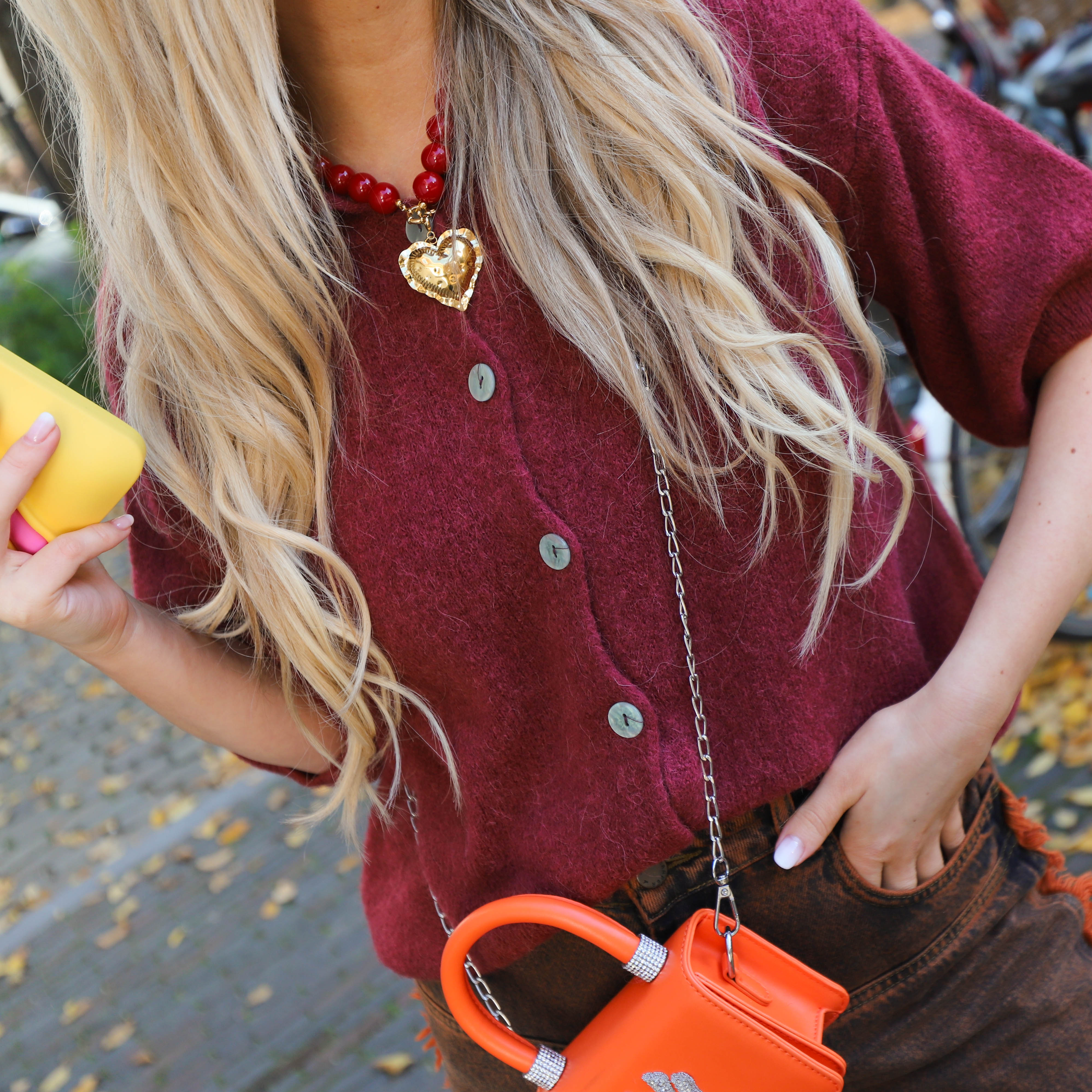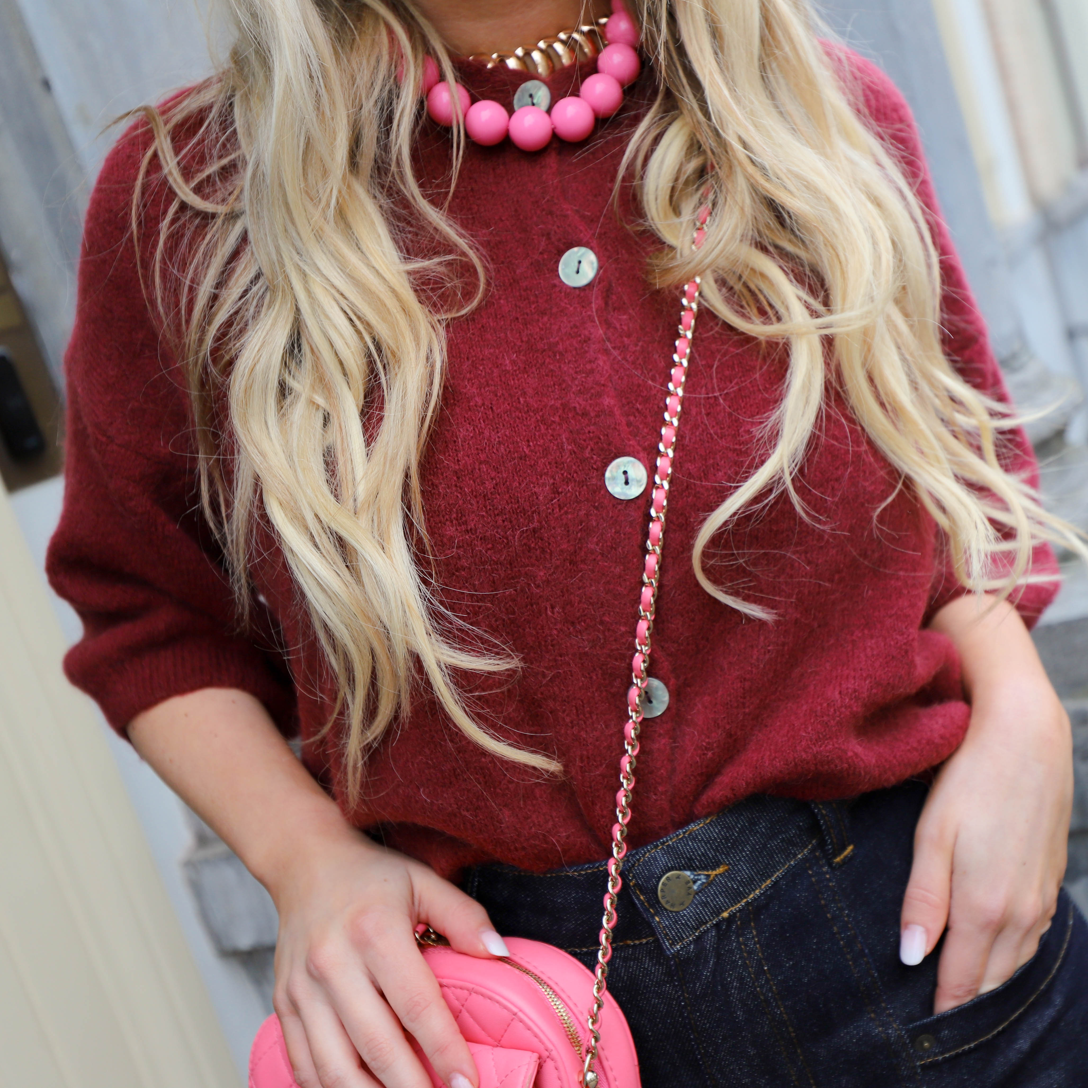 Dit Jackie Vest is een chique en zachte toevoeging aan je knitwear collectie. Het vest is gemaakt van een harige, gebreide stof in een diepe bordeauxrode kleur en heeft een klassieke kraag en een sluiting met subtiele knoopjes.