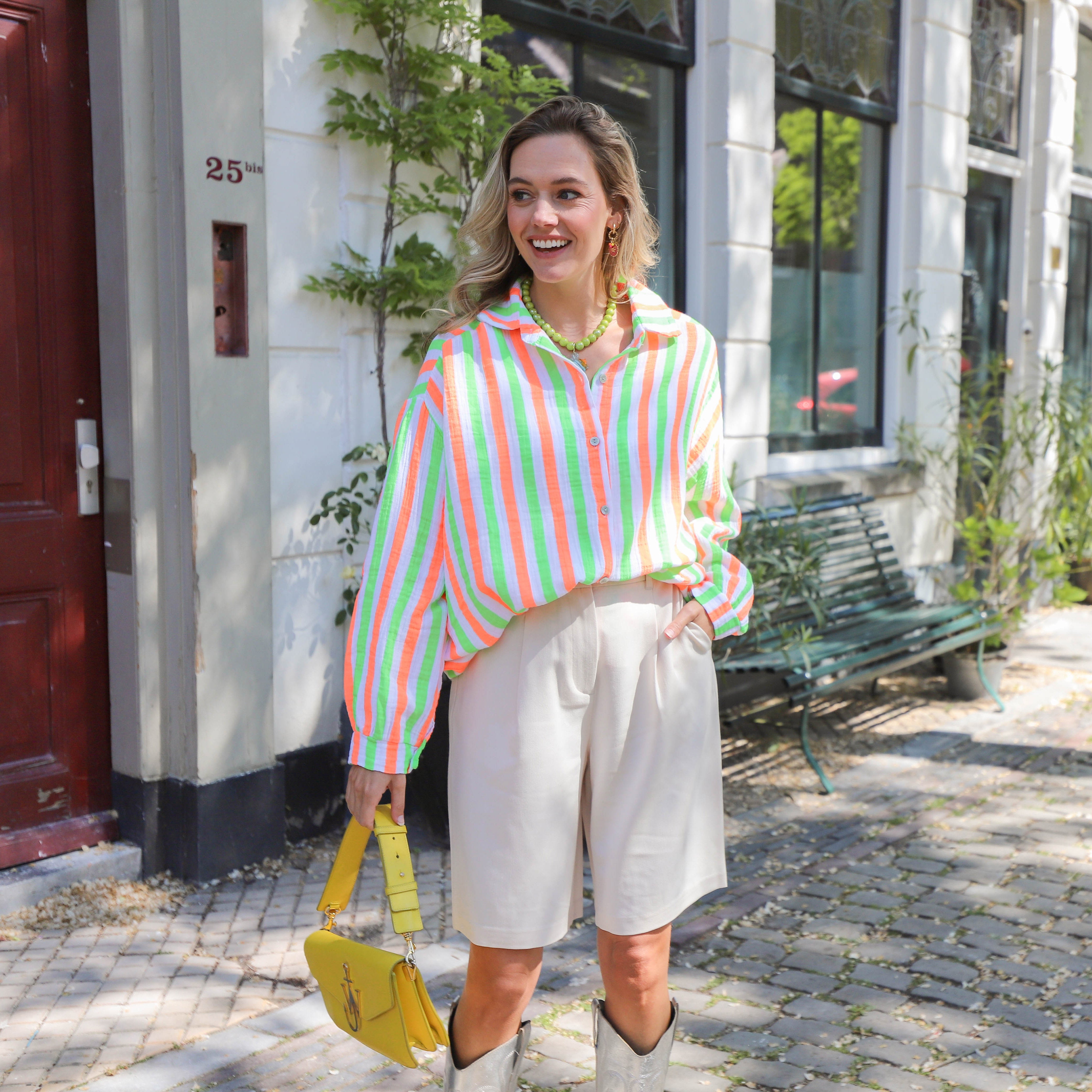 Deze vrolijke mousseline blouse met oranje en groene strepen is een echte zomerse must-have! De verticale strepen in heldere neon tinten geven de blouse een energieke en speelse uitstraling. De luchtige mousseline stof voelt zacht aan op de huid en is perfect voor warme dagen. De blouse heeft een klassieke kraag, lange mouwen en een knoopsluiting aan de voorkant. De relaxed fit zorgt voor een comfortabele en nonchalante look.