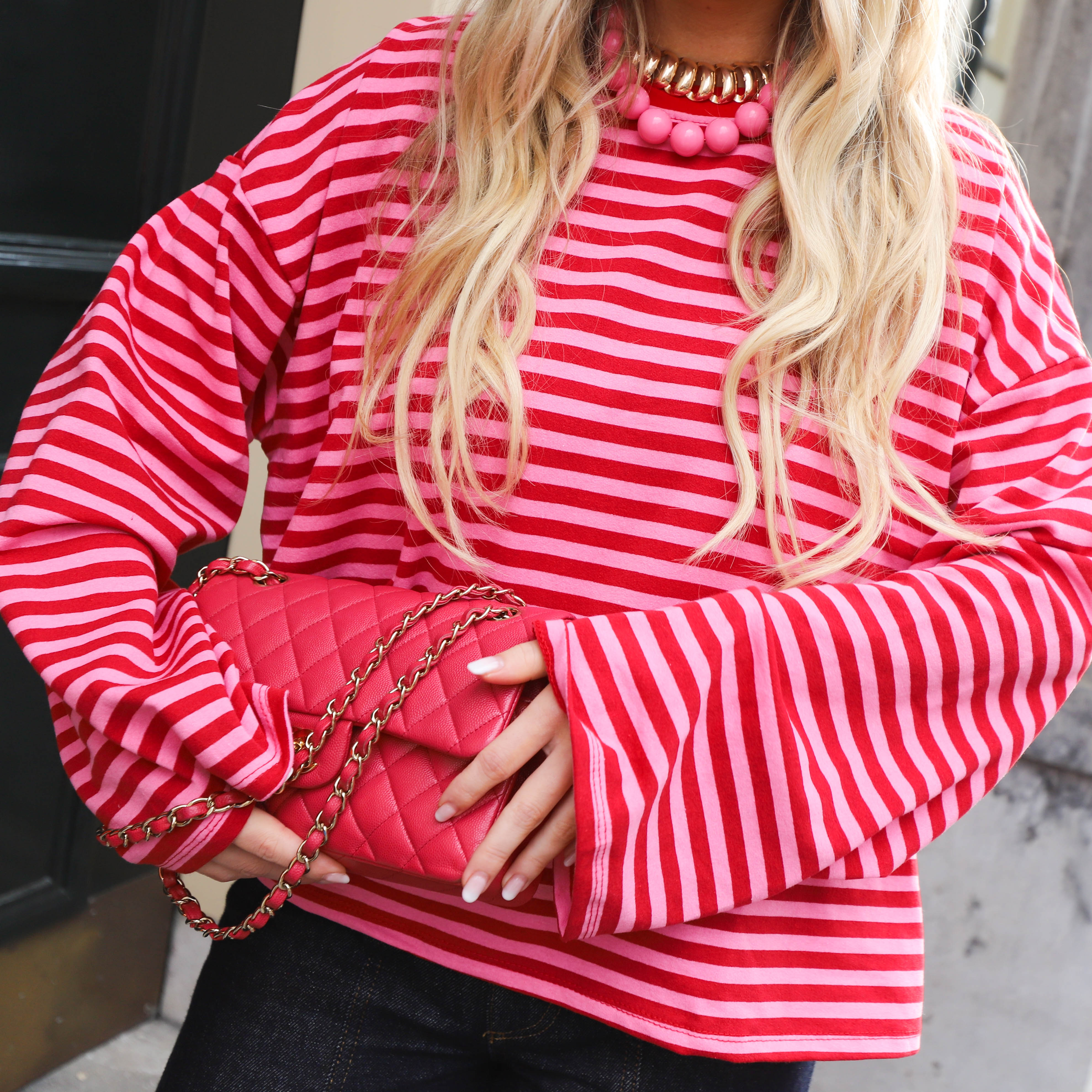 De top heeft een ruime, oversized pasvorm, een ronde hals en lange mouwen.