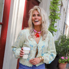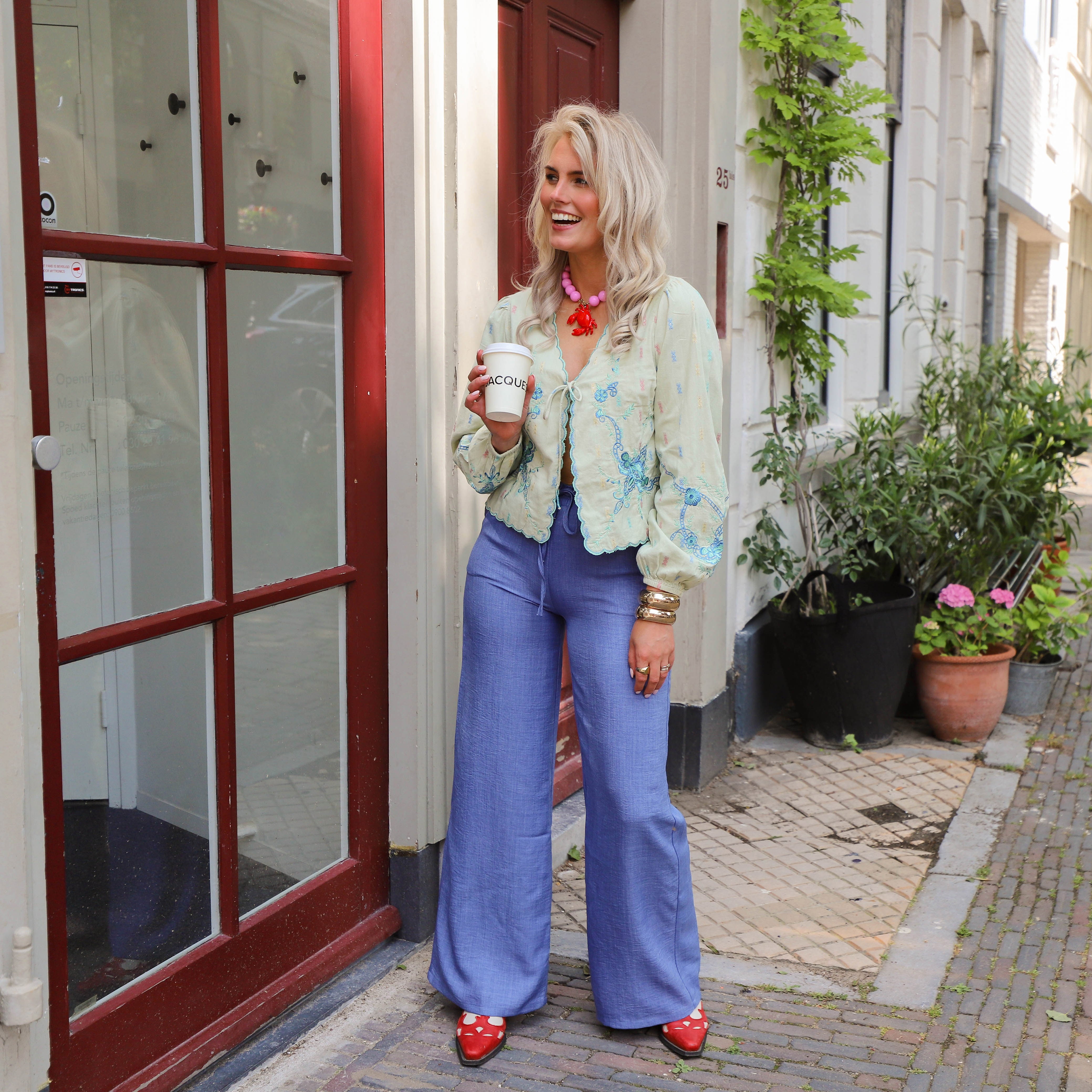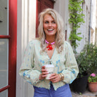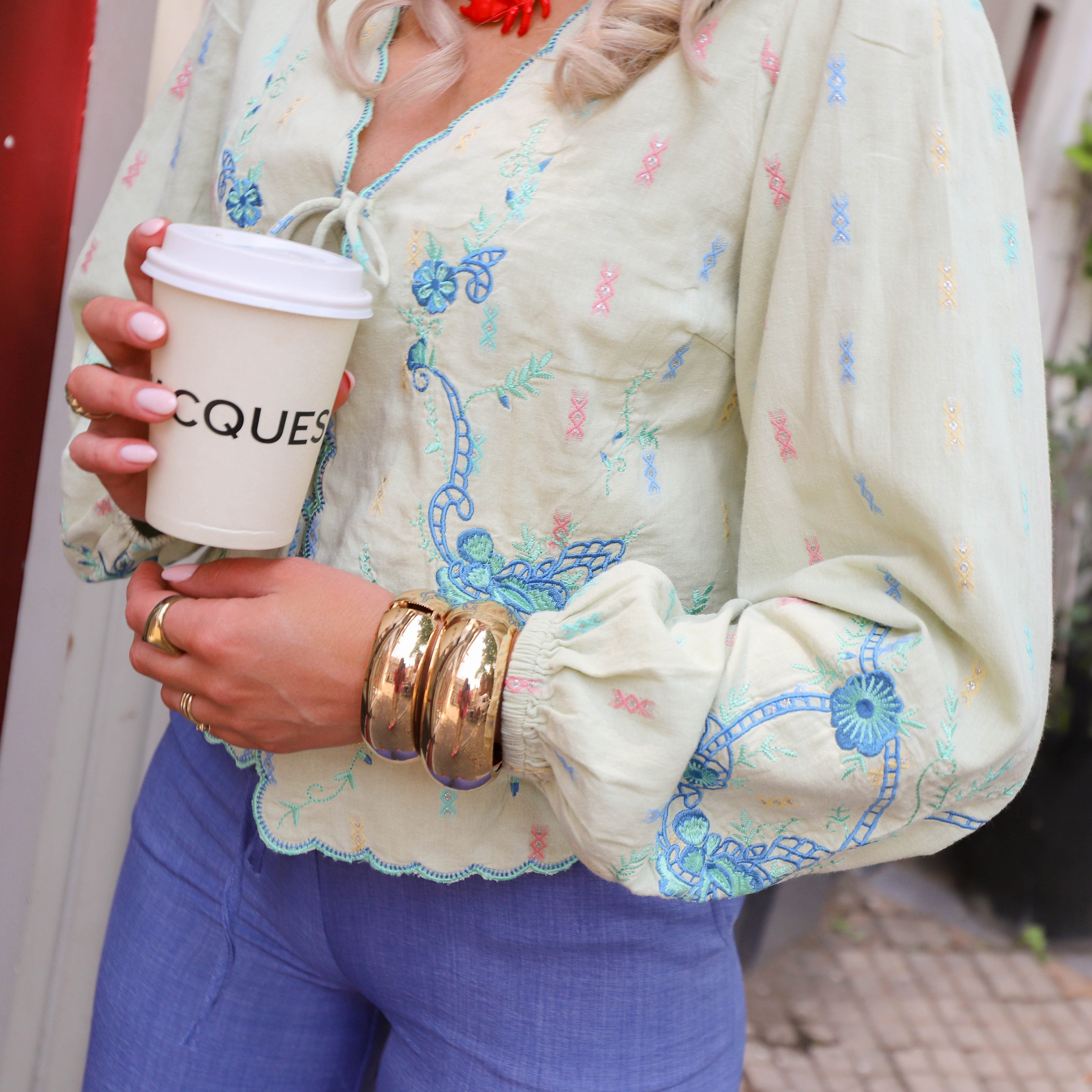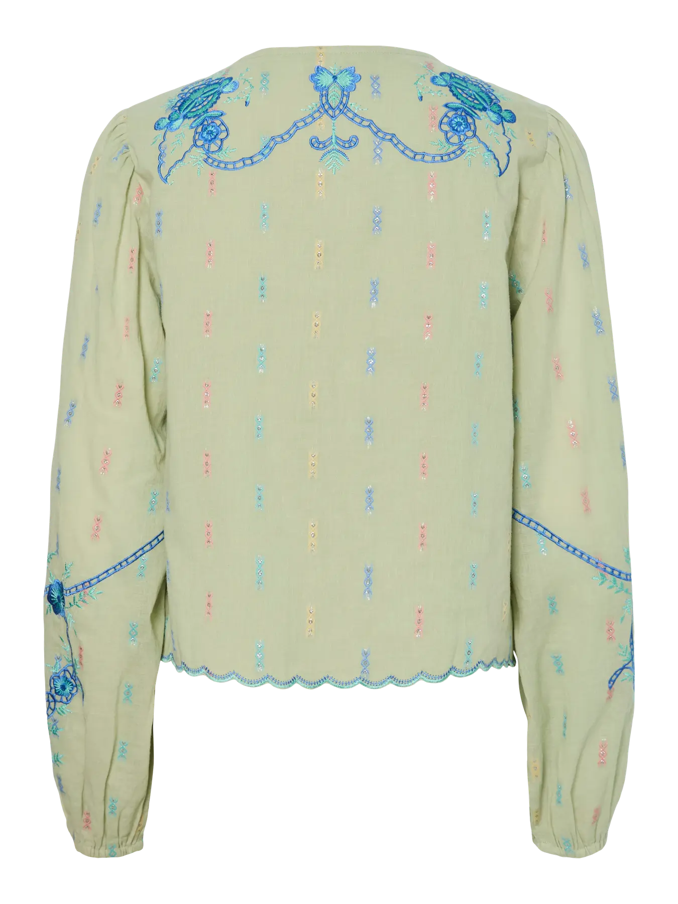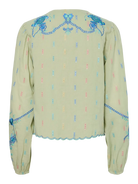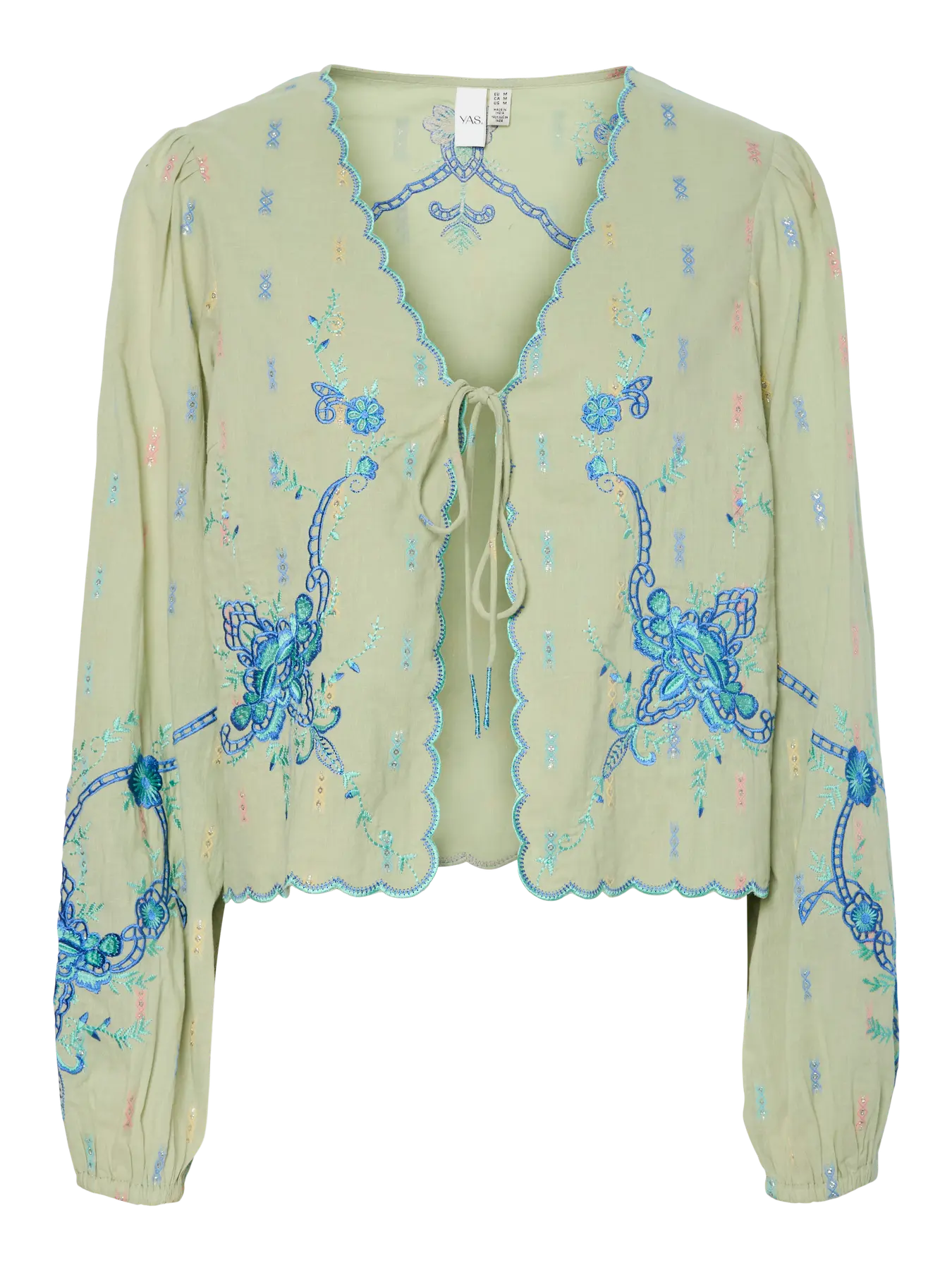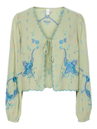 Dit prachtige, lichte vestje in een zachte mintgroene tint is rijkelijk versierd met gedetailleerde borduursels in blauw, roze en geel, wat zorgt voor een romantische en artistieke uitstraling. De V-halslijn met geschulpte randen en de striksluiting aan de voorzijde geven het vestje een speelse touch. De lange mouwen met elastische boorden voegen een vleugje volume toe.