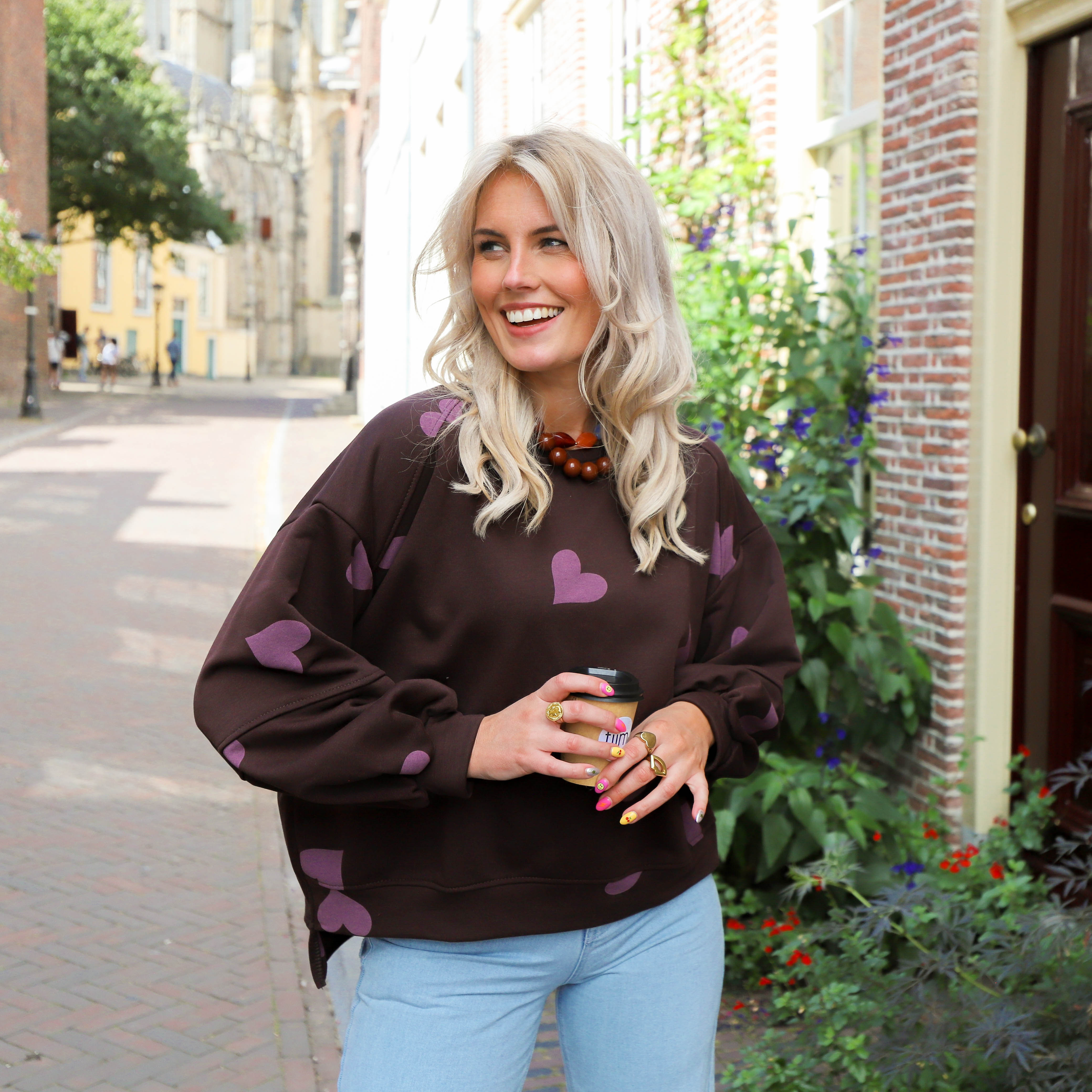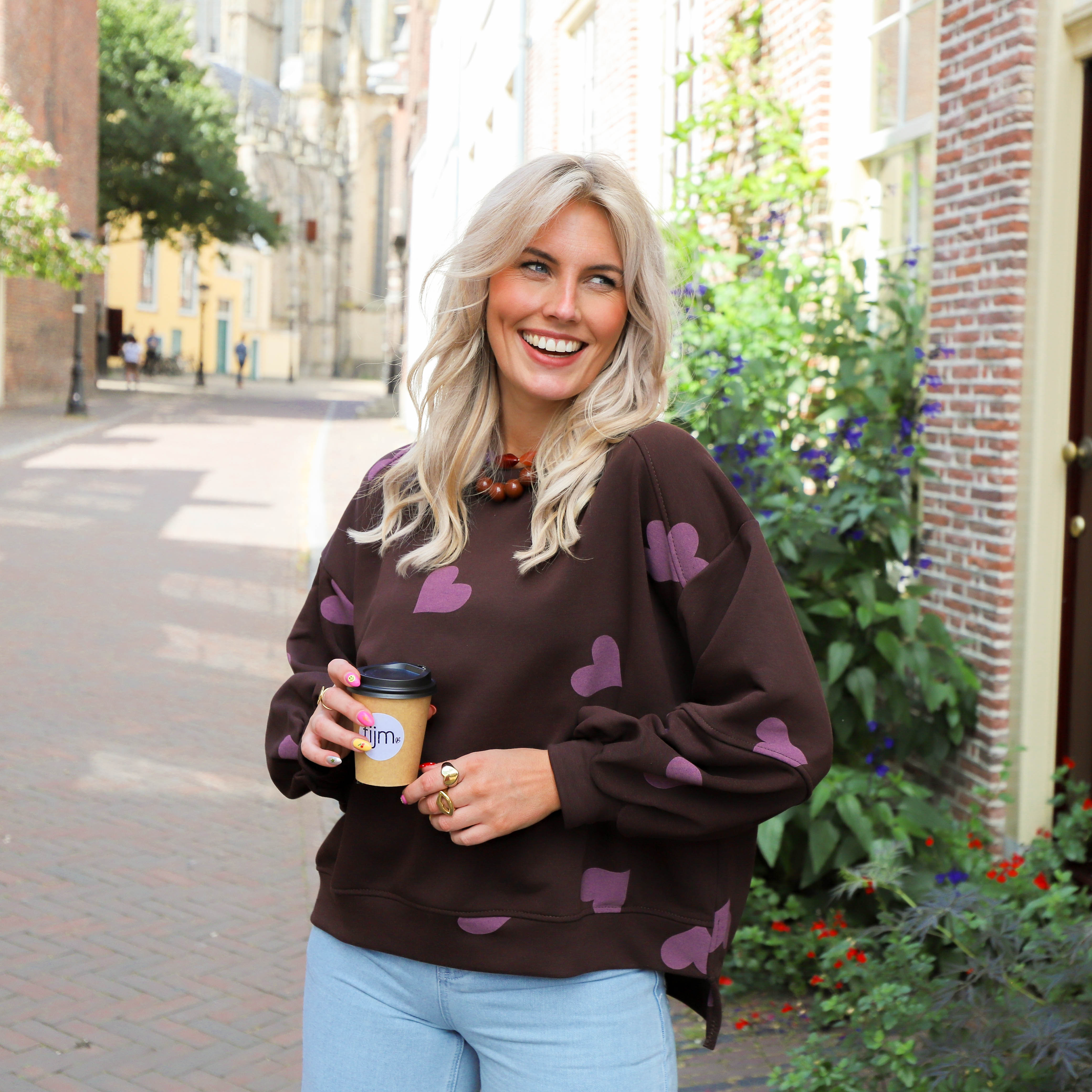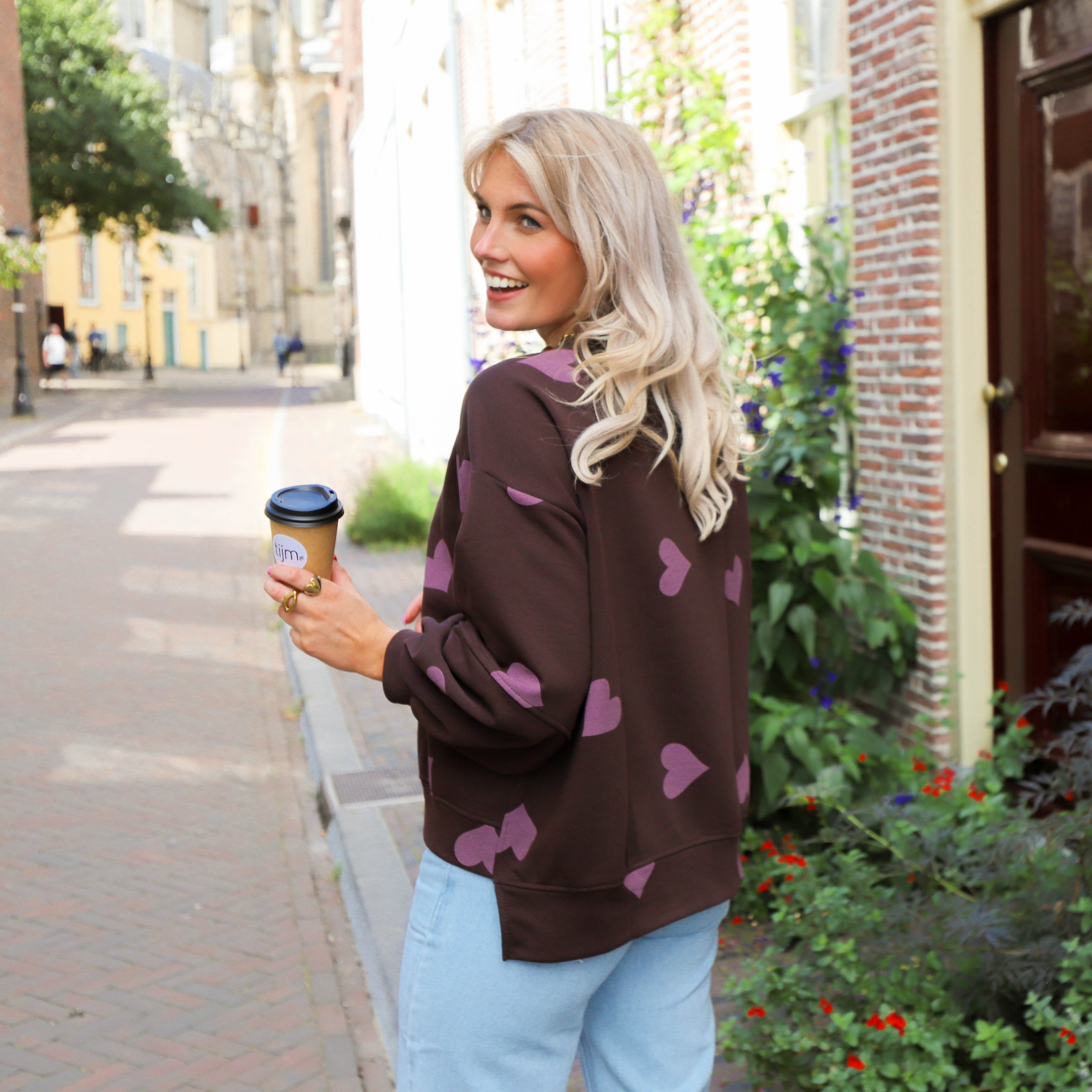 Deze bruine sweater met paarse hartjes is een vrolijke toevoeging aan je kledingkast. De sweater heeft een zachte binnenkant en een oversized pasvorm, waardoor hij heerlijk comfortabel zit. De brede boorden bij de mouwen en de onderkant zorgen voor een goede pasvorm.