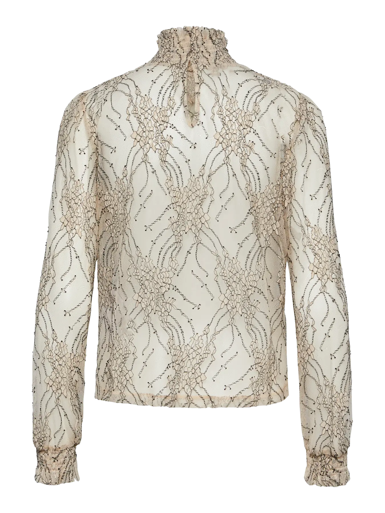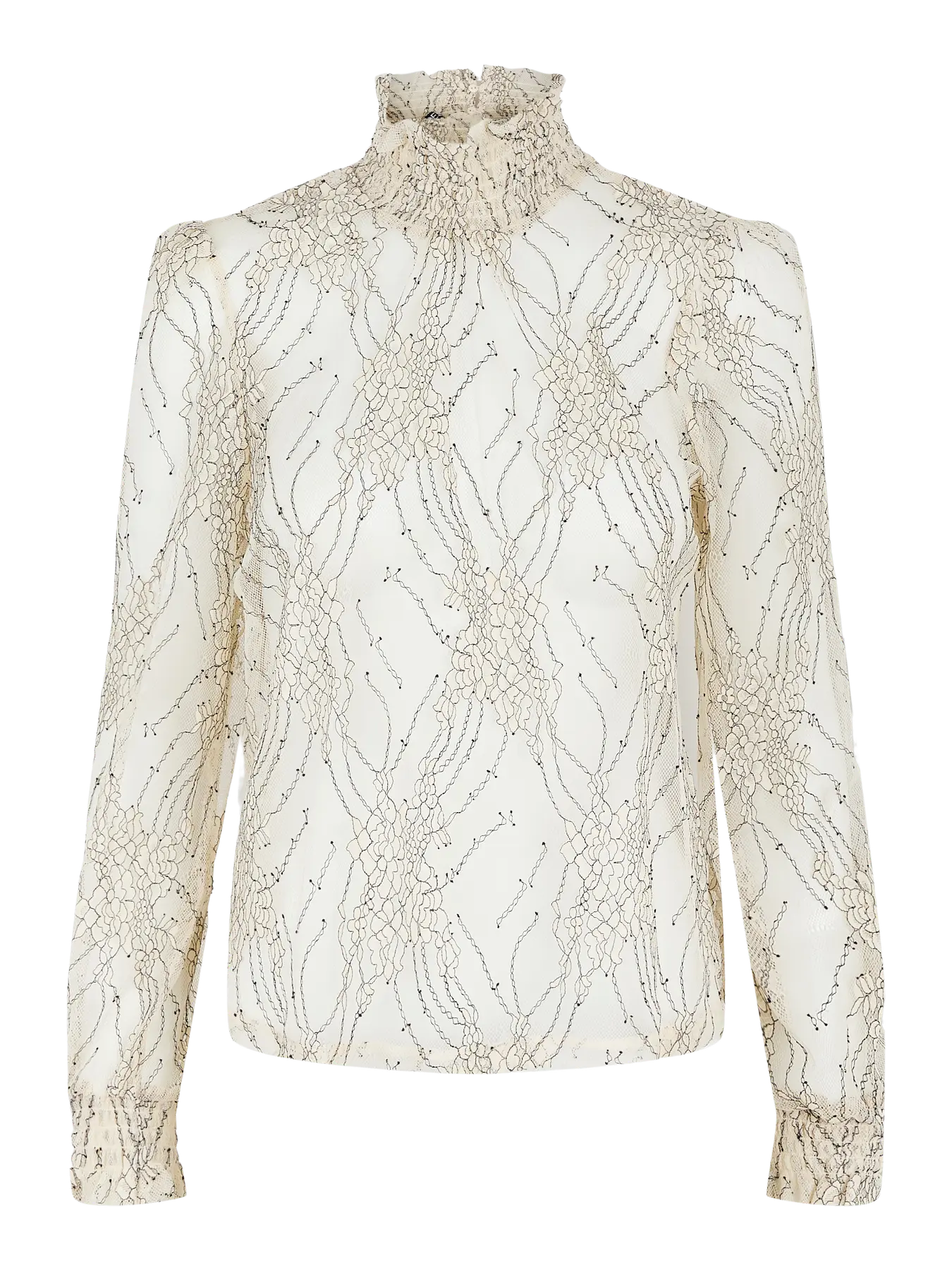 Deze pc Kylie Ls Lace Top is een elegante en romantische top, perfect voor een verfijnde layering look. De top is gemaakt van prachtig crèmekleurig kant met een bloemendessin en heeft een semi-transparante afwerking. De hoge, geplooide kraag en de elastische ruches aan de manchetten geven deze top een klassieke, vrouwelijke uitstraling.