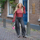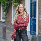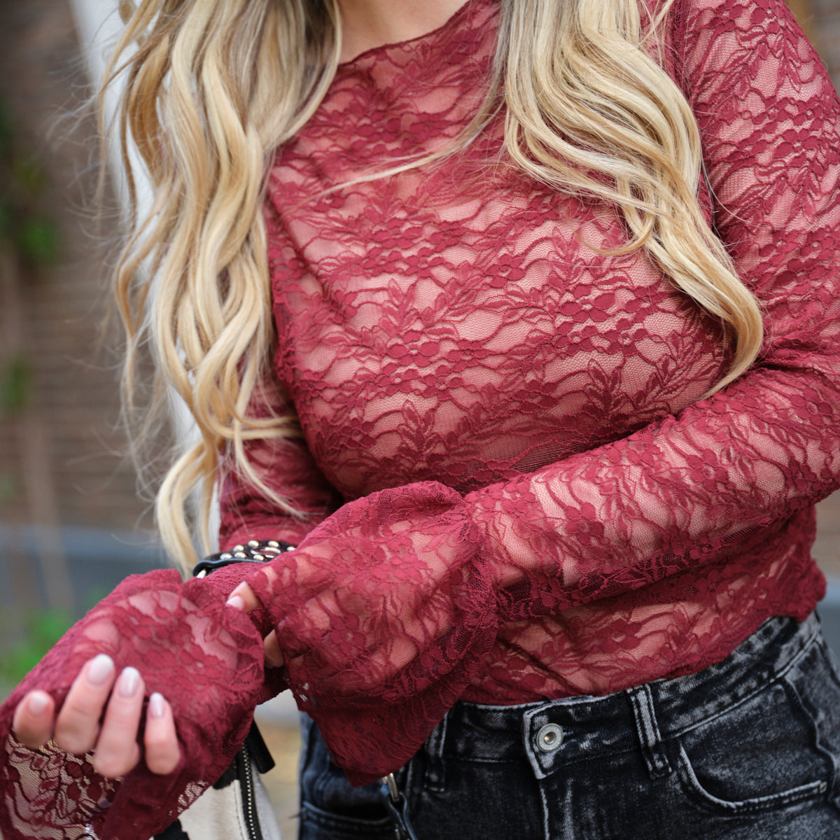 Deze Lily Lace Top is een vrouwelijke top, perfect voor een avondlook. De top is volledig gemaakt van prachtig bordeauxrood kant en heeft een semi-transparante afwerking. De lange mouwen lopen uit in speelse trompetmouwen met een ruchesdetail bij de pols. De ronde hals en de aansluitende pasvorm maken deze top een elegante basis voor elke outfit.